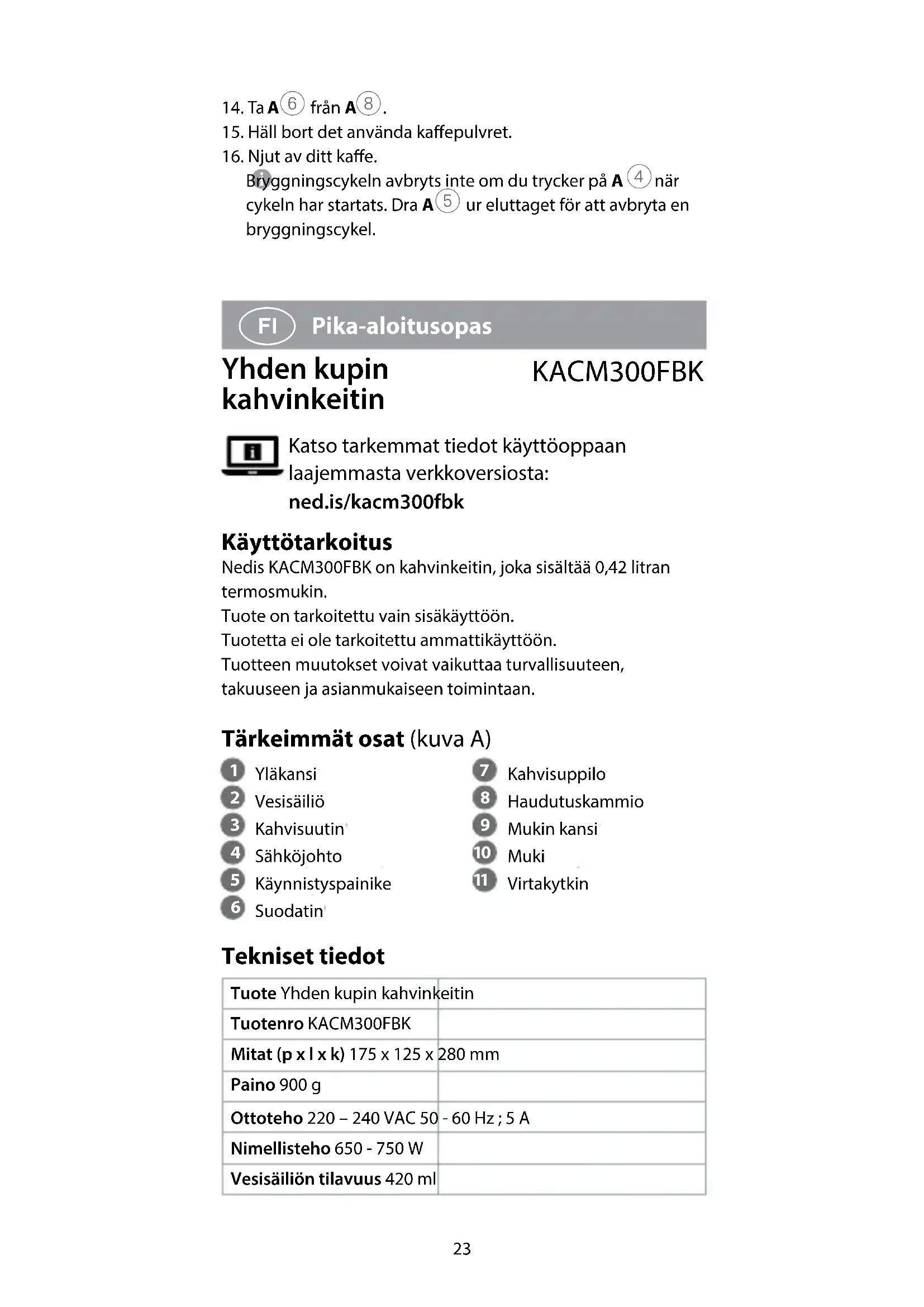Pika-aloitusopas Yhden kupin kahvinkeitin KACM300FBK Katso tarkemmat tiedot käyttöoppaan laajemmasta verkkoversiosta: ned.is/kacm300fbk Käyttötarkoitus Nedis KACM300FBK on kahvinkeitin, joka sisältää 0,42 litran termosmukin.Tuote on tarkoitettu vain sisäkäyttöön.Tuotetta ei ole tarkoitettu ammattikäyttöön.Tuotteen muutokset voivat vaikuttaa turvallisuuteen, takuuseen ja asianmukaiseen toimintaan. Tärkeimmät osat (kuva A)