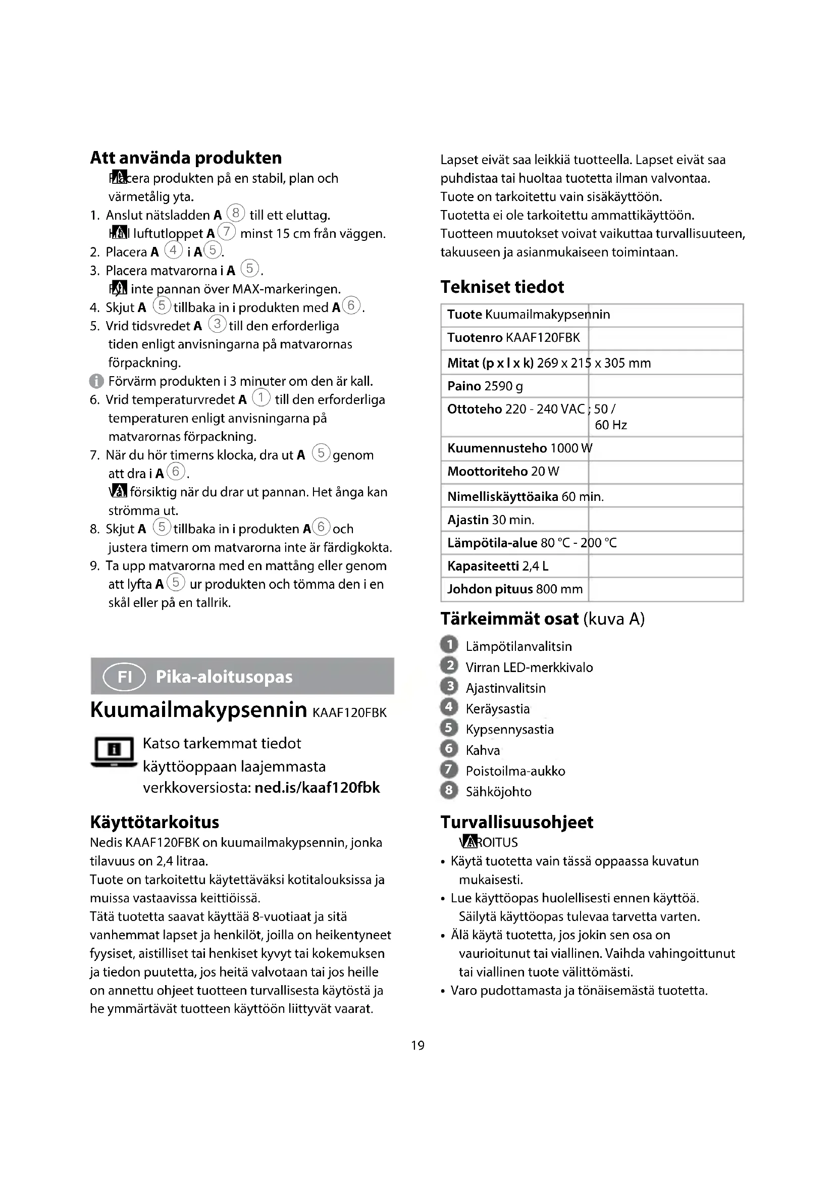 Pika-aloitusopas Kuumailmakypsennin KAAF120FBK Katso tarkemmat tiedot käyttöoppaan laajemmasta verkkoversiosta: ned.is/kaaf120fbk Käyttötarkoitus Nedis KAAF120FBK on kuumailmakypsennin, jonka tilavuus on 2,4 litraa.Tuote on tarkoitettu käytettäväksi kotitalouksissa ja muissa vastaavissa keittiöissä.Tätä tuotetta saavat käyttää 8-vuotiaat ja sitä vanhemmat lapset ja henkilöt, joilla on heikentyneet fyysiset, aistilliset tai henkiset kyvyt tai kokemuksen ja tiedon puutetta, jos heitä valvotaan tai jos heille on annettu ohjeet tuotteen turvallisesta käytöstä ja he ymmärtävät tuotteen käyttöön liittyvät vaarat.20
