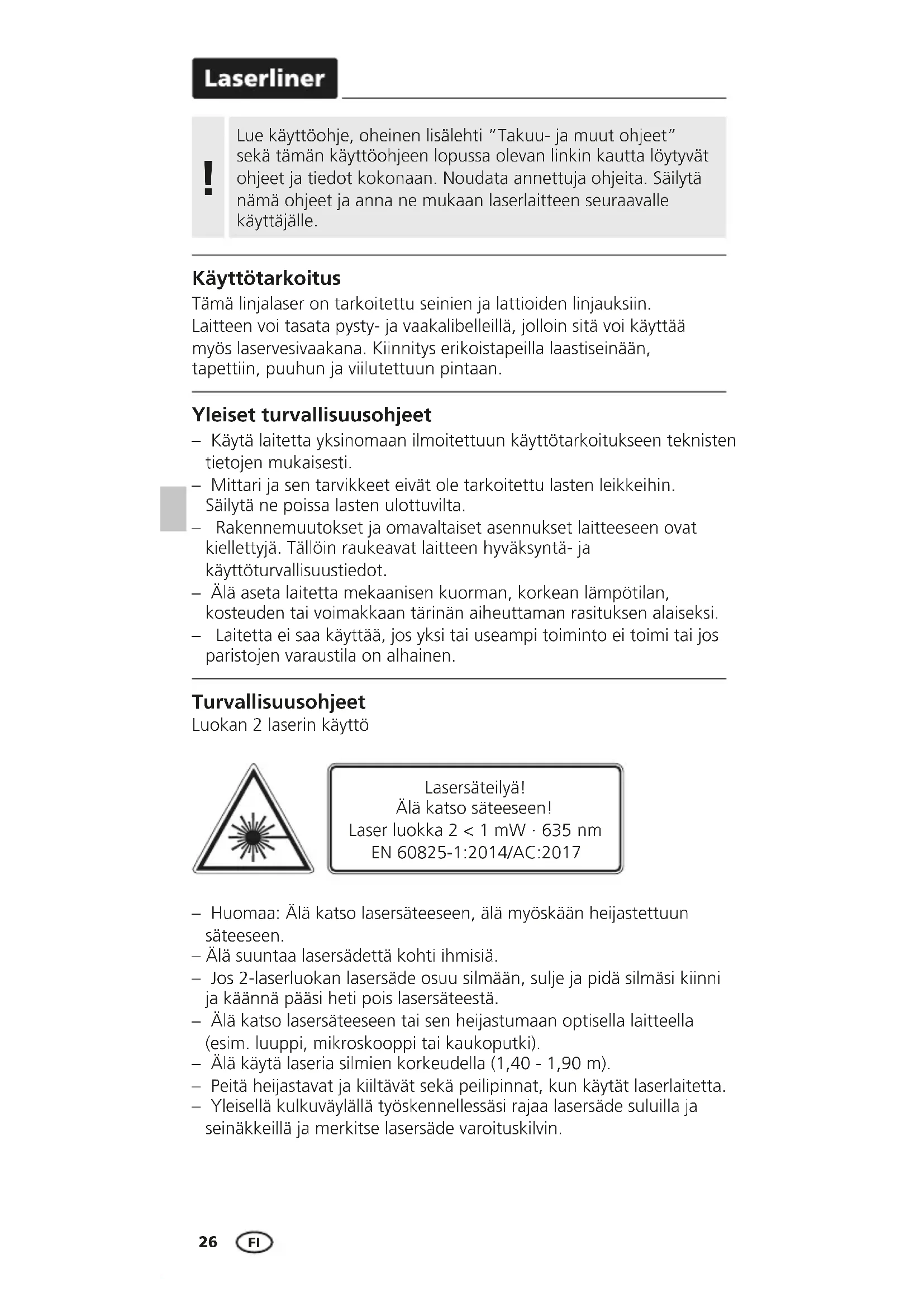 Lue käyttöohje, oheinen lisälehti ”Takuu- ja muut ohjeet” sekä tämän käyttöohjeen lopussa olevan linkin kautta löytyvät ohjeet ja tiedot kokonaan. Noudata annettuja ohjeita. Säilytä nämä ohjeet ja anna ne mukaan laserlaitteen seuraavalle käyttäjälle.