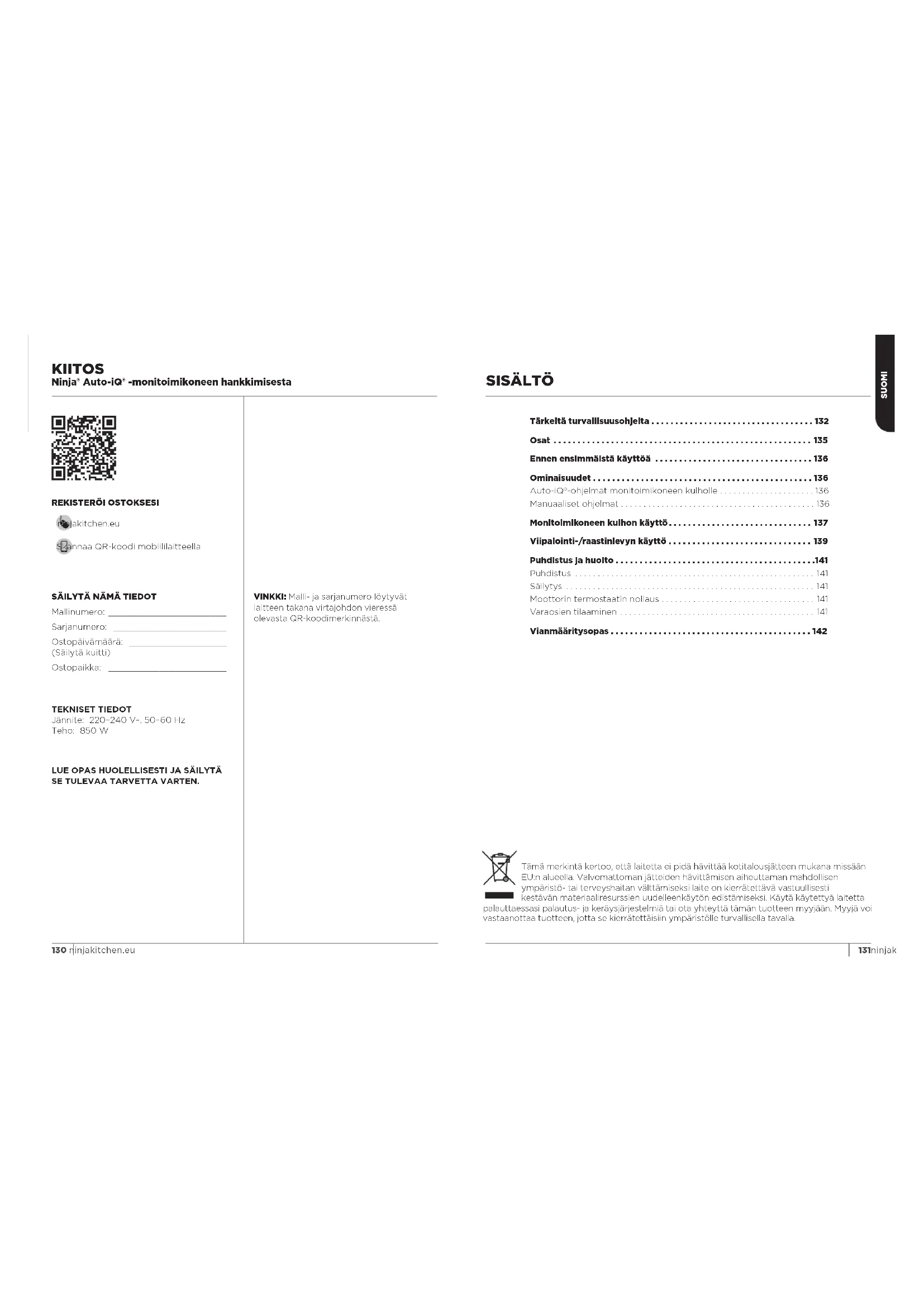 ninjakitchen.eu Skannaa QR-koodi mobiililaitteella Tämä merkintä kertoo, että laitetta ei pidä hävittää kotitalousjätteen mukana missään EU:n alueella. Valvomattoman jätteiden hävittämisen aiheuttaman mahdollisen ympäristö- tai terveyshaitan välttämiseksi laite on kierrätettävä vastuullisesti kestävän materiaaliresurssien uudelleenkäytön edistämiseksi. Käytä käytettyä laitetta palauttaessasi palautus- ja keräysjärjestelmiä tai ota yhteyttä tämän tuotteen myyjään. Myyjä voi vastaanottaa tuotteen, jotta se kierrätettäisiin ympäristölle turvallisella tavalla.133ninjakitchen.eu 132 ninjakitchen.eu