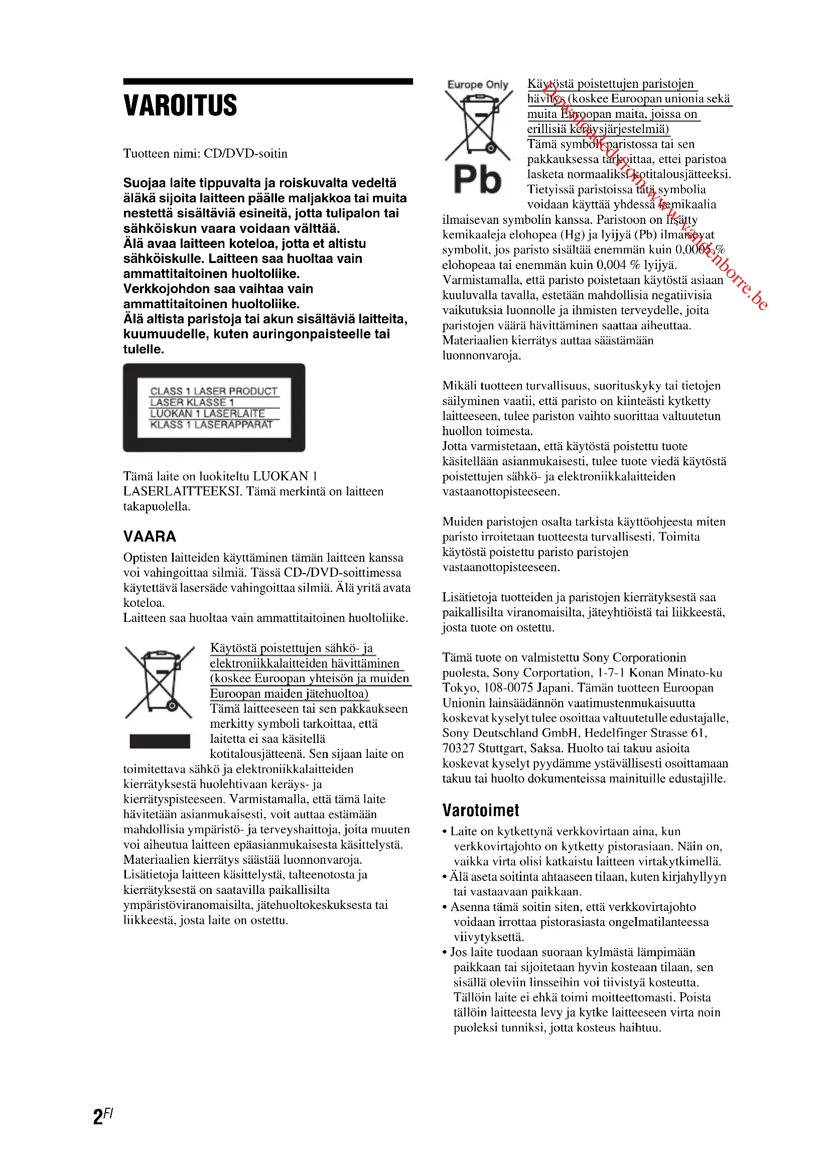 VAROITUS Tuotteen nimi: CD/DVD-soitinSuojaa laite tippuvalta ja roiskuvalta vedeltä äläkä sijoita laitteen päälle maljakkoa tai muita nestettä sisältäviä esineitä, jotta tulipalon tai sähköiskun vaara voidaan välttää.Älä avaa laitteen koteloa, jotta et altistu sähköiskulle. Laitteen saa huoltaa vain ammattitaitoinen huoltoliike.Verkkojohdon saa vaihtaa vain ammattitaitoinen huoltoliike.Älä altista paristoja tai akun sisältäviä laitteita, kuumuudelle, kuten auringonpaisteelle tai tulelle.Tämä laite on luokiteltu LUOKAN 1 LASERLAITTEEKSI. Tämä merkintä on laitteen takapuolella. VAARA Optisten laitteiden käyttäminen tämän laitteen kanssa voi vahingoittaa silmiä. Tässä CD-/DVD-soittimessa käytettävä lasersäde vahingoittaa silmiä. Älä yritä avata koteloa.Laitteen saa huoltaa vain ammattitaitoinen huoltoliike.Käytöstä poistettujen sähkö- ja elektroniikkalaitteiden hävittäminen (koskee Euroopan yhteisön ja muiden Euroopan maiden jätehuoltoa)Tämä laitteeseen tai sen pakkaukseen merkitty symboli tarkoittaa, että laitetta ei saa käsitellä kotitalousjätteenä. Sen sijaan laite on toimitettava sähkö ja elektroniikkalaitteiden kierrätyksestä huolehtivaan keräys- ja kierrätyspisteeseen. Varmistamalla, että tämä laite hävitetään asianmukaisesti, voit auttaa estämään mahdollisia ympäristö- ja terveyshaittoja, joita muuten voi aiheutua laitteen epäasianmukaisesta käsittelystä. Materiaalien kierrätys säästää luonnonvaroja. Lisätietoja laitteen käsittelystä, talteenotosta ja kierrätyksestä on saatavilla paikallisilta ympäristöviranomaisilta, jätehuoltokeskuksesta tai liikkeestä, josta laite on ostettu.Käytöstä poistettujen paristojen hävitys (koskee Euroopan unionia sekä muita Euroopan maita, joissa on erillisiä keräysjärjestelmiä)Tämä symboli paristossa tai sen pakkauksessa tarkoittaa, ettei paristoa lasketa normaaliksi kotitalousjätteeksi.Tietyissä paristoissa tätä symbolia voidaan käyttää yhdessä kemikaalia ilmaisevan symbolin kanssa. Paristoon on lisätty kemikaaleja elohopea (Hg) ja lyijyä (Pb) ilmaisevat symbolit, jos paristo sisältää enemmän kuin 0,0005 % elohopeaa tai enemmän kuin 0,004 % lyijyä.Varmistamalla, että paristo poistetaan käytöstä asiaan kuuluvalla tavalla, estetään mahdollisia negatiivisia vaikutuksia luonnolle ja ihmisten terveydelle, joita paristojen väärä hävittäminen saattaa aiheuttaa. Materiaalien kierrätys auttaa säästämään luonnonvaroja.Mikäli tuotteen turvallisuus, suorituskyky tai tietojen säilyminen vaatii, että paristo on kiinteästi kytketty laitteeseen, tulee pariston vaihto suorittaa valtuutetun huollon toimesta.Jotta varmistetaan, että käytöstä poistettu tuote käsitellään asianmukaisesti, tulee tuote viedä käytöstä poistettujen sähkö- ja elektroniikkalaitteiden vastaanottopisteeseen.Muiden paristojen osalta tarkista käyttöohjeesta miten paristo irroitetaan tuotteesta turvallisesti. Toimita käytöstä poistettu paristo paristojen vastaanottopisteeseen.Lisätietoja tuotteiden ja paristojen kierrätyksestä saa paikallisilta viranomaisilta, jäteyhtiöistä tai liikkeestä, josta tuote on ostettu.Tämä tuote on valmistettu Sony Corporationin puolesta, Sony Corportation, 1-7-1 Konan Minato-ku Tokyo, 108-0075 Japani. Tämän tuotteen Euroopan Unionin lainsäädännön vaatimustenmukaisuutta koskevat kyselyt tulee osoittaa valtuutetulle edustajalle, Sony Deutschland GmbH, Hedelfinger Strasse 61, 70327 Stuttgart, Saksa. Huolto tai takuu asioita koskevat kyselyt pyydämme ystävällisesti osoittamaan takuu tai huolto dokumenteissa mainituille edustajille. Varotoimet