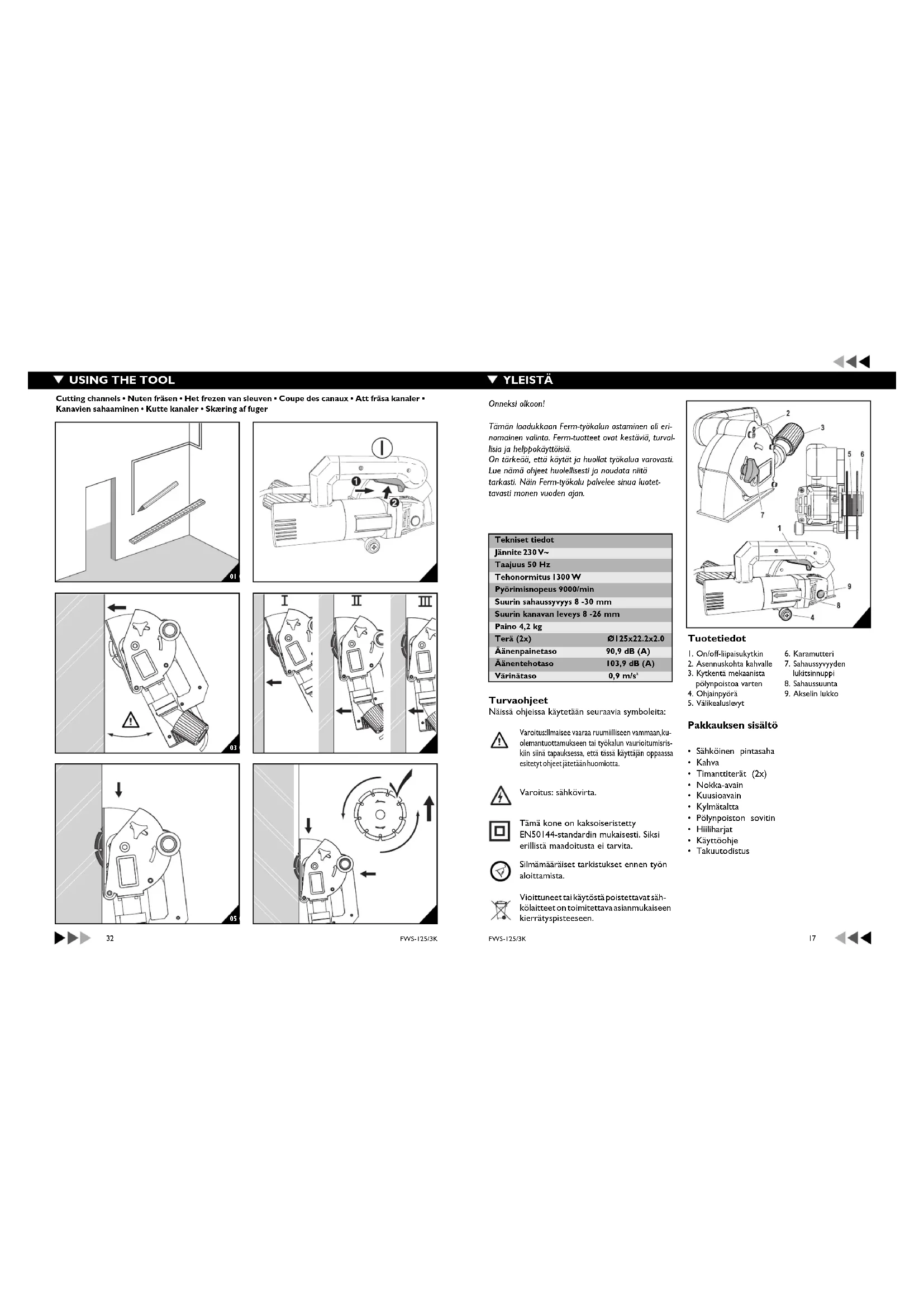- Takuutodistus Tekniset tiedot Jännite 230 V~ Taajuus 50 Hz Tehonormitus 1300 W Pyörimisnopeus 9000/min Suurin sahaussyvyys 8 -30 mm Suurin kanavan leveys 8 -26 mm Paino 4,2 kg Terä (2x) Ø125x22.2x2.0 Äänenpainetaso 90,9 dB (A) Äänentehotaso 103,9 dB (A) Värinätaso 0,9 m/s