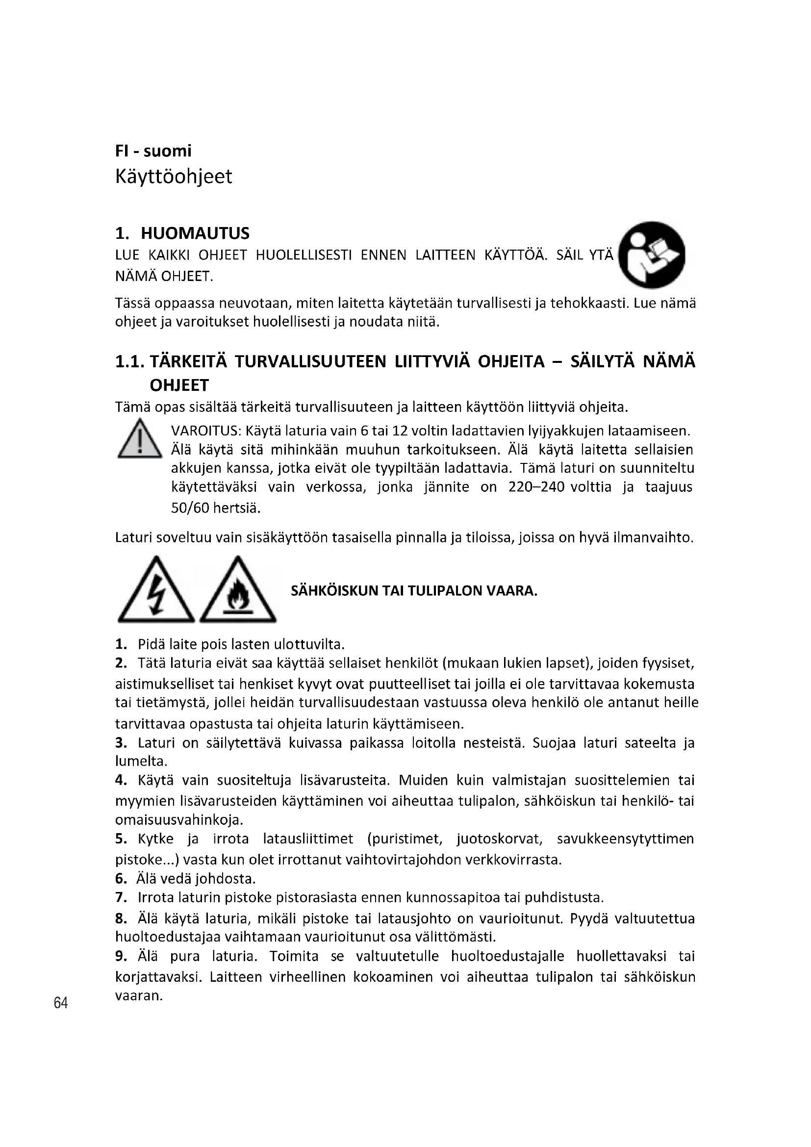 Tässä oppaassa neuvotaan, miten laitetta käytetään turvallisesti ja tehokkaasti. Lue nämä ohjeet ja varoitukset huolellisesti ja noudata niitä. 1.1. TÄRKEITÄ TURVALLISUUTEEN LIITTYVIÄ OHJEITA – SÄILYTÄ NÄMÄ OHJEET Tämä opas sisältää tärkeitä turvallisuuteen ja laitteen käyttöön liittyviä ohjeita. VAROITUS: Käytä laturia vain 6 tai 12 voltin ladattavien lyijyakkujen lataamiseen. Älä käytä sitä mihinkään muuhun tarkoitukseen. Älä käytä laitetta sellaisien akkujen kanssa, jotka eivät ole tyypiltään ladattavia. Tämä laturi on suunniteltu käytettäväksi vain verkossa, jonka jännite on 220–240 volttia ja taajuus 50/60 hertsiä.