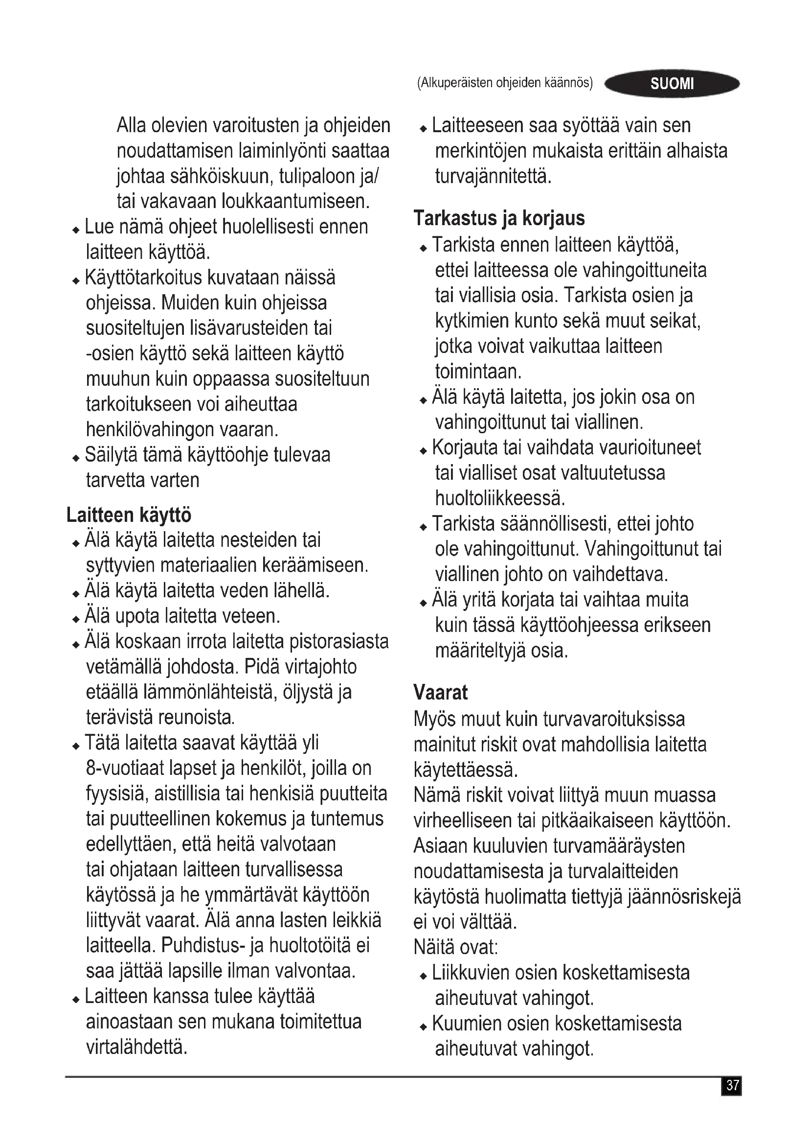 Varoitus! Lue kaikki turvallisuusvaroitukset ja ohjeet. (Alkuperäisten ohjeiden käännös) SUOMI37 (Alkuperäisten ohjeiden käännös) SUOMI Alla olevien varoitusten ja ohjeiden noudattamisen laiminlyönti saattaa johtaa sähköiskuun, tulipaloon ja/ tai vakavaan loukkaantumiseen. u Lue nämä ohjeet huolellisesti ennen laitteen käyttöä. u Käyttötarkoitus kuvataan näissä ohjeissa. Muiden kuin ohjeissa suositeltujen lisävarusteiden tai -osien käyttö sekä laitteen käyttö muuhun kuin oppaassa suositeltuun tarkoitukseen voi aiheuttaa henkilövahingon vaaran. u Säilytä tämä käyttöohje tulevaa tarvetta varten Laitteen käyttö u Älä käytä laitetta nesteiden tai syttyvien materiaalien keräämiseen. u Älä käytä laitetta veden lähellä. u Älä upota laitetta veteen. u Älä koskaan irrota laitetta pistorasiasta vetämällä johdosta. Pidä virtajohto etäällä lämmönlähteistä, öljystä ja terävistä reunoista. u Tätä laitetta saavat käyttää yli 8-vuotiaat lapset ja henkilöt, joilla on fyysisiä, aistillisia tai henkisiä puutteita tai puutteellinen kokemus ja tuntemus edellyttäen, että heitä valvotaan tai ohjataan laitteen turvallisessa käytössä ja he ymmärtävät käyttöön liittyvät vaarat. Älä anna lasten leikkiä laitteella. Puhdistus- ja huoltotöitä ei saa jättää lapsille ilman valvontaa. u Laitteen kanssa tulee käyttää ainoastaan sen mukana toimitettua virtalähdettä. u Laitteeseen saa syöttää vain sen merkintöjen mukaista erittäin alhaista turvajännitettä. Tarkastus ja korjaus u Tarkista ennen laitteen käyttöä, ettei laitteessa ole vahingoittuneita tai viallisia osia. Tarkista osien ja kytkimien kunto sekä muut seikat, jotka voivat vaikuttaa laitteen toimintaan. u Älä käytä laitetta, jos jokin osa on vahingoittunut tai viallinen. u Korjauta tai vaihdata vaurioituneet tai vialliset osat valtuutetussa huoltoliikkeessä. u Tarkista säännöllisesti, ettei johto ole vahingoittunut. Vahingoittunut tai viallinen johto on vaihdettava. u Älä yritä korjata tai vaihtaa muita kuin tässä käyttöohjeessa erikseen määriteltyjä osia. Vaarat Myös muut kuin turvavaroituksissa mainitut riskit ovat mahdollisia laitetta käytettäessä. Nämä riskit voivat liittyä muun muassa virheelliseen tai pitkäaikaiseen käyttöön. Asiaan kuuluvien turvamääräysten noudattamisesta ja turvalaitteiden käytöstä huolimatta tiettyjä jäännösriskejä ei voi välttää. Näitä ovat: u Liikkuvien osien koskettamisesta aiheutuvat vahingot. u Kuumien osien koskettamisesta aiheutuvat vahingot.38 (Alkuperäisten ohjeiden käännös) SUOMI u Osia tai lisälaitteita vaihdettaessa aiheutuneet vahingot. u Laitteen pitkäaikaisen käytön aiheuttamat vahingot. Kun käytät laitetta pitkään, varmista, että pidät säännöllisesti taukoja. Sähköturvallisuus Laite on suunniteltu käytettäväksi 12V negatiivisen maadoituksen autonakkujärjestelmissä. Varoitus! Savukkeensytyttimen liittimessä on huolloton turvasulake. Sulake voi vikatilanteessa palaa. Jos näin tapahtuu, sulake, liitin ja kaapeli on turvallisuussyistä vaihdettava. Anna vaihtaminen valmistajan tai valtuutetun Black & Decker -huollon tehtäväksi. Varoitus! Älä käytä laitetta järjestelmissä, joilla on positiivinen maadoitus tai eri jännite. Yleiskuvaus Tässä laitteessa on kaikki tai joitakin seuraavista ominaisuuksista.