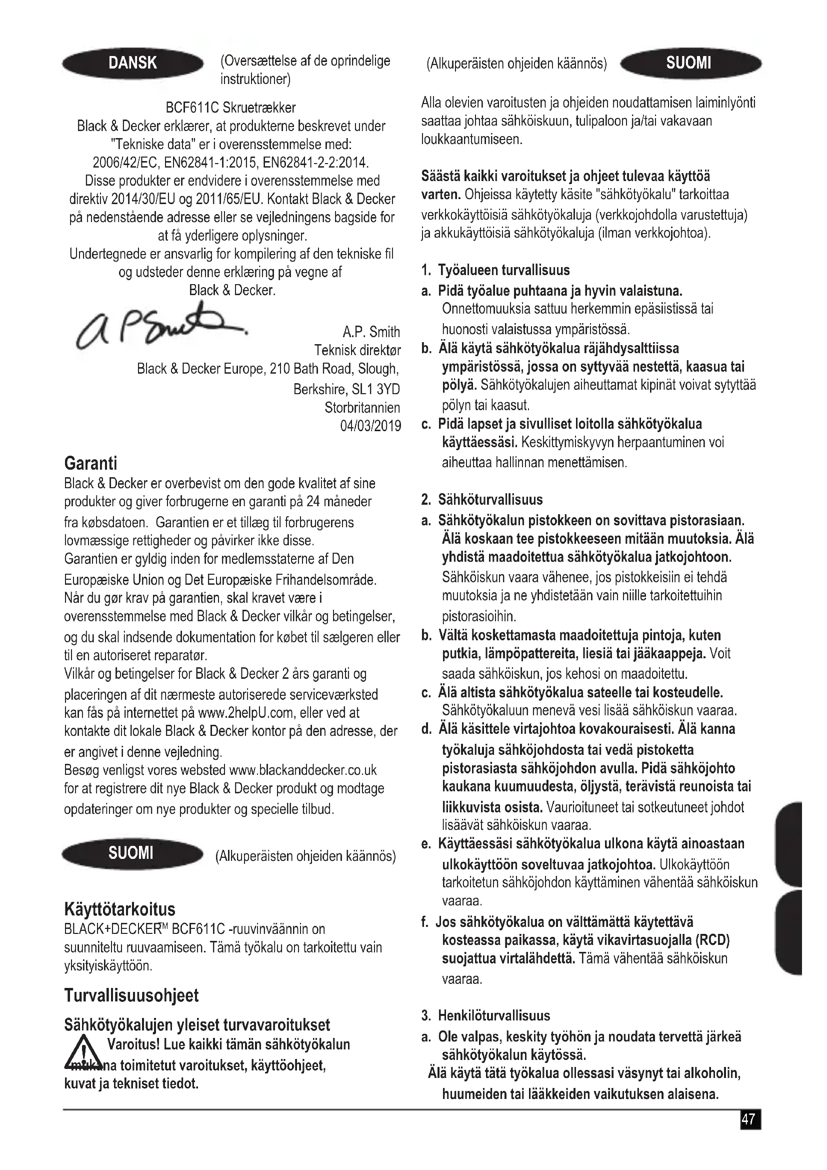BCF611C Ruuviväännin Black & Decker ilmoittaa, että tuotteet, jotka on kuvattu kohdassa ”Tekniset tiedot” ovat seuraavien direktiivien vaatimusten mukaisia: 2006/42/EY, EN62841-1:2015, EN62841-2-2:2014. Nämä tuotteet täyttävät myös direktiivien 2014/30/EU ja 2011/65/EU vaatimukset. Lisätietoja saa ottamalla yhteyden Black & Deckeriin seuraavassa osoitteessa. Tiedot ovat myös käyttöohjeen takakannessa. Allekirjoittaja vastaa teknisistä tiedoista ja antaa tämän vakuutuksen seuraavan yhtiön puolesta: Black & Decker. A.P. Smith Tekninen päällikkö Black & Decker Europe, 210 Bath Road, Slough, Berkshire, SL1 3YD Iso-Britannia