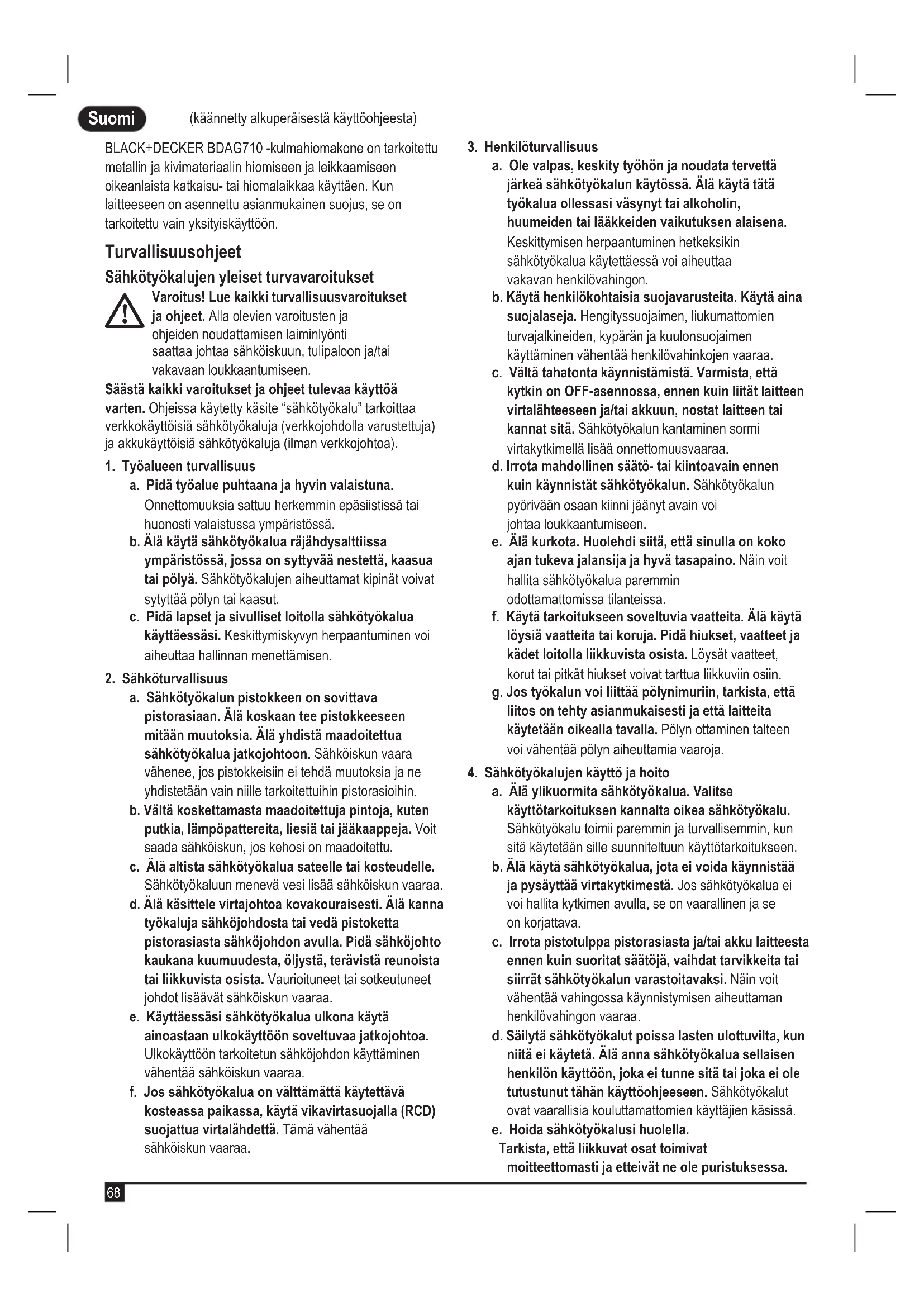(käännetty alkuperäisestä käyttöohjeesta) Suomi (käännetty alkuperäisestä käyttöohjeesta) BLACK+DECKER BDAG710 -kulmahiomakone on tarkoitettu metallin ja kivimateriaalin hiomiseen ja leikkaamiseen oikeanlaista katkaisu- tai hiomalaikkaa käyttäen. Kun laitteeseen on asennettu asianmukainen suojus, se on tarkoitettu vain yksityiskäyttöön. Turvallisuusohjeet Sähkötyökalujen yleiset turvavaroitukset