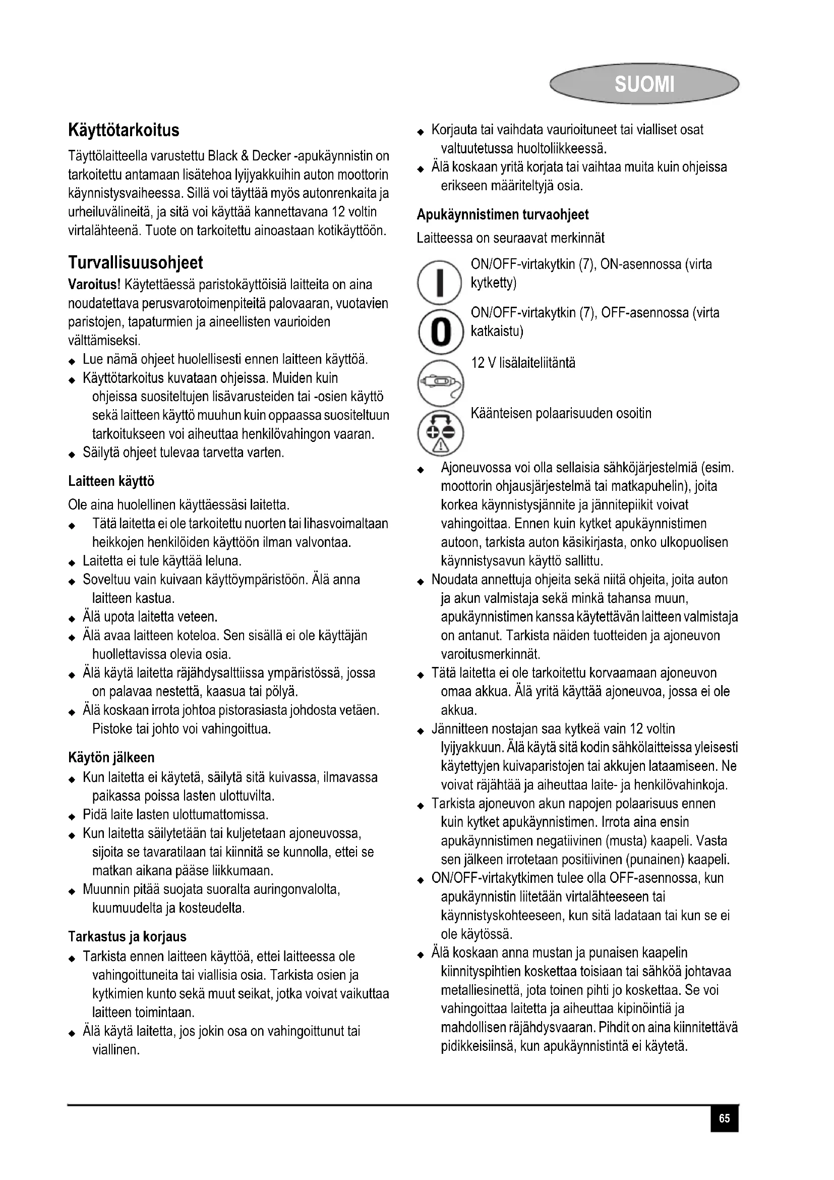 Käyttö Laitteen lataaminen (kuva A) Ostettaessa laitteen akku on osittain ladattu. X Lataa laitetta ennen sen ensimmäistä käyttökertaa verkkovirtalaturilla (11) 48 tuntia. Täyden varauskyvyn ja pitkän käyttöiän takaamiseksi lyijyakut vaativat tietyn perushuollon. Ajan mittaan kaikkien akkujen varaus purkautuu itsekseen. Purkautuminen nopeutuu lämpötilan kohoamisen myötä. Kun apukäynnistintä ei käytetä, Black & Decker suosittelee sen lataamista vähintään 60 päivän välein. X Tarkista akun varaustaso painamalla varaustilan painiketta (4). Varaustilan merkkivalot (6) osoittavat akun varaustason. Lataa laite, jos vain yksi punainen merkkivalo palaa. Huomautus: Akun lataaminen jokaisen käyttökerran jälkeen pidentää akun käyttöikää. Usein toistuvat nopeat purkaukset latausten välillä ja/tai ylilataaminen lyhentävät akun ikää. Apukäynnistimen akun voi ladata verkkovirtalaturilla (11) tai 12 voltin ajoneuvosovitinta (12) käyttäen. Apukäynnistimen lataaminen verkkovirtalaturilla (kuva A) Varmista, että virta on katkaistu ON/OFF-virtakytkimestä (7) ja hakuvalosta (10) latauksen ajaksi. Sitä mukaan kun lataus etenee, punaiset merkkivalot syttyvät yksi kerrallaan. X Lataa niin kauan, kunnes vihreä täyden latauksen merkkivalo (FULL) syttyy. X Jatka latausta tämän jälkeen vielä tunnin tai kaksi. Huomautus: Akkua saa ladata verkkovirtalaturilla enintään 60 tuntia. X Kun akku on ladattu täyteen, irrota verkkovirtalaturi (11) ja vie se turvalliseen säilytyspaikkaan. Lataaminen 12 voltin ajoneuvosovitinta käyttäen (kuva A) Varmista, että virta on katkaistu ON/OFF-virtakytkimestä (7) ja hakuvalosta (10) latauksen ajaksi. 12 voltin ajoneuvosovittimella (12) ladattaessa jännitteensäätely ei ole käytössä. Varoitus! Käytettäessä lataamiseen 12 voltin ajoneuvosovitinta (12) X Suurin sallittu latausaika on neljä tuntia. X Älä jätä laitetta ilman valvontaa. Apukäynnistimen lataaminen 12 voltin ajoneuvosovitinta (12) käyttäen: X Työnnä 12 V ajoneuvosovittimen (12) toinen pää ajoneuvon tai veneen 12 voltin lisälaiteliitäntään. X Työnnä 12 voltin ajoneuvosovittimen (12) toinen pää apukäynnistimen 12 voltin latausliitäntään (3). X Voit tarkistaa akun varaustilan tasavirtalatauksen aikana irrottamalla 12 voltin ajoneuvosovittimen lisälaiteliitännästä ja painamalla akun varaustilan painiketta. Tarkkaile akun varaustilan merkkivaloja. Suurin sallittu latausaika on kolmesta neljään tuntia. X Kun akku on ladattu täyteen, irrota 12 voltin ajoneuvosovitin ja vie se turvalliseen säilytyspaikkaan. Varoitus! 12 voltin ajoneuvosovitin on irrotettava ajoneuvon 12 voltin lisälaiteliitännästä ennen ajoneuvon ajamista. Jos ohjetta ei noudateta, moottori voi joissakin tapauksissa jäädä käymään, vaikka virta-avain on poistettu. Tämä voi aiheuttaa laite- ja henkilövahinkoja. Apukäynnistimen käyttäminen käynnistysapuna (kuvat A ja B) Varoitus! Varmista, että ajoneuvo on vaihdettu vapaalle käsijarrua käytettäessä. X Katkaise virta ajoneuvosta ja sen kaikista laitteista ennen mitään kytkentöjä. X Varmista, että apukäynnistimen ON/OFF-virtakytkin (7) on OFF-asennossa (virta katkaistu). X Alla kuvattu menettely soveltuu negatiiviseen maadoitusjärjestelmään, jossa akun negatiivinen napa liitetään ajoneuvon koriin. X Kiinnitä positiivinen (+) punainen kiinnityspihti ajoneuvon akun positiiviseen napaan. X Kiinnitä negatiivinen (-) musta pihti ajoneuvon koriin tai sen paljaaseen, kiinteään osaan tai korin osaan. Huomautus: Jos liitännät on tehty väärin, laite antaa jatkuvasti äänimerkkejä ja punainen käänteisen polaarisuuden osoitin (9) syttyy, vaikka ON/OFF-kytkin on OFF-asennossa. Korjaa liitännät välittömästi. Varoitus! Katso, etteivät kaapelit ole pyörivien hihnojen tai tuulettimen tiellä. X Käännä apukäynnistimen ON/OFF-virtakytkin (7) ON- asentoon. X Kytke ajoneuvon virta ja starttaa moottoria 3—6 sekunnin mittaisissa jaksoissa.68 SUOMI Ellei moottori käynnisty 6 sekunnissa, anna apukäynnistimen sisäisen akun jäähtyä 3 minuuttia ennen seuraavaa käynnistysyritystä. X Kun ajoneuvo käynnistyy, käännä apukäynnistimen ON/OFF-virtakytkin (7) OFF-asentoon. X Jätä ajoneuvon moottori käyntiin. X Irrota ensin ajoneuvon koriin tai moottoriin kiinnitetty musta (-) pihti ja vasta sen jälkeen akun +-napaan kiinnitetty punainen +-pihti. X Työnnä varovasti negatiivinen (musta) käynnistyskaapeli säilytysuraansa aloittaen siitä päästä, joka on kauimpana pihdistä. X Purista negatiivinen (musta) pihti pidikkeeseensä (14). X Työnnä varovasti positiivinen (punainen) käynnistyskaapeli säilytysuraansa aloittaen siitä päästä, joka on kauimpana pihdistä. X Purista positiivinen (punainen) pihti pidikkeeseensä (14). X Lataa apukäynnistin mahdollisimman pian. Täyttölaitteen käyttäminen (kuva C) Varoitus! Ota täyttölaitetta käytettäessä seuraavat seikat huomioon: X Älä suuntaa suutinta eläimiin tai lähellä olevia ihmisiä kohti. X Älä koskaan jätä käynnissä olevaa kompressoria ilman valvontaa. X Käytä vain laitteen mukana toimitettuja sovittimia. X Jos laitetta käytetään pitkään, se voi ylikuumeta ja ylikuumenemissuoja voi aktivoitua. Sammuta tällöin kompressori ja anna sen jäähtyä 30 minuutin ajan. X Säilytä kompressoria poissa pienten lasten ulottuvilta. X Mittari on tarkoitettu vain suuntaa antavaksi. Renkaiden paineet on tarkistettava säännöllisesti hyväksytyllä mittarilla. X Älä ylitäytä esineitä, sillä tämä voi aiheuttaa henkilövahinkoja. Täyttölaitteella voidaan täyttää autojen renkaita ja urheiluvälineitä. X Ota täyttölaitteen letku esiin säilytyslokerosta. X Jos tarvitset sovitinta, valitse täytettävälle tuotteelle sopiva sovitin (18) ja kiinnitä se suuttimeen (15). X Kiinnitä täyttölaitteen suutin (15) tai mahdollinen sovitin (18) täytettävän esineen venttiiliin. Varmista, että suutin (15) luk