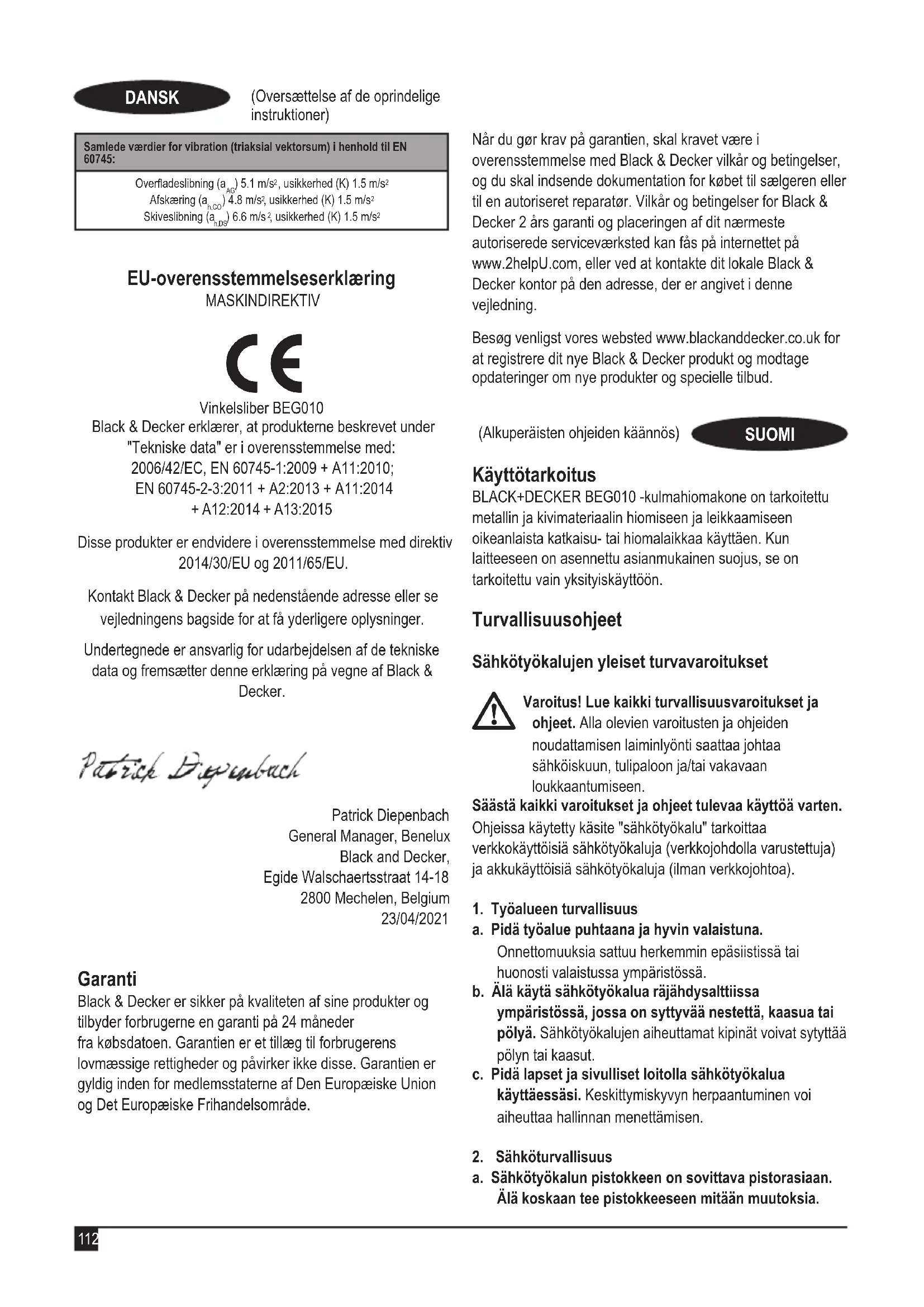 Allekirjoittanut vastaa teknisten tietojen kokoamisesta tehden tämän ilmoituksen Black & Deckerin puolesta. Patrick Diepenbach General Manager, Benelux Black and Decker, Egide Walschaertsstraat 14-18 2800 Mechelen, Belgium 23/04/2021 Takuu Black & Decker on vakuuttunut tuotteidensa korkeasta laadusta ja tarjoaa kuluttajille 24 kuukauden takuun, joka astuu voimaan ostopäivänä. Takuu on lisäys kuluttajan laillisiin oikeuksiin eikä vaikuta niihin. Tämä takuu on voimassa kaikissa EU- ja ETA-maissa. Edellytyksenä takuun saamiselle on, että vaade täyttää Black & Deckerin ehdot ja että ostaja toimittaa ostotositteen jälleenmyyjälle tai valtuutetulle huoltoliikkeelle. Black & Deckerin kahden vuoden takuun ehdot ja lähimmän valtuutetun korjauspalvelun yhteystiedot ovat saatavilla osoitteessa www.2helpU.com tai ottamalla yhteyttä paikalliseen Black & Deckerin toimipisteeseen tässä ohjekirjassa ilmoitettuihin osoitteisiin. Käy verkkosivuillamme osoitteessa www.blackanddecker.co. uk ja rekisteröi uusi Black & Decker -tuotteesi. Sivuilta saat myös päivityksiä uusista tuotteista ja erikoistarjouksista. Käyttötarkoitus Ο γωνιακός τροχός BLACK+DECKER BEG010 που αποκτήσατε έχει σχεδιαστεί για τρόχισμα-λείανση και κοπή μετάλλων και ειδών τοιχοποιίας με χρήση του κατάλληλου τύπου δίσκου κοπής ή τροχίσματος. Όταν έχει τοποθετηθεί στο εργαλείο το κατάλληλο προστατευτικό, το εργαλείο προορίζεται μόνο για ερασιτεχνική χρήση. Οδηγίες ασφαλείας Γενικές προειδοποιήσεις ασφαλείας για ηλεκτρικά