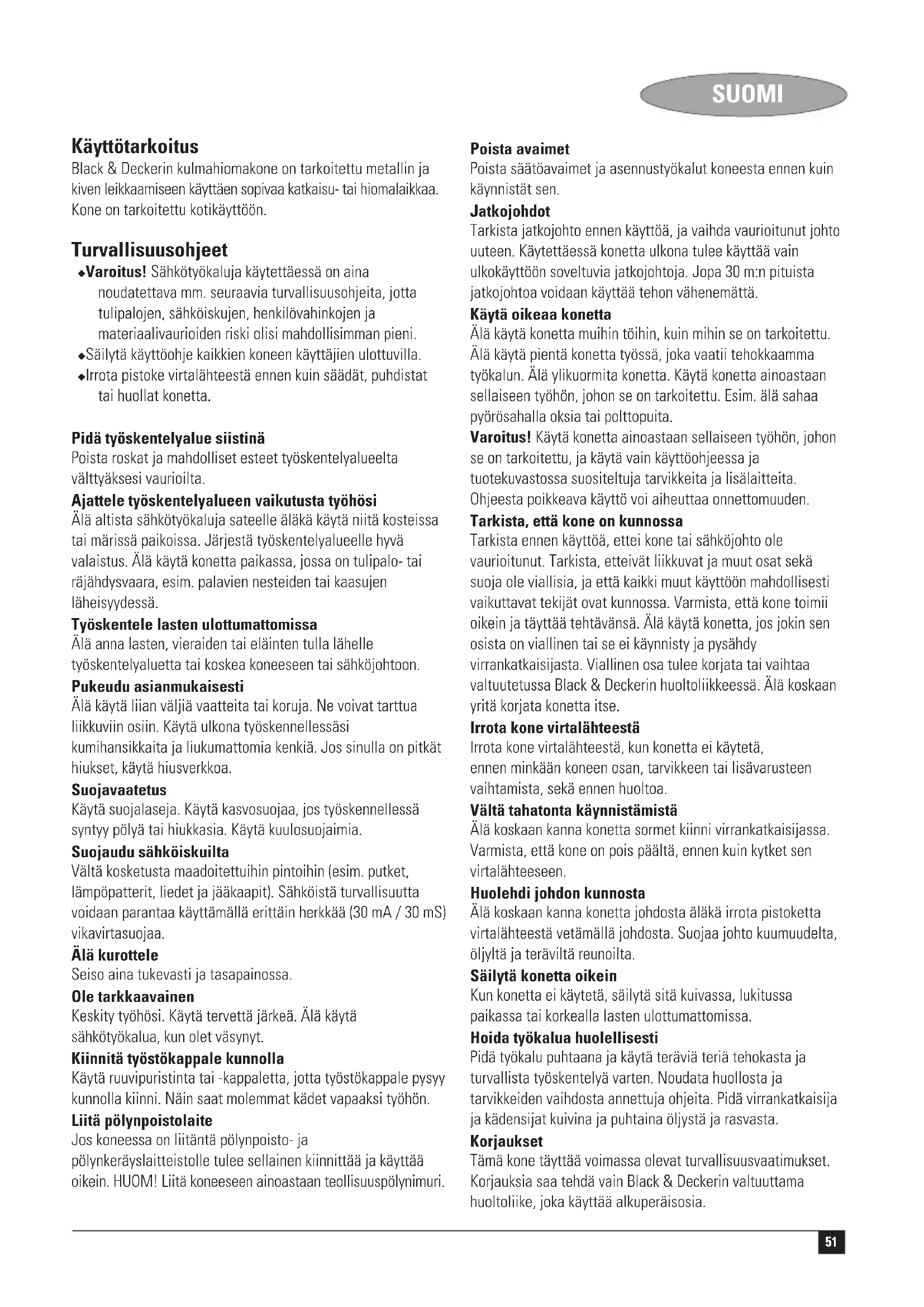 Kevin Hewitt Director of Consumer Engineering Spennymoor, County Durham DL16 6JG, Storbritannien 1-5-2005 Reservedele / reparationer Reservedele kan købes hos autoriserede Black & Decker serviceværksteder, som giver forslag til omkostninger og reparerer vore produkter. Oversigt over vore autoriserede værksteder findes på internettet på vor hjemmeside www.blackanddecker.dk samt www.2helpU.com Garanti Black & Decker garanterer, at produktet er fri for materielle skader og/eller fabrikationsfejl ved levering til kunden. Garantien er et tillæg til konsumentens lovlige rettigheder og påvirker ikke disse. Garantien gælder indenfor medlemsstaterne af den Europæiske Union og i det Europæiske Frihandelsområde. Hvis et Black & Decker produkt går i stykker på grund af materiel skade og/eller fabrikationsfejl eller på anden måde ikke fungerer i overensstemmelse med specifikationen, inden for 24 måneder fra købsdatoen, påtager Black & Decker sig at reparere eller ombytte produktet med mindst muligt besvær for kunden. Garantien gælder ikke for fejl og mangler, der er sket i forbindelse med: ◆ normal slitage ◆ uheldige følger efter unormal anvendelse af værktøjet ◆ overbelastning, hærværk eller overdrevent intensivt brug af værktøjet ◆ ulykkeshændelse Garantien gælder ikke hvis reparationer er udført af nogen anden end et autoriseret Black & Decker værksted.50 DANSK For at udnytte garantien skal produktet og købskvitteringen indleveres til forhandleren eller til et autoriseret værksted, senest 2 måneder efter at fejlen opdages. For information om nærmeste autoriserede værksted: kontakt det lokale Black & Decker kontor på den adresse som er opgivet i brugsanvisningen. Liste over alle autoriserede Black & Decker serviceværksteder samt servicevilkår er tilgængelig på internettet, på adressen www.2helpU.com Gå venligst ind på vores website www.blackanddecker.dk for at registrere dit nye produkt og for at blive holdt ajour om nye produkter og specialtilbud. Der findes yderligere oplysninger om mærket Black & Decker og vores produktsortiment på adressen www.blackanddecker.dk51 SUOMI Käyttötarkoitus Black & Deckerin kulmahiomakone on tarkoitettu metallin ja kiven leikkaamiseen käyttäen sopivaa katkaisu- tai hiomalaikkaa. Kone on tarkoitettu kotikäyttöön. Turvallisuusohjeet ◆ Varoitus! Sähkötyökaluja käytettäessä on aina noudatettava mm. seuraavia turvallisuusohjeita, jotta tulipalojen, sähköiskujen, henkilövahinkojen ja materiaalivaurioiden riski olisi mahdollisimman pieni. ◆ Säilytä käyttöohje kaikkien koneen käyttäjien ulottuvilla. ◆ Irrota pistoke virtalähteestä ennen kuin säädät, puhdistat tai huollat konetta. Pidä työskentelyalue siistinä Poista roskat ja mahdolliset esteet työskentelyalueelta välttyäksesi vaurioilta. Ajattele työskentelyalueen vaikutusta työhösi Älä altista sähkötyökaluja sateelle äläkä käytä niitä kosteissa tai märissä paikoissa. Järjestä työskentelyalueelle hyvä valaistus. Älä käytä konetta paikassa, jossa on tulipalo- tai räjähdysvaara, esim. palavien nesteiden tai kaasujen läheisyydessä. Työskentele lasten ulottumattomissa Älä anna lasten, vieraiden tai eläinten tulla lähelle työskentelyaluetta tai koskea koneeseen tai sähköjohtoon. Pukeudu asianmukaisesti Älä käytä liian väljiä vaatteita tai koruja. Ne voivat tarttua liikkuviin osiin. Käytä ulkona työskennellessäsi kumihansikkaita ja liukumattomia kenkiä. Jos sinulla on pitkät hiukset, käytä hiusverkkoa. Suojavaatetus Käytä suojalaseja. Käytä kasvosuojaa, jos työskennellessä syntyy pölyä tai hiukkasia. Käytä kuulosuojaimia. Suojaudu sähköiskuilta Vältä kosketusta maadoitettuihin pintoihin (esim. putket, lämpöpatterit, liedet ja jääkaapit). Sähköistä turvallisuutta voidaan parantaa käyttämällä erittäin herkkää (30 mA / 30 mS) vikavirtasuojaa. Älä kurottele Seiso aina tukevasti ja tasapainossa. Ole tarkkaavainen Keskity työhösi. Käytä tervettä järkeä. Älä käytä sähkötyökalua, kun olet väsynyt. Kiinnitä työstökappale kunnolla Käytä ruuvipuristinta tai -kappaletta, jotta työstökappale pysyy kunnolla kiinni. Näin saat molemmat kädet vapaaksi työhön. Liitä pölynpoistolaite Jos koneessa on liitäntä pölynpoisto- ja pölynkeräyslaitteistolle tulee sellainen kiinnittää ja käyttää oikein. HUOM! Liitä koneeseen ainoastaan teollisuuspölynimuri. Poista avaimet Poista säätöavaimet ja asennustyökalut koneesta ennen kuin käynnistät sen. Jatkojohdot Tarkista jatkojohto ennen käyttöä, ja vaihda vaurioitunut johto uuteen. Käytettäessä konetta ulkona tulee käyttää vain ulkokäyttöön soveltuvia jatkojohtoja. Jopa 30 m:n pituista jatkojohtoa voidaan käyttää tehon vähenemättä. Käytä oikeaa konetta Älä käytä konetta muihin töihin, kuin mihin se on tarkoitettu. Älä käytä pientä konetta työssä, joka vaatii tehokkaamma työkalun. Älä ylikuormita konetta. Käytä konetta ainoastaan sellaiseen työhön, johon se on tarkoitettu. Esim. älä sahaa pyörösahalla oksia tai polttopuita. Varoitus! Käytä konetta ainoastaan sellaiseen työhön, johon se on tarkoitettu, ja käytä vain käyttöohjeessa ja tuotekuvastossa suositeltuja tarvikkeita ja lisälaitteita. Ohjeesta poikkeava käyttö voi aiheuttaa onnettomuuden. Tarkista, että kone on kunnossa Tarkista ennen käyttöä, ettei kone tai sähköjohto ole vaurioitunut. Tarkista, etteivät liikkuvat ja muut osat sekä suoja ole viallisia, ja että kaikki muut käyttöön mahdollisesti vaikuttavat tekijät ovat kunnossa. Varmista, että kone toimii oikein ja täyttää tehtävänsä. Älä käytä konetta, jos jokin sen osista on viallinen tai se ei käynnisty ja pysähdy virrankatkaisijasta. Viallinen osa tulee korjata tai vaihtaa valtuutetussa Black & Deckerin huoltoliikkeessä. Älä koskaan yritä korjata konetta itse. Irrota kone virtalähteestä Irrota kone virt