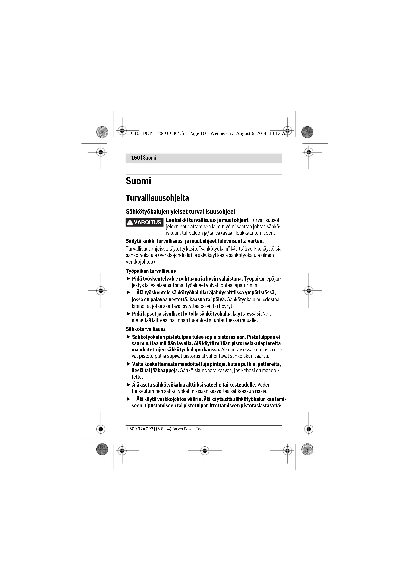 Hold elektroverktøyet og ventilasjonsspaltene alltid rene, for å kunne arbeide bra og sikkert. Hvis batteriet ikke lenger er funksjonsdyktig, må du henvende deg til en autorisert kundeservice for Bosch-elektroverktøy. Hvis det er nødvendig å skifte ut tilkoplingsledningen, må dette gjøres av Bosch eller Bosch-serviceverksteder, slik at det ikke oppstår fare for sikker- heten. OBJ_DOKU-28030-004.fm Page 157 Wednesday, August 6, 2014 10:12 AM1 609 92A 0P3 | (6.8.14) Bosch Power Tools 158 | Norsk Hvis elektroverktøyet til tross for omhyggelige produksjons- og kontrollme- toder en gang skulle svikte, må reparasjonen utføres av et autorisert service- verksted for Bosch-elektroverktøy. Ved alle forespørsler og reservedelsbestillinger må du oppgi det 10-sifrede produktnummeret som er angitt på elektroverktøyets typeskilt. Kundeservice og rådgivning ved bruk Kundeservicen svarer på dine spørsmål om reparasjon og vedlikehold av pro- duktet samt om reservedeleler. Sprengskisser og informasjon om reservede- ler finner du også på: www.bosch-pt.com Bosch rådgivningsteamet hjelper deg gjerne ved spørsmål angående våre produkter og deres tilbehør. Norsk Robert Bosch AS Postboks 350 1402 Ski Tel.: 64 87 89 50 Faks: 64 87 89 55 Transport Li-ion-batteriene i verktøyet underligger kravene for farlig gods. Batteriene kan transporteres på veier av brukeren uten ytterligere krav. Ved forsendelse gjennom tredje personer (f. eks.: lufttransport eller spedi- sjon) må det oppfylles spesielle krav til emballasje og merking. Du må da kon- sultere en ekspert for farlig gods ved forberedelse av forsendelsen. Deponering Elektroverktøy, batterier, tilbehør og emballasje må leveres inn til miljøvennlig gjenvinning. Elektroverktøy og batterier må ikke kastes i vanlig søppel! OBJ_DOKU-28030-004.fm Page 158 Wednesday, August 6, 2014 10:12 AMBosch Power Tools 1 609 92A 0P3 | (6.8.14) Norsk | 159 Kun for EU-land: Iht. det europeiske direktivet 2012/19/EU om gamle elektriske apparater og iht. det europeiske direktivet 2006/66/EC må defekte eller oppbrukte batterier/opp- ladbare batterier samles inn adskilt og leveres inn til en miljøvennlig resirkulering. Batterier/oppladbare batterier: Li-ion: Ta hensyn til informasjonene i avsnittet «Transport», side 158. Integrerte batterier må bare tas ut og kasseres av fagpersonale. Elektroverktøyet kan bli ødelagt når husdekselet åpnes. Når du skal ta batteriet ut av elektroverktøyet, aktiverer du av/på-bryteren 8 til batteriet er helt utladet. Skru ut skruene på huset og ta av husdekselet for å ta ut batteriet. For å hindre kortslutning kobler du fra de enkelte tilkoblin- gene på batteriet etter tur, og isolerer polene til disse. Det er fortsatt restka- pasitet i batteriet også etter fullstendig utlading, og denne kan frigjøres hvis det oppstår en kortslutning. Rett til endringer forbeholdes. OBJ_DOKU-28030-004.fm Page 159 Wednesday, August 6, 2014 10:12 AM1 609 92A 0P3 | (6.8.14) Bosch Power Tools 160 | Suomi Suomi Turvallisuusohjeita Sähkötyökalujen yleiset turvallisuusohjeet Lue kaikki turvallisuus- ja muut ohjeet. Turvallisuusoh- jeiden noudattamisen laiminlyönti saattaa johtaa sähkö- iskuun, tulipaloon ja/tai vakavaan loukkaantumiseen. Säilytä kaikki turvallisuus- ja muut ohjeet tulevaisuutta varten. Turvallisuusohjeissa käytetty käsite ”sähkötyökalu” käsittää verkkokäyttöisiä sähkötyökaluja (verkkojohdolla) ja akkukäyttöisiä sähkötyökaluja (ilman verkkojohtoa). Työpaikan turvallisuus Pidä työskentelyalue puhtaana ja hyvin valaistuna. Työpaikan epäjär- jestys tai valaisemattomat työalueet voivat johtaa tapaturmiin. Älä työskentele sähkötyökalulla räjähdysalttiissa ympäristössä, jossa on palavaa nestettä, kaasua tai pölyä. Sähkötyökalu muodostaa kipinöitä, jotka saattavat sytyttää pölyn tai höyryt. Pidä lapset ja sivulliset loitolla sähkötyökalua käyttäessäsi. Voit menettää laitteesi hallinnan huomiosi suuntautuessa muualle. Sähköturvallisuus Sähkötyökalun pistotulpan tulee sopia pistorasiaan. Pistotulppaa ei saa muuttaa millään tavalla. Älä käytä mitään pistorasia-adaptereita maadoitettujen sähkötyökalujen kanssa. Alkuperäisessä kunnossa ole- vat pistotulpat ja sopivat pistorasiat vähentävät sähköiskun vaaraa. Vältä koskettamasta maadoitettuja pintoja, kuten putkia, pattereita, liesiä tai jääkaappeja. Sähköiskun vaara kasvaa, jos kehosi on maadoi- tettu. Älä aseta sähkötyökalua alttiiksi sateelle tai kosteudelle. Veden tunkeutuminen sähkötyökalun sisään kasvattaa sähköiskun riskiä. Älä käytä verkkojohtoa väärin. Älä käytä sitä sähkötyökalun kantami- seen, ripustamiseen tai pistotulpan irrottamiseen pistorasiasta vetä- VAROITUS OBJ_DOKU-28030-004.fm Page 160 Wednesday, August 6, 2014 10:12 AMBosch Power Tools 1 609 92A 0P3 | (6.8.14) Suomi | 161 mällä. Pidä johto loitolla kuumuudesta, öljystä, terävistä reunoista ja liikkuvista osista. Vahingoittuneet tai sotkeutuneet johdot kasvattavat sähköiskun vaaraa. Käyttäessäsi sähkötyökalua ulkona käytä ainoastaan ulkokäyttöön soveltuvaa jatkojohtoa. Ulkokäyttöön soveltuvan jatkojohdon käyttö pienentää sähköiskun vaaraa. Jos sähkötyökalun käyttö kosteassa ympäristössä ei ole vältettävis- sä, tulee käyttää vikavirtasuojakytkintä. Vikavirtasuojakytkimen käyt- tö vähentää sähköiskun vaaraa. Henkilöturvallisuus Ole valpas, kiinnitä huomiota työskentelyysi ja noudata tervettä jär- keä sähkötyökalua käyttäessäsi. Älä käytä mitään sähkötyökalua, jos olet väsynyt tai huumeiden, alkoholin tahi lääkkeiden vaikutuksen alaisena. Hetken tarkkaamattomuus sähkötyökalua käytettäessä saattaa johtaa vakavaan loukkaantumiseen. Käytä suojavarusteita. Käytä aina suojalaseja. Henkilökohtaisen suoja- varustuksen käyttö, kuten pölynaamarin, luistamattomien turvakenkien, suojakypärän tai kuu
