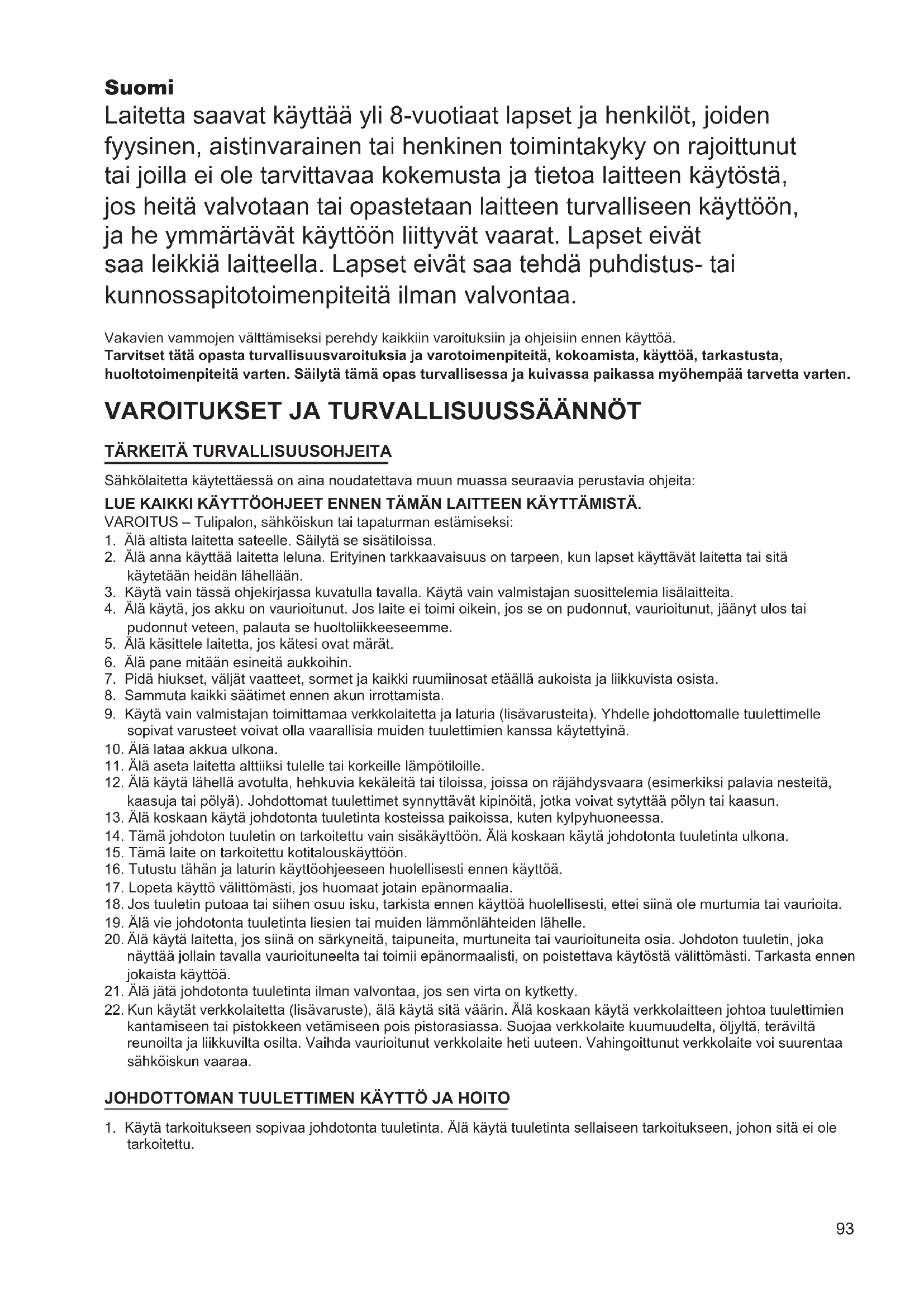 Sähkölaitetta käytettäessä on aina noudatettava muun muassa seuraavia perustavia ohjeita: LUE KAIKKI KÄYTTÖOHJEET ENNEN TÄMÄN LAITTEEN KÄYTTÄMISTÄ. VAROITUS – Tulipalon, sähköiskun tai tapaturman estämiseksi: