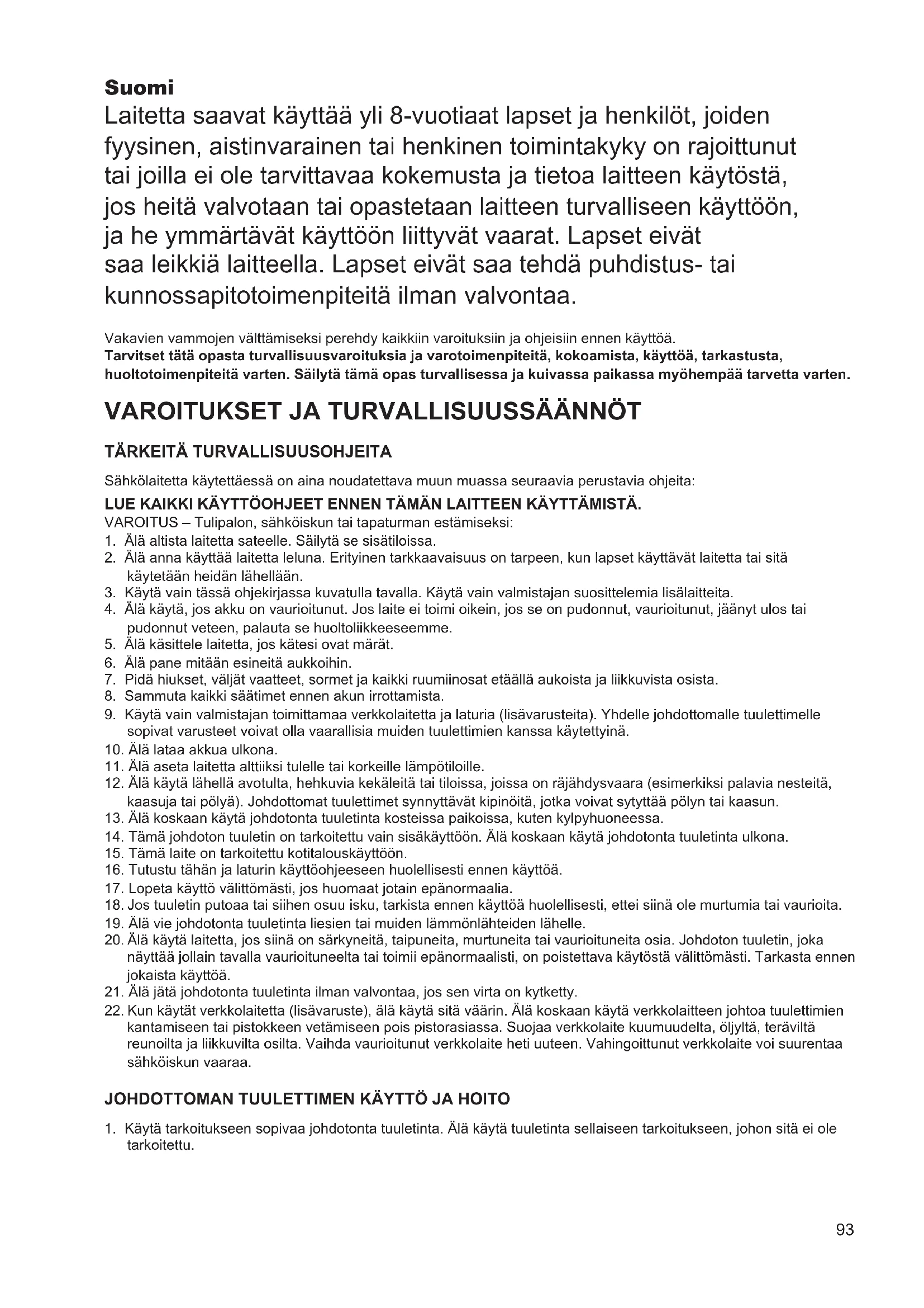 JOHDOTTOMAN TUULETTIMEN KÄYTTÖ JA HOITO
