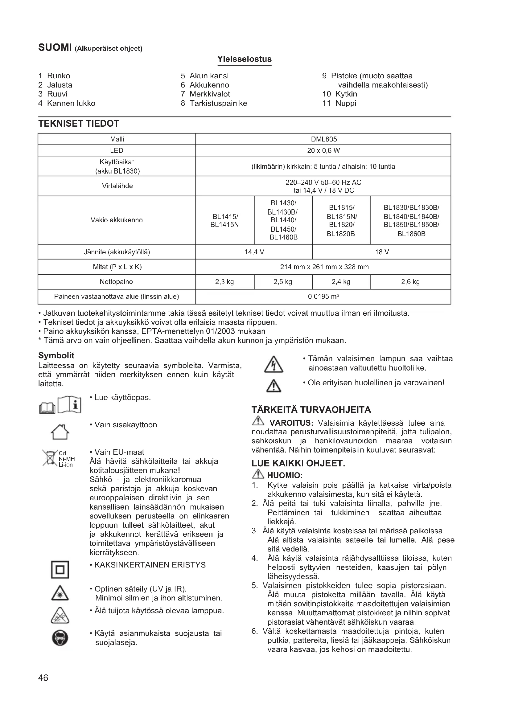 putkia, pattereita, liesiä tai jääkaappeja. Sähköiskun vaara kasvaa, jos kehosi on maadoitettu. Malli DML805 LED 20 x 0,6 W Käyttöaika* (akku BL1830) (likimäärin) kirkkain: 5 tuntia / alhaisin: 10 tuntia Virtalähde 220–240 V 50–60 Hz AC tai 14,4 V / 18 V DC Vakio akkukenno BL1415/ BL1415N BL1430/ BL1430B/ BL1440/ BL1450/ BL1460B BL1815/ BL1815N/ BL1820/ BL1820B BL1830/BL1830B/ BL1840/BL1840B/ BL1850/BL1850B/ BL1860B Jännite (akkukäytöllä) 14,4 V 18 V Mitat (P x L x K) 214 mm x 261 mm x 328 mm Nettopaino 2,3 kg 2,5 kg 2,4 kg 2,6 kg Paineen vastaanottava alue (linssin alue) 0,0195 m