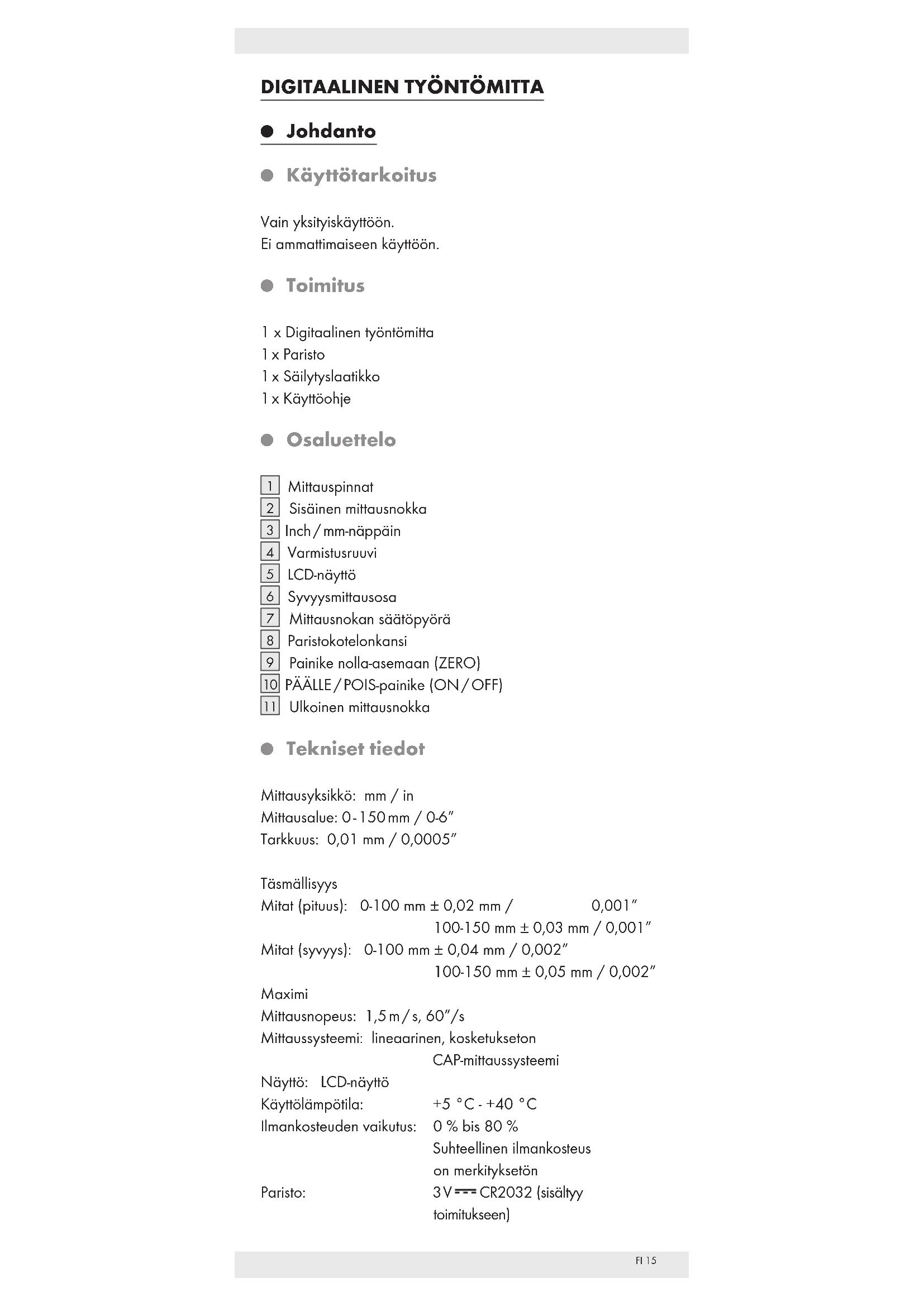 Tekniset tiedot Mittausyksikkö: mm / in Mittausalue: 0 - 150 mm / 0-6” Tarkkuus: 0,01 mm / 0,0005” Täsmällisyys Mitat (pituus): 0-100 mm ± 0,02 mm / 0,001” 100-150 mm ± 0,03 mm / 0,001” Mitat (syvyys): 0-100 mm ± 0,04 mm / 0,002” 100-150 mm ± 0,05 mm / 0,002” Maximi Mittausnopeus: 1,5 m / s, 60”/s Mittaussysteemi: lineaarinen, kosketukseton CAP-mittaussysteemi Näyttö: LCD-näyttö Käyttölämpötila: +5 °C - +40 °C Ilmankosteuden vaikutus: 0 % bis 80 % Suhteellinen ilmankosteus on merkityksetön Paristo: 3 V CR2032 (sisältyy toimitukseen)FI16 Turvallisuusohjeet
