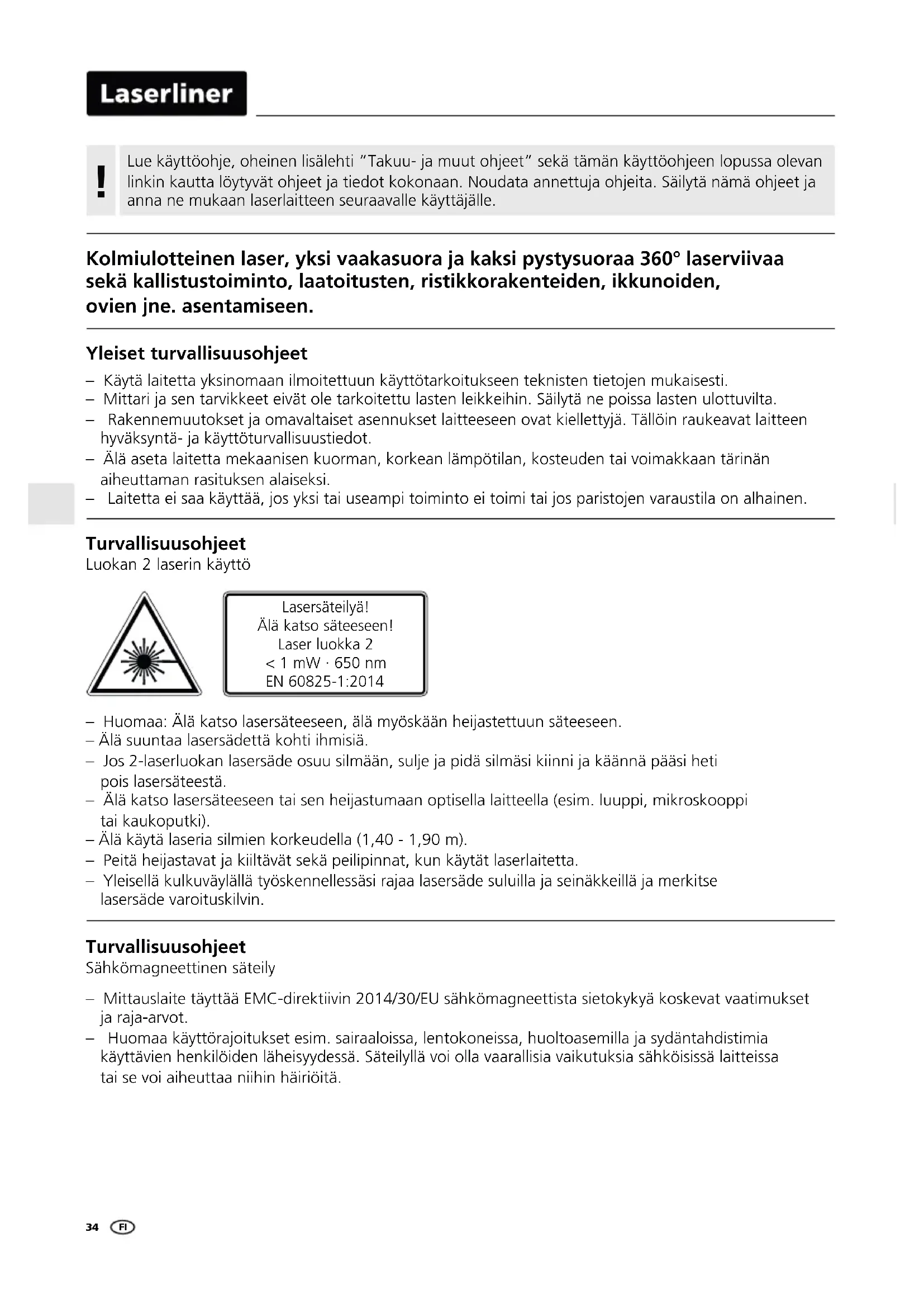 PL34 Turvallisuusohjeet Sähkömagneettinen säteily – Mittauslaite täyttää EMC-direktiivin 2014/30/EU sähkömagneettista sietokykyä koskevat vaatimukset ja raja-arvot. – Huomaa käyttörajoitukset esim. sairaaloissa, lentokoneissa, huoltoasemilla ja sydäntahdistimia käyttävien henkilöiden läheisyydessä. Säteilyllä voi olla vaarallisia vaikutuksia sähköisissä laitteissa tai se voi aiheuttaa niihin häiriöitä. – Huomaa: Älä katso lasersäteeseen, älä myöskään heijastettuun säteeseen. – Älä suuntaa lasersädettä kohti ihmisiä. – Jos 2-laserluokan lasersäde osuu silmään, sulje ja pidä silmäsi kiinni ja käännä pääsi heti pois lasersäteestä. – Älä katso lasersäteeseen tai sen heijastumaan optisella laitteella (esim. luuppi, mikroskooppi tai kaukoputki). – Älä käytä laseria silmien korkeudella (1,40 - 1,90 m). – Peitä heijastavat ja kiiltävät sekä peilipinnat, kun käytät laserlaitetta. – Yleisellä kulkuväylällä työskennellessäsi rajaa lasersäde suluilla ja seinäkkeillä ja merkitse lasersäde varoituskilvin. Lasersäteilyä! Älä katso säteeseen! Laser luokka 2 < 1 mW · 650 nm EN 60825-1:2014 Turvallisuusohjeet Luokan 2 laserin käyttö – Käytä laitetta yksinomaan ilmoitettuun käyttötarkoitukseen teknisten tietojen mukaisesti. – Mittari ja sen tarvikkeet eivät ole tarkoitettu lasten leikkeihin. Säilytä ne poissa lasten ulottuvilta. – Rakennemuutokset ja omavaltaiset asennukset laitteeseen ovat kiellettyjä. Tällöin raukeavat laitteen hyväksyntä- ja käyttöturvallisuustiedot. – Älä aseta laitetta mekaanisen kuorman, korkean lämpötilan, kosteuden tai voimakkaan tärinän aiheuttaman rasituksen alaiseksi. – Laitetta ei saa käyttää, jos yksi tai useampi toiminto ei toimi tai jos paristojen varaustila on alhainen. Yleiset turvallisuusohjeet Kolmiulotteinen laser, yksi vaakasuora ja kaksi pystysuoraa 360° laserviivaa sekä kallistustoiminto, laatoitusten, ristikkorakenteiden, ikkunoiden, ovien jne. asentamiseen. Lue käyttöohje, oheinen lisälehti ”Takuu- ja muut ohjeet” sekä tämän käyttöohjeen lopussa olevan linkin kautta löytyvät ohjeet ja tiedot kokonaan. Noudata annettuja ohjeita. Säilytä nämä ohjeet ja anna ne mukaan laserlaitteen seuraavalle käyttäjälle.