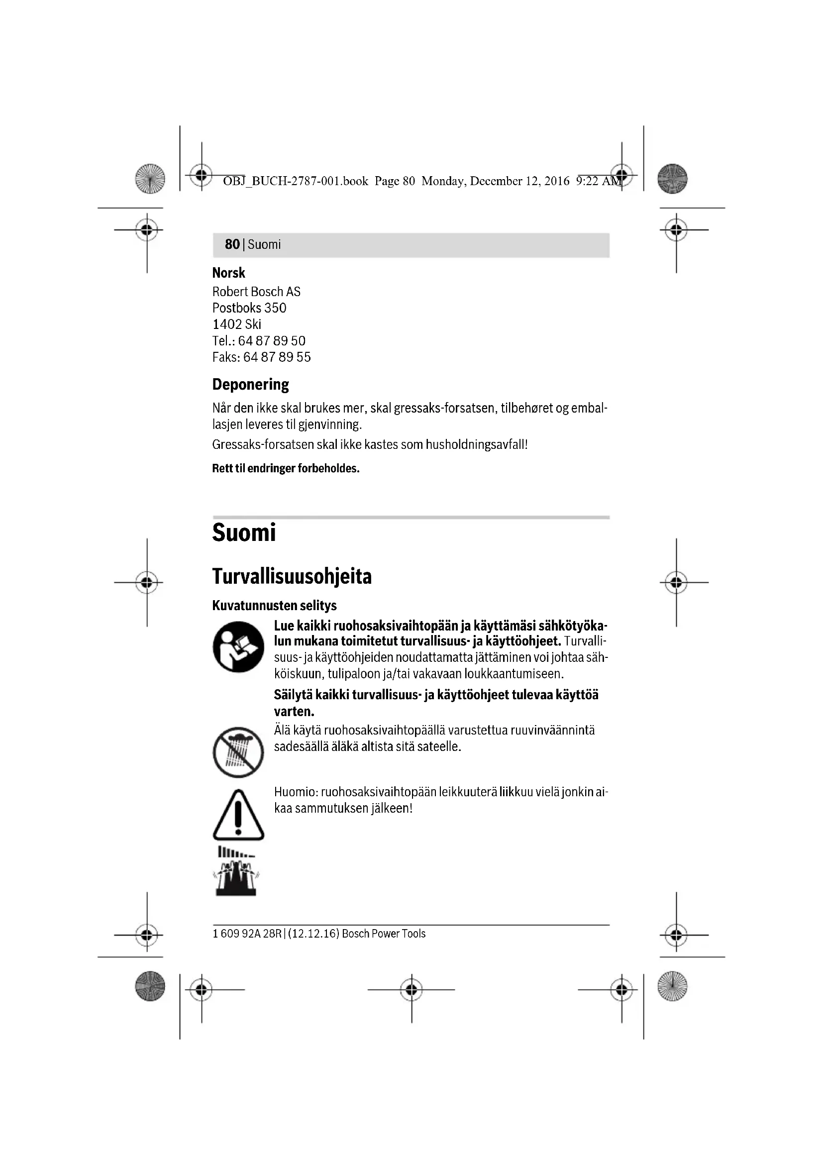 – Sett deretter gummikappen 9 på skrutrekkeren igjen. Bruk Igangsetting Sett skrumaskinen med gressaks-forsats på skjærekniven når du skal sette den fra deg. Da unngår du at fuktighet trenger inn i elektroverktøy- et. Inn-/utkobling – Trekk av knivbeskyttelsen 3 til skjærekniven 2. –For å ta i bruk skrumaskinen med gressaks-forsats trykker du låsebryte- ren 8 opp. – Still inn dreieretningen med dreieretningsbryteren 6. Gressaks-forsatsen kan brukes med både høyre- og venstrerotasjon. – Trykk på på-/av-bryteren 7, og hold den inne. – For å slå av gressaks-forsatsen slipper du på-/av-bryteren 7. – Sett dreieretningsomkobleren 6 i midtstilling. – Trykk låsebryteren 8 ned. – Sett knivbeskyttelsen 3 på skjærekniven 2. Det må høres at knivbeskyt- telsen 3 festes! Klipping av kanter Før skrumaskinen med gressaks-forsats langs plenkanten.Unngå at skjære- kniven berører belegningsstein, steiner eller murer, ettersom det forkorter skjæreknivens levetid betraktelig. Sett knivbeskyttelsen på skjærekniven igjen etter bruk. Fjerne blokkeringer på skjærekniven Du må aldri fjerne avklipt materiale mens skjærekniven går, og aldri holde fast materiale som skal klippes, mens skjærekniven går. Slipp på-/av-bryte- ren 7, og trykk låsebryteren 8 ned. OBJ_BUCH-2787-001.book Page 78 Monday, December 12, 2016 9:22 AMNorsk | 79 Bosch Power Tools 1 609 92A 28R | (12.12.16) Obs! Etter at skrumaskinen med gressaks-forsats er slått av, fortset- ter skjærekniven å bevege seg i noen sekunder. Du må ikke berøre skjærekniven mens den beveger seg. Vent til skjærekni- ven har stoppet før du fjerner blokkeringen. Service og vedlikehold Vedlikehold og rengjøring Bruk alltid vernehansker under vedlikeholds-/rengjøringsarbeider med gressaksforsatsen. Sett dreieretningsbryteren i midtstilling. Før vedlikeholds- eller rengjøringsarbeider trykker du låsebryteren ned og fjerner gressaks-forsatsen fra skrumaskinen. For godt resultat og sikkerhet under arbeidet må du sørge for at skjæ- rekniven alltid er ren. – Inspiser gressaks-forsatsen 1 jevnlig for åpenbare feil, som løse fester og slitte eller skadde komponenter. – Rengjør alltid gressaksforsatsen 1 med en pensel eller en myk børste og smør skjærekniven 2 med Bosch vedlikeholdsspray etter bruk. Bruk ikke løsemidler eller poleringsmidler! Tilbehør Kundeservice og rådgivning ved bruk Kundeservicen svarer på dine spørsmål om reparasjon og vedlikehold av pro- duktet samt om reservedeleler. Sprengskisser og informasjon om reservede- ler finner du også på: www.bosch-pt.com Bosch rådgivningsteamet hjelper deg gjerne ved spørsmål angående våre produkter og deres tilbehør. Ved alle forespørsler og reservedelsbestillinger må du oppgi det 10-sifrede produktnummeret som er angitt på gressaks-forsatsens typeskilt. Produktnummer Vedlikeholdsspray, 250 ml 1 609 200 399 OBJ_BUCH-2787-001.book Page 79 Monday, December 12, 2016 9:22 AM1 609 92A 28R | (12.12.16) Bosch Power Tools 80 | Suomi Norsk Robert Bosch AS Postboks 350 1402 Ski Tel.: 64 87 89 50 Faks: 64 87 89 55 Deponering Når den ikke skal brukes mer, skal gressaks-forsatsen, tilbehøret og embal- lasjen leveres til gjenvinning. Gressaks-forsatsen skal ikke kastes som husholdningsavfall! Rett til endringer forbeholdes. Suomi Turvallisuusohjeita Kuvatunnusten selitys Lue kaikki ruohosaksivaihtopään ja käyttämäsi sähkötyöka- lun mukana toimitetut turvallisuus- ja käyttöohjeet. Turvalli- suus- ja käyttöohjeiden noudattamatta jättäminen voi johtaa säh- köiskuun, tulipaloon ja/tai vakavaan loukkaantumiseen. Säilytä kaikki turvallisuus- ja käyttöohjeet tulevaa käyttöä varten. Älä käytä ruohosaksivaihtopäällä varustettua ruuvinväännintä sadesäällä äläkä altista sitä sateelle. Huomio: ruohosaksivaihtopään leikkuuterä liikkuu vielä jonkin ai- kaa sammutuksen jälkeen! OBJ_BUCH-2787-001.book Page 80 Monday, December 12, 2016 9:22 AMSuomi | 81 Bosch Power Tools 1 609 92A 28R | (12.12.16) Varmista, että sivulle sinkoutuvat vieraat esineet eivät loukkaa lä- hellä seisovia ihmisiä. Varoitus: pidä aina riittävä turvaväli ruohosaksivaihtopäällä va- rustettuun ruuvinvääntimeen, kun teet töitä sen kanssa. Ruohosaksivaihtopäällä varustetun ruuvin- vääntimen turvallisuusohjeet Tätä ruohosaksivaihtopäällä varustettua ruuvinväännintä ei ole tarkoitettu lasten ei- kä fyysisiltä, aistimillisilta tai henkisiltä ky- vyiltään rajoitteellisten tai puutteellisen ko- kemuksen tai tietämyksen omaavien henkilöiden käyttöön. Älä käytä ruohosaksivaihtopäätä tai ruoho- saksivaihtopäällä varustettu ruuvinvään- nintä, kun lähettyvilläsi on sivullisia tai koti- eläimiä. Valvo, etteivät lapset pääse leikkimään ruohosaksivaihtopään tai ruohosaksivaih- topäällä varustetun ruuvinvääntimen kans- sa. Poista ruohosaksivaihtopää ruuvinvääntimestä, kun lopetat työka- lun käytön. Varmista, että leikkuuterä on peitetty teräsuojalla, kun työkalu on poissa käytöstä. Tarkasta, että ruohosaksivaihtopään suojakilpi on vahingoittuma- ton. Suojakilven tehtävänä on suojata laitteen käyttäjää leikkuuterän ta- hattomalta kosketukselta. OBJ_BUCH-2787-001.book Page 81 Monday, December 12, 2016 9:22 AM1 609 92A 28R | (12.12.16) Bosch Power Tools 82 | Suomi Pidä leikkuuterä terävänä ja puhtaana. Kun leikkuuterä huolletaan kun- nolla ja pidetään terävänä, terän jumittumisvaara vähenee ja työkalun oh- jaus on helpompaa. Älä leikkaa puuta, kiveä, betonia tai kaapeleita. Leikkuuterä tylsyy ja voi jumittua. Käytä aina suojalaseja, tukevia jalkineita ja pitkiä housuja, kun työs- kentelet ruohosaksivaihtopäällä varustetulla ruuvinvääntimellä. Vältä virheellistä työasentoa ja seiso tukevasti. Säilytä tasapaino kai- kissa tilanteissa, etenkin rinteissä ja ojanreunoilla. Pystyt hallitse- maan ruohosaksivaihtopäällä varustettua ruuvinväänn