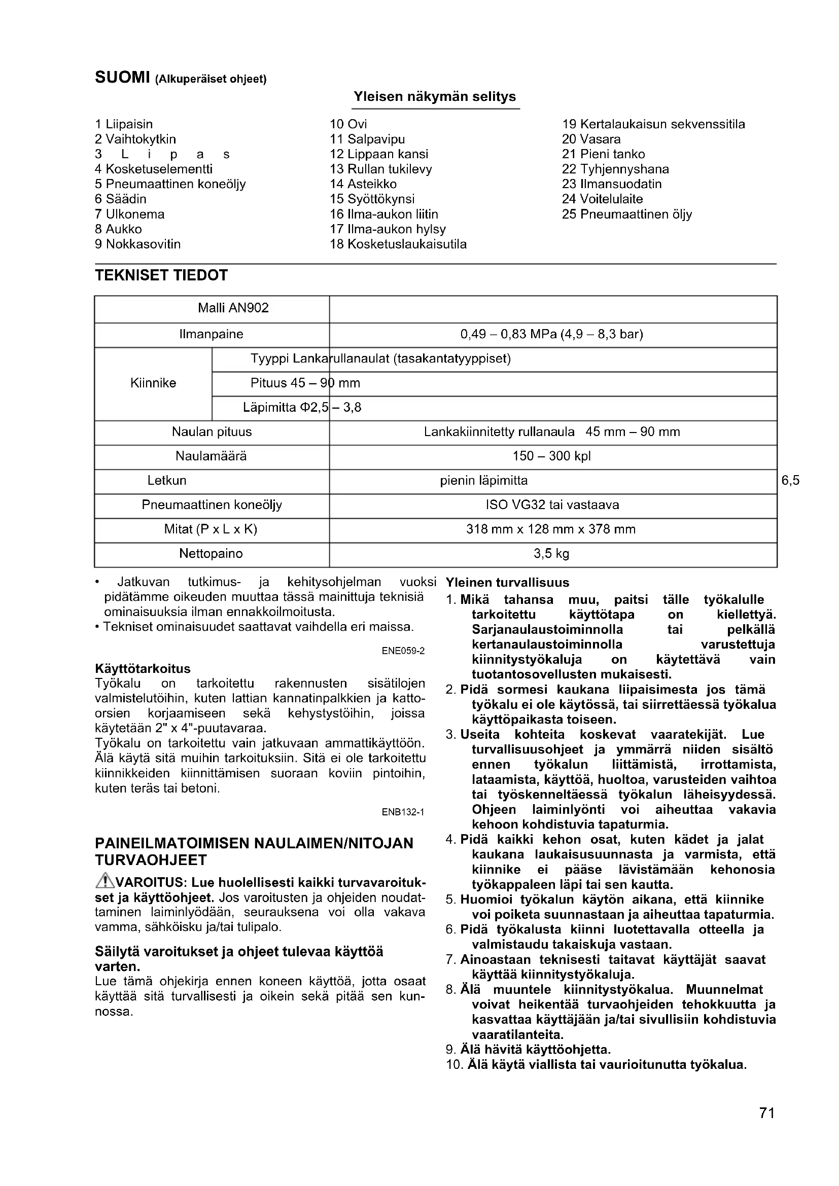 Malli AN902 Ilmanpaine 0,49 – 0,83 MPa (4,9 – 8,3 bar) Kiinnike Tyyppi Lankarullanaulat (tasakantatyyppiset) Pituus 45 – 90 mm Läpimitta Φ2,5 – 3,8 Naulan pituus Lankakiinnitetty rullanaula 45 mm – 90 mm Naulamäärä 150 – 300 kpl Letkun pienin läpimitta 6,5 mm Pneumaattinen koneöljy ISO VG32 tai vastaava Mitat (P x L x K) 318 mm x 128 mm x 378 mm Nettopaino 3,5 kg72