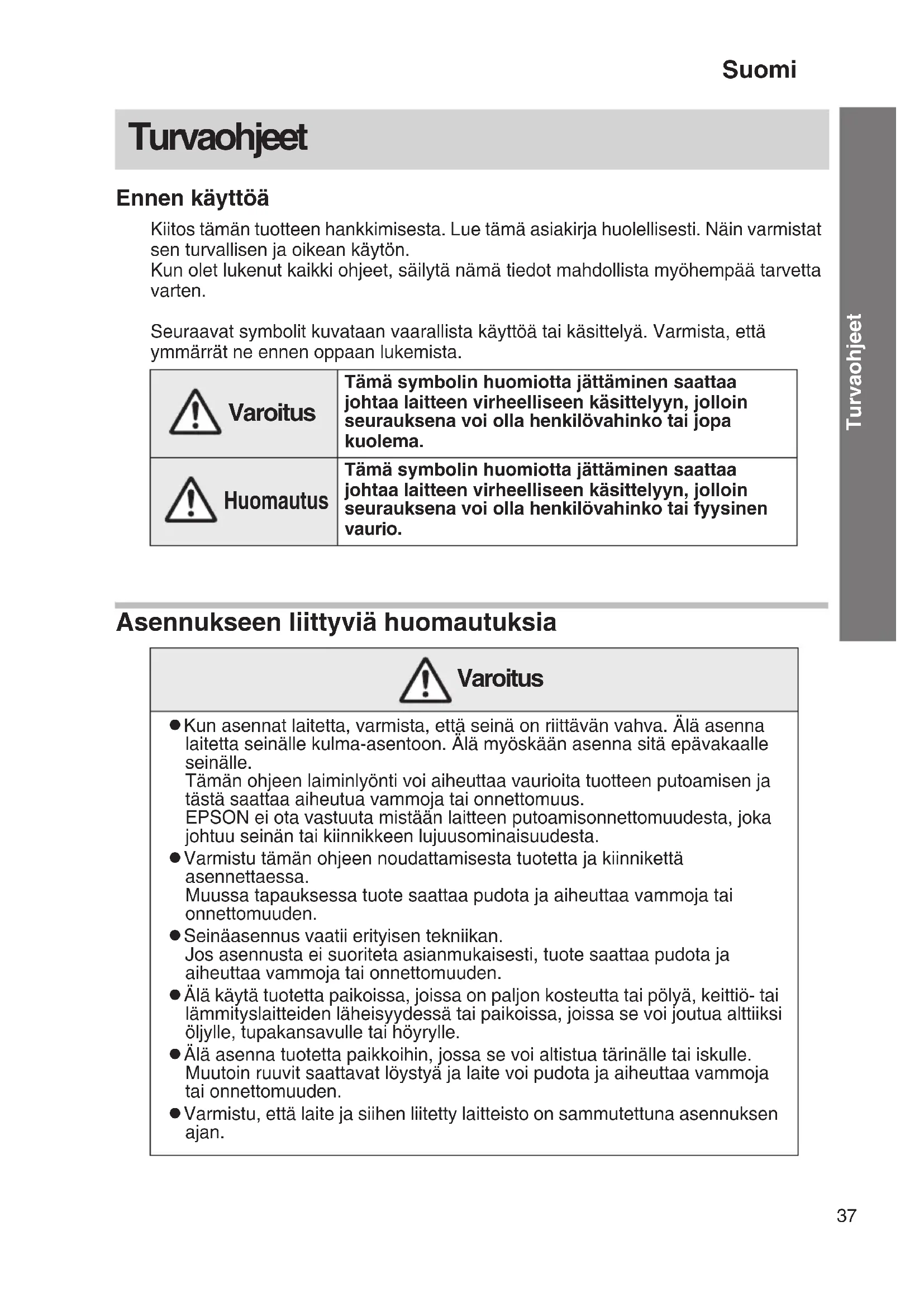 - Du må ikke trække i strømkablet, når du trækker stikket ud. Sørg for at holde i stikket, når du trækker det ud. v Du må ikke bruge et beskadiget strømkabel. Ellers kan det forårsage brand eller elektrisk stød. Hvis strømkablet er beskadiget (blotlagt leder, brud eller lignende), skal du kontakte forhandleren eller Epson's kundeservice. v Du må ikke lytte til gennemtrængende lyd ved høj lydstyrke i længere tid. Dette kan skade høreevnen. Pas på v Du må ikke indstille lydstyrken for højt til at begynde med. Ellers kan der forekomme pludselige gennemtrængende lyd, der kan beskadige høreevnen. Sørg for at skrue lydstyrken langt nok ned, før der modtages lyd fra den tilsluttede enhed, og skru gradvist op for den. v Du må ikke bruge højttalerne kontinuerligt ved en høj lydstyrke. Ellers kan det gå ud over deres karakteristika, eller levetiden kan blive markant forkortet. v Rengør produktet regelmæssigt. Hvis produktet ikke er blevet rengjort i længere tid, kan der ophobes støv, hvilket kan forårsage brand eller elektrisk stød. v Fjern alle kabler fra produktet før rengøring. v Når du rengør produktet, må du ikke anvende en fugtig klud eller opløsningsmidler som sprit, fortynder eller rensebenzin. v Højttalerne er ikke magnetisk afskærmede.36 Noter om opbevaring og transport Advarsel v Du må ikke efterlade produktet på steder, hvor det kan blive ekstremt varmt, f.eks. i et køretøj med lukkede vinduer, i direkte sollys eller i nærheden af udblæsningsåbningen på et airconditionanlæg. Pas på v Før du flytter produktet, skal du slukke for strømmen, trække stikket ud af stikkontakten og sørge for, at alle kabler er taget ud.37 Suomi Turvaohjeet Ennen käyttöä Kiitos tämän tuotteen hankkimisesta. Lue tämä asiakirja huolellisesti. Näin varmistat sen turvallisen ja oikean käytön.Kun olet lukenut kaikki ohjeet, säilytä nämä tiedot mahdollista myöhempää tarvetta varten.Seuraavat symbolit kuvataan vaarallista käyttöä tai käsittelyä. Varmista, että ymmärrät ne ennen oppaan lukemista. Asennukseen liittyviä huomautuksia Turvaohjeet Varoitus Tämä symbolin huomiotta jättäminen saattaa johtaa laitteen virheelliseen käsittelyyn, jolloin seurauksena voi olla henkilövahinko tai jopa kuolema. Huomautus Tämä symbolin huomiotta jättäminen saattaa johtaa laitteen virheelliseen käsittelyyn, jolloin seurauksena voi olla henkilövahinko tai fyysinen vaurio. Varoitus v Kun asennat laitetta, varmista, että seinä on riittävän vahva. Älä asenna laitetta seinälle kulma-asentoon. Älä myöskään asenna sitä epävakaalle seinälle.Tämän ohjeen laiminlyönti voi aiheuttaa vaurioita tuotteen putoamisen ja tästä saattaa aiheutua vammoja tai onnettomuus.EPSON ei ota vastuuta mistään laitteen putoamisonnettomuudesta, joka johtuu seinän tai kiinnikkeen lujuusominaisuudesta.v Varmistu tämän ohjeen noudattamisesta tuotetta ja kiinnikettä asennettaessa.Muussa tapauksessa tuote saattaa pudota ja aiheuttaa vammoja tai onnettomuuden.v Seinäasennus vaatii erityisen tekniikan.Jos asennusta ei suoriteta asianmukaisesti, tuote saattaa pudota ja aiheuttaa vammoja tai onnettomuuden.v Älä käytä tuotetta paikoissa, joissa on paljon kosteutta tai pölyä, keittiö- tai lämmityslaitteiden läheisyydessä tai paikoissa, joissa se voi joutua alttiiksi öljylle, tupakansavulle tai höyrylle.v Älä asenna tuotetta paikkoihin, jossa se voi altistua tärinälle tai iskulle.Muutoin ruuvit saattavat löystyä ja laite voi pudota ja aiheuttaa vammoja tai onnettomuuden.v Varmistu, että laite ja siihen liitetty laitteisto on sammutettuna asennuksen ajan.38 Käyttöä koskevia huomautuksia Varoitus v Varmista, että varmuuslangat on asennettu. Kun asennat varmuuslankoja, varmista, että seinä on riittävän vahva. v Kiristä ruuvit perusteellisesti. Kiristä ne varmuuden vuoksi uudelleen. Muutoin tuote saattaa pudota ja aiheuttaa vammoja tai onnettomuuden. v Älä levitä kierrelukitsinta, voiteluainetta tai öljyä tuotteen kiinnitysalueelle. Tämän ohjeen laiminlyönti voi aiheuttaa kotelon tai kiinnitysosan halkeamisen ja tuotteen toimintahäiriön. Tai tuote voi pudota ja aiheuttaa loukkaantumisen tai onnettomuuden. Huomautus v Varmista, että laitteen ja seinän välissä ei ole tyhjää tilaa. Varmista, että ruuveja ei kiristetä kulmassa. Tarkista, onko ruuvit kiristetty lujasti. Varoitus v Älä seiso tuotteen päällä tai ripusta siihen raskaita esineitä. v Älä löysää ruuveja asennuksen jälkeen. Tarkasta niiden tila ajoittain ja varmistu, että yksikään ruuvi ei ole löystynyt. Jos jokin on löystynyt, kiristä se uudelleen. v Älä avaa mitään tuotteen suojia lukuun ottamatta Käyttäjän oppaassa esitettyjä ja älä yritä purkaa tai muuttaa tuotetta. Avaaminen saattaa aiheuttaa tulipalon, sähköiskun tai onnettomuuden, koska eräät sisäosat käyttävät korkeajännitettä. Anna pätevien huoltohenkilöiden suorittaa kaikki korjaukset. v Varo läikyttämästä laitteelle mitään nestettä, kuten tee, kahvi tai mehu. Älä myöskään ruiskuta aerosolihyönteismyrkkyä. Näiden ohjeiden laiminlyönti voi aiheuttaa toimintahäiriön, tulipalon tai sähköiskun. Jos laitteelle on läikytetty mitään nestettä, kytke virta pois päältä ja irrota AC-adapteri seinästä välittömästi. Ota sitten yhteyttä jälleenmyyjään. Mikäli käyttöä jatketaan, tästä saattaa aiheutua tulipalo tai sähköisku. v Seuraavassa esitetyissä tilanteissa kytke virta pois päältä välittömästi, irrota virtajohto laitteesta, irrota kaikki kaapelit ja ota sitten yhteyttä jälleenmyyjään tai EPSONIN huoltopalveluun: