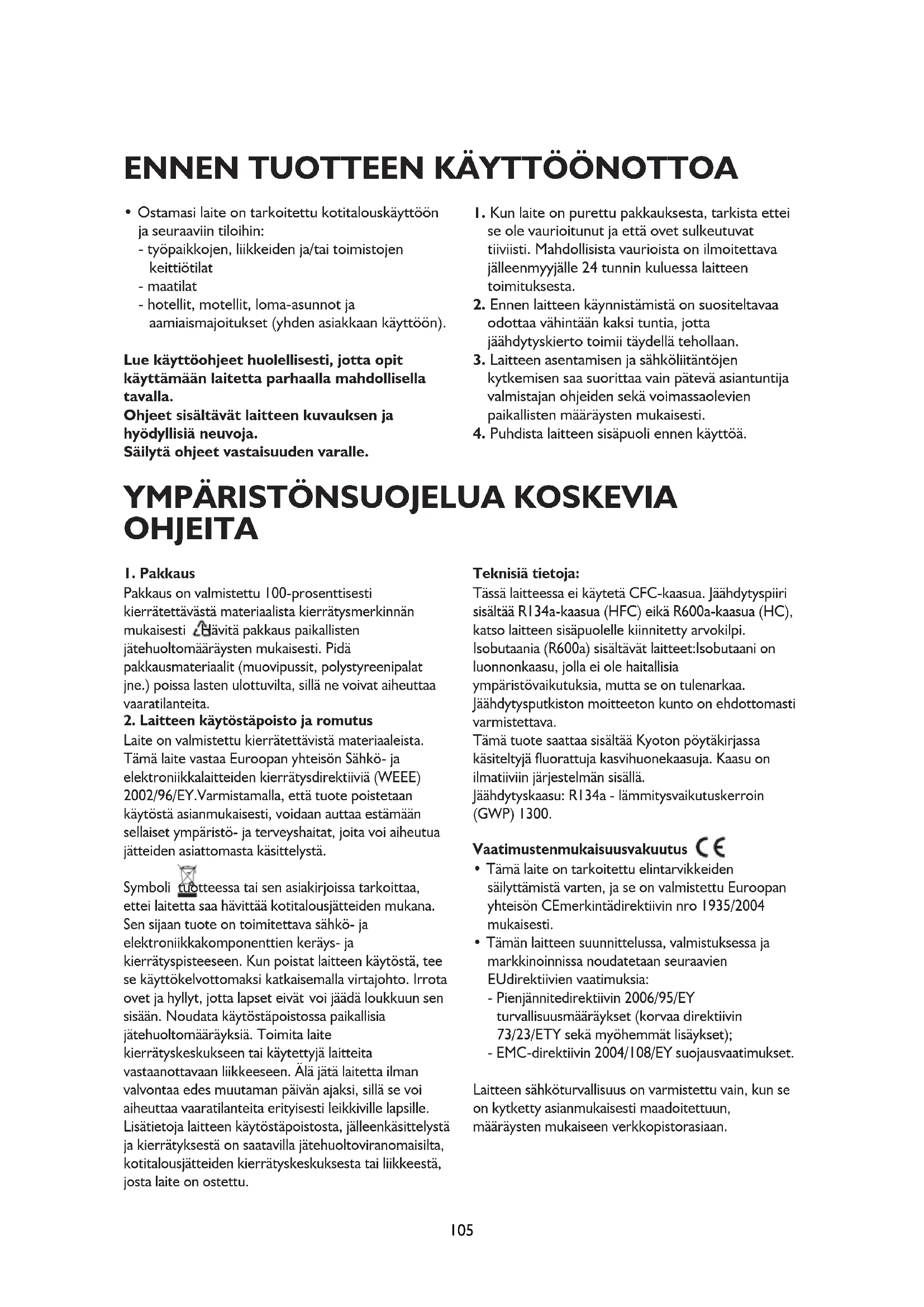 Laite on valmistettu kierrätettävistä materiaaleista. Tämä laite vastaa Euroopan yhteisön Sähkö- ja elektroniikkalaitteiden kierrätysdirektiiviä (WEEE) 2002/96/EY.Varmistamalla, että tuote poistetaan käytöstä asianmukaisesti, voidaan auttaa estämään sellaiset ympäristö- ja terveyshaitat, joita voi aiheutua jätteiden asiattomasta käsittelystä. Symboli tuotteessa tai sen asiakirjoissa tarkoittaa, ettei laitetta saa hävittää kotitalousjätteiden mukana. Sen sijaan tuote on toimitettava sähkö- ja elektroniikkakomponenttien keräys- ja kierrätyspisteeseen. Kun poistat laitteen käytöstä, tee se käyttökelvottomaksi katkaisemalla virtajohto. Irrota ovet ja hyllyt, jotta lapset eivät voi jäädä loukkuun sen sisään. Noudata käytöstäpoistossa paikallisia jätehuoltomääräyksiä. Toimita laite kierrätyskeskukseen tai käytettyjä laitteita vastaanottavaan liikkeeseen. Älä jätä laitetta ilman valvontaa edes muutaman päivän ajaksi, sillä se voi aiheuttaa vaaratilanteita erityisesti leikkiville lapsille. Lisätietoja laitteen käytöstäpoistosta, jälleenkäsittelystä ja kierrätyksestä on saatavilla jätehuoltoviranomaisilta, kotitalousjätteiden kierrätyskeskuksesta tai liikkeestä, josta laite on ostettu. Teknisiä tietoja: Tässä laitteessa ei käytetä CFC-kaasua. Jäähdytyspiiri sisältää R134a-kaasua (HFC) eikä R600a-kaasua (HC), katso laitteen sisäpuolelle kiinnitetty arvokilpi. Isobutaania (R600a) sisältävät laitteet:Isobutaani on luonnonkaasu, jolla ei ole haitallisia ympäristövaikutuksia, mutta se on tulenarkaa. Jäähdytysputkiston moitteeton kunto on ehdottomasti varmistettava. Tämä tuote saattaa sisältää Kyoton pöytäkirjassa käsiteltyjä fluorattuja kasvihuonekaasuja. Kaasu on ilmatiiviin järjestelmän sisällä. Jäähdytyskaasu: R134a - lämmitysvaikutuskerroin (GWP) 1300. Vaatimustenmukaisuusvakuutus