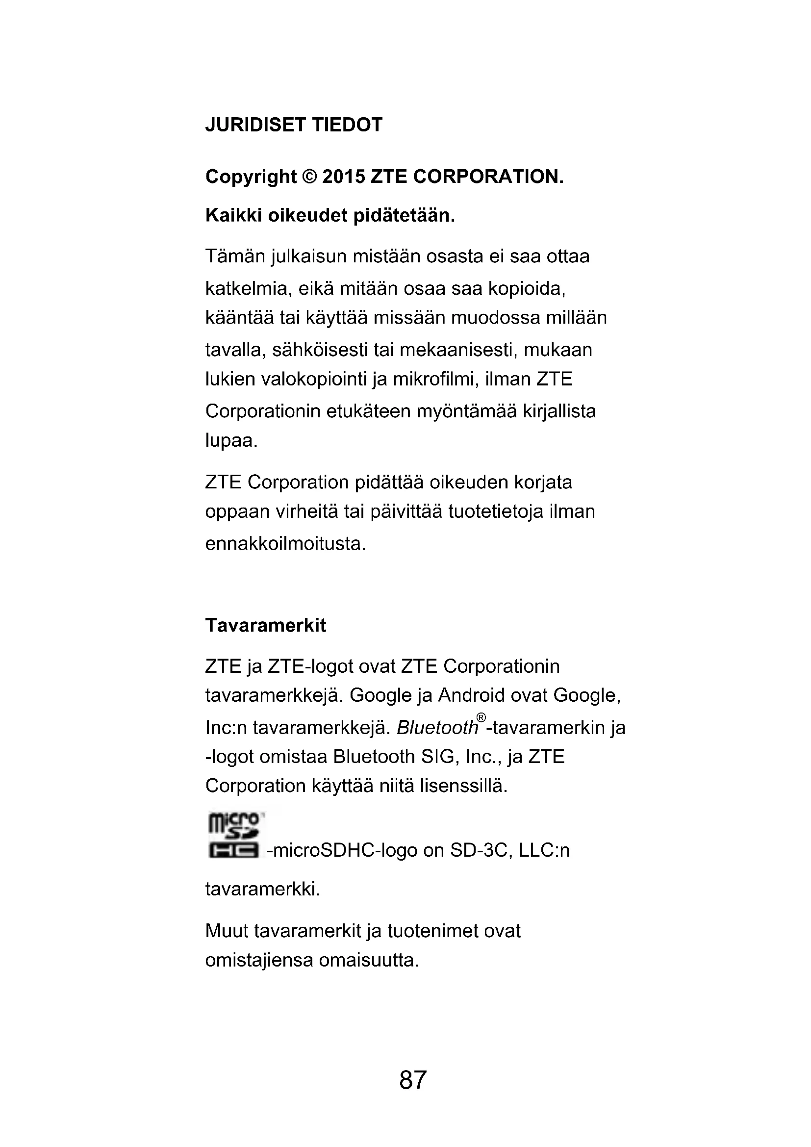 -tavaramerkin ja -logot omistaa Bluetooth SIG, Inc., ja ZTE Corporation käyttää niitä lisenssillä. -microSDHC-logo on SD-3C, LLC:n tavaramerkki. Muut tavaramerkit ja tuotenimet ovat omistajiensa omaisuutta. 87Tarjoamme älylaitteidemme käyttäjille asiakaspalvelua. Lisätietoja palveluista ja tuetuista tuotemalleista saat ZTE:n virallisesta sivustosta osoitteessa www.ztedevice.com. Sivustossa olevat tiedot ovat ensisijaisia. Voit ladata käyttöoppaan osoitteesta http://www.ztedevice.com. Valitse aloitussivulla Service Support>User'smanual ja etsi tukitietoja valitsemalla sijainti, tuotteen tyyppi ja nimi. Vastuuvapauslauseke ZTE Corporation kieltää nimenomaisesti kaiken vastuun ohjelmiston luvattomista muutoksista johtuvista vioista ja vahingoista.