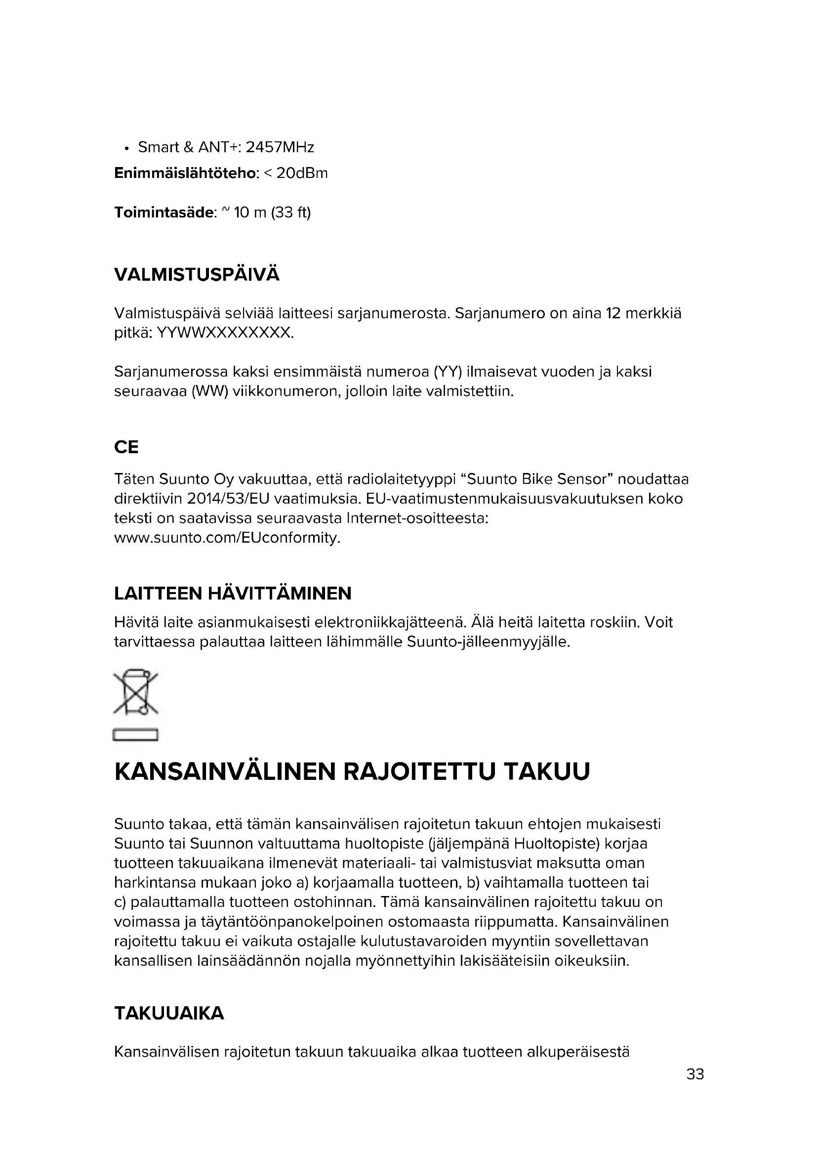Hävitä laite asianmukaisesti elektroniikkajätteenä. Älä heitä laitetta roskiin. Voit tarvittaessa palauttaa laitteen lähimmälle Suunto-jälleenmyyjälle.