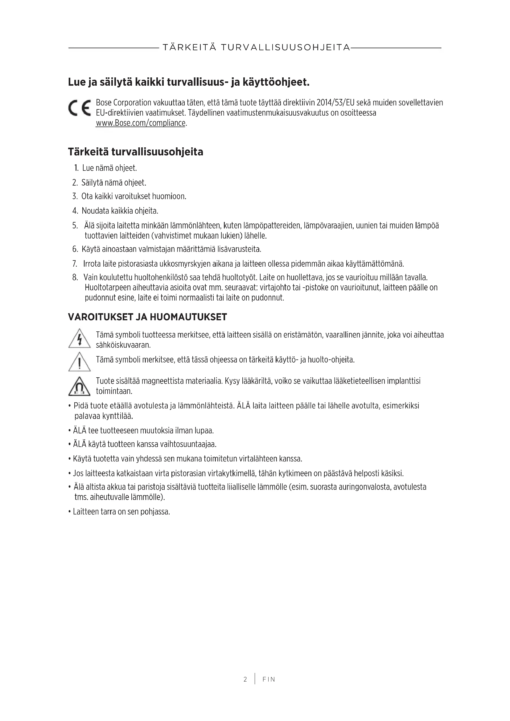 FIN Lue ja säilytä kaikki turvallisuus- ja käyttöohjeet. Bose Corporation vakuuttaa täten, että tämä tuote täyttää direktiivin 2014/53/EU sekä muiden sovellettavien EU-direktiivien vaatimukset. Täydellinen vaatimustenmukaisuusvakuutus on osoitteessa www.Bose.com/compliance. Tärkeitä turvallisuusohjeita