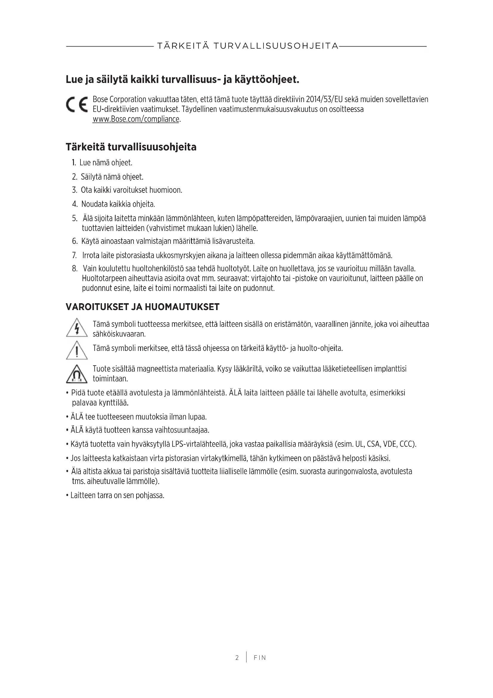 FIN Lue ja säilytä kaikki turvallisuus- ja käyttöohjeet. Bose Corporation vakuuttaa täten, että tämä tuote täyttää direktiivin 2014/53/EU sekä muiden sovellettavien EU-direktiivien vaatimukset. Täydellinen vaatimustenmukaisuusvakuutus on osoitteessa www.Bose.com/compliance. Tärkeitä turvallisuusohjeita
