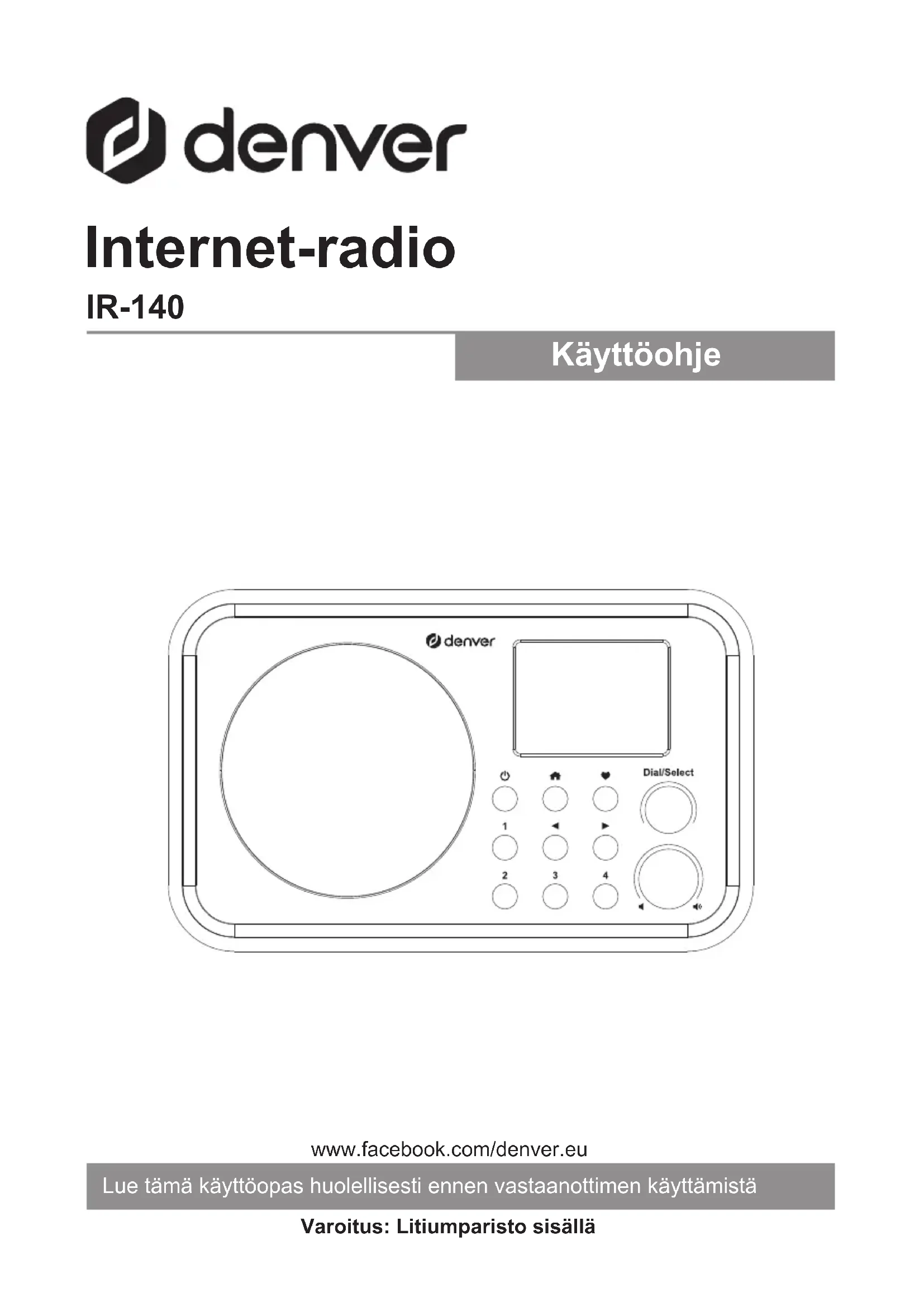 Omega 5A, Soeften DK-8382 Hinnerup Dinamarca www.facebook.com/denver.eu www.denver.eu ESP-12IR-140 Internet-radio Käyttöohje Lue tämä käyttöopas huolellisesti ennen vastaanottimen käyttämistä Varoitus: Litiumparisto sisällä www.facebook.com/denver.euTurvallisuustiedot Lue turvallisuusohjeet huolellisesti ennen tuotteen ensimmäistä käyttökertaa ja säilytä ohjeet myöhempiä tarpeita varten.