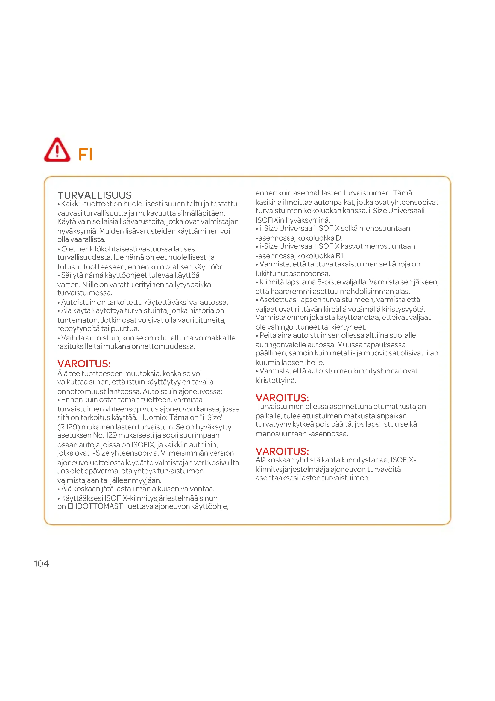 - Käyttääksesi ISOFIX-kiinnitysjärjestelmää sinun on EHDOTTOMASTI luettava ajoneuvon käyttöohje, ennen kuin asennat lasten turvaistuimen. Tämä käsikirja ilmoittaa autonpaikat, jotka ovat yhteensopivat turvaistuimen kokoluokan kanssa, i-Size Universaali ISOFIXin hyväksyminä.