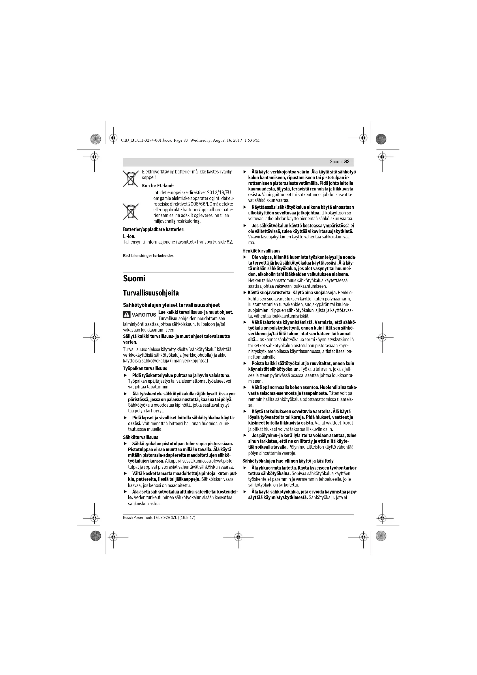 Merk: Av sikkerhetsgrunner kan på-/av-bryteren 3 ikke låses, men må stadig holdes trykt inne i løpet av driften. Slå elektroverktøyet kun på når du bruker det for å spare ener- gi. Utløpsbremse En integrert utløpsbremse forkorter tiden sagbladet fortset- ter å rotere etter at elektroverktøyet er slått av. Indikator for temperaturovervåking Den røde LED’en på indikatoren for temperaturovervåking 28 signaliserer at batteriet eller elektronikken til elektroverktøy- et (ved innsatt batteri) ikke er i optimalt temperaturområde. I dette tilfellet arbeider elektroverktøyet ikke eller ikke med full effekt. Temperaturovervåking av batteriet: – Den røde LED’en 28 lyser kontinuerlig når batteriet settes inn i ladeapparatet: Batteriet er utenfor ladetemperatur- området på 0 °C til 45 °C og kan ikke opplades. –Den røde lysdioden 28 blinker når knappen 26 eller av/på- bryteren 3 trykkes (når batteriet er satt inn): Batteriet har ikke tillatt driftstemperatur. – Ved en batteri-temperatur på over 70 °C kopler el-verktøy- et ut til batteriet igjen er i et optimalt temperaturområde. Temperaturovervåking av elektronikken til elektroverktøyet: –Den røde LED 28 lyser kontinuerlig når på-/av-bryteren 3 trykkes: Temperaturen på elektronikken til elektroverktøy- et er mindre enn 5 °C eller mer enn 75 °C. 45°0° 0° 45° OBJ_BUCH-3274-001.book Page 81 Wednesday, August 16, 2017 1:53 PM82 | Norsk 1 609 92A 3ZU | (16.8.17) Bosch Power Tools – Ved en temperatur på over 90 °C kopler elektronikken til elektroverktøyet ut, til dette er i godkjent driftstempera- turområde igjen. Beskyttelse mot total utlading Litium-ion-batteriet er beskyttet av «Electronic Cell Protecti- on (ECP)» mot total utlading. Når batteriet er utladet, kobles elektroverktøyet ut med en beskyttelseskobling: Innsatsverk- tøyet beveger seg ikke lenger. Arbeidshenvisninger Beskytt sagbladet mot slag og støt. Før elektroverktøyet jevnt og med svak fremskyvning i skjæ- reretningen. For sterk fremskyvning reduserer innsatsverk- tøyenes levetid sterkt og kan skade elektroverktøyet. Sageffekten og skjærekvaliteten er vesentlig avhengig av til- standen og tannformen på sagbladet. Bruk derfor kun skarpe sagblad som er egnet for materialet som skal bearbeides. Saging av tre Riktig valg av sagblad retter seg etter tretype, trekvalitet og om det er nødvendig med langsgående eller tverrgående snitt. Ved langsgående snitt i furu oppstår lange, spiralformede spon. Bøk- og eikstøv er spesielt helsefarlig, pass derfor på å arbei- de med støvavsug. Saging med parallellanlegg (se bilde D) Parallellanlegg 11 muliggjør eksakte snitt langs kanten av et arbeidsstykke, hhv. skjæring av like store striper. Saging med hjelpeanlegg (se bilde E) Til bearbeidelse av store arbeidsstykker eller til skjæring av rette kanter kan du feste et brett eller en list som hjelpeanlegg på arbeidsstykket og føre sirkelsagen med grunnplaten langs hjelpeanlegget. Opphengskrok (se bilde F) Med opphengskroken 1 kan du f. eks. henge elektroverktøyet opp på en stige. Slå da opphengskroken 1 ut i ønsket posi- sjon. Ved opphengt elektroverktøy må du passe på at sagbla- det er beskyttet mot uforvarende berøring. Det er fare for skader. Slå opphengskroken 1 inn igjen når du vil arbeide med elek- troverktøyet. Regler for optimal bruk av oppladbare batterier Beskytt batteriet mot fuktighet og vann. Batteriet må kun lagres i et temperaturområde på –20 °C til 50 °C. Ikke la batteriet f.eks. ligge i bilen om sommeren. Rengjør ventilasjonssprekkene på batteriet regelmessig med en myk, ren og tørr pensel. En vesentlig kortere driftstid etter oppladingen er et tegn på at batteriet er oppbrukt og må skiftes ut. Følg informasjonene om kassering. Service og vedlikehold Vedlikehold og rengjøring Ta batteriet ut av elektroverktøyet før alle arbeider på elektroverktøyet utføres (f. eks. vedlikehold, verktøy- skifte osv.) hhv. ved transport og oppbevaring. Det er fare for skader hvis du trykker på på-/av-bryteren ved en feiltagelse. Hold elektroverktøyet og ventilasjonsspaltene alltid rene, for å kunne arbeide bra og sikkert. Vernedekselet må alltid bevege seg fritt og kunne stenges au- tomatisk. Hold derfor området rundt vernedekselet alltid rent. Fjern støv og spon ved å blåse gjennom med trykkluft el- ler bruk en pensel. Ikke besjiktede sagblad kan beskyttes mot korrosjon med et tynt sjikt syrefri olje. Fjern oljen igjen før sagingen, slik at treet ikke blir flekkete. Harpiks- eller limrester på sagbladet innskrenker snittkvalite- ten. Rengjør derfor sagbladene rett etter bruk. Kundeservice og rådgivning ved bruk Kundeservicen svarer på dine spørsmål om reparasjon og vedlikehold av produktet samt om reservedeleler. Spreng- skisser og informasjon om reservedeler finner du også på: www.bosch-pt.com Bosch rådgivningsteamet hjelper deg gjerne ved spørsmål an- gående våre produkter og deres tilbehør. Ved alle forespørsler og reservedelsbestillinger må du oppgi det 10-sifrede produktnummeret som er angitt på produktets typeskilt. Norsk Robert Bosch AS Postboks 350 1402 Ski Tel.: 64 87 89 50 Faks: 64 87 89 55 Transport Li-ion-batteriene i verktøyet underligger kravene for farlig gods. Batteriene kan transporteres på veier av brukeren uten ytterligere krav. Ved forsendelse gjennom tredje personer (f. eks.: lufttran- sport eller spedisjon) må det oppfylles spesielle krav til em- ballasje og merking. Du må da konsultere en ekspert for farlig gods ved forberedelse av forsendelsen. Send batterier kun hvis huset ikke er skadet. Lim igjen de åp- ne kontaktene og pakk batteriet slik at det ikke beveger seg i emballasjen. Ta også hensyn til eventuelle videreførende nasjonale for- skrifter. Deponering Elektroverktøy, batterier, tilbehør og emballasje må leveres inn til miljøvennlig gjenvinning. OBJ_BUCH-3274-001.book Page 82 Wednesday, August 16, 2017 1:53 PMSuomi | 83