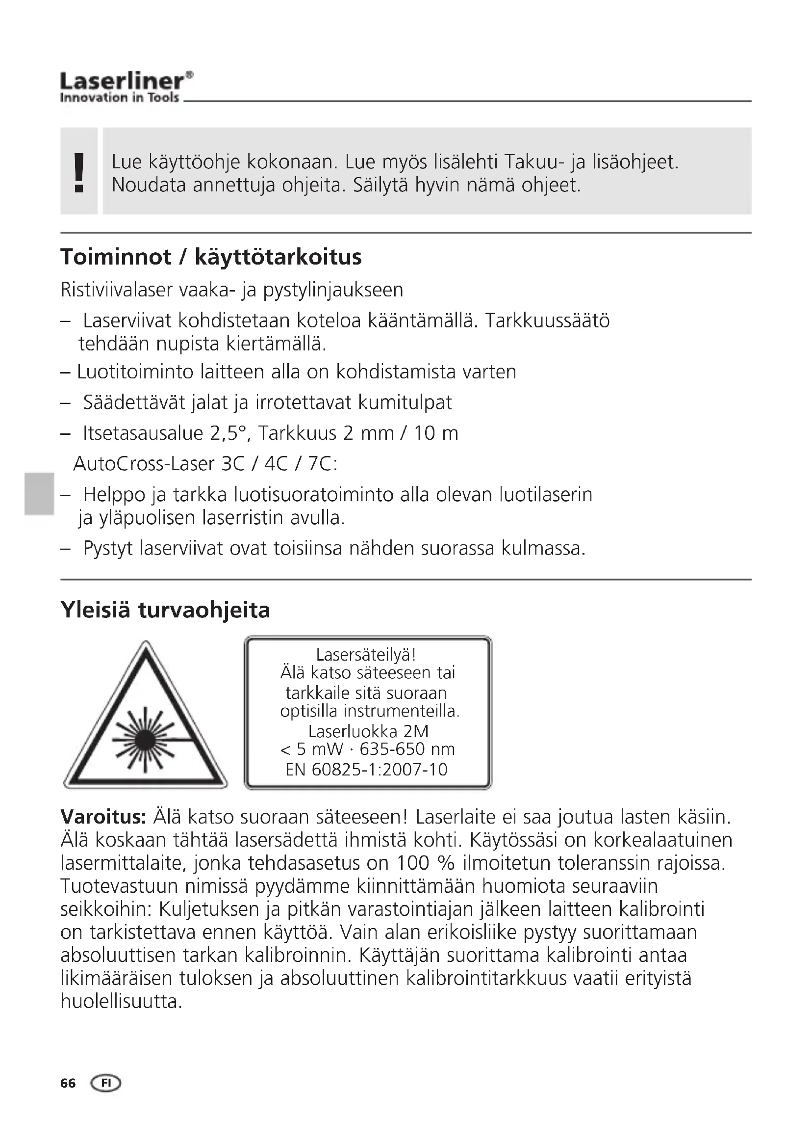 Manual_ACL-2C,3C,4C,7C_Rev.0512_DE-SE.indd 65 31.05.12 14:4866 Toiminnot / käyttötarkoitus Ristiviivalaser vaaka- ja pystylinjaukseen – Laserviivat kohdistetaan koteloa kääntämällä. Tarkkuussäätö tehdään nupista kiertämällä. – Luotitoiminto laitteen alla on kohdistamista varten – Säädettävät jalat ja irrotettavat kumitulpat – Itsetasausalue 2,5°, Tarkkuus 2 mm / 10 m AutoCross-Laser 3C / 4C / 7C: – Helppo ja tarkka luotisuoratoiminto alla olevan luotilaserin ja yläpuolisen laserristin avulla. – Pystyt laserviivat ovat toisiinsa nähden suorassa kulmassa. Yleisiä turvaohjeita Varoitus: Älä katso suoraan säteeseen! Laserlaite ei saa joutua lasten käsiin. Älä koskaan tähtää lasersädettä ihmistä kohti. Käytössäsi on korkealaatuinen lasermittalaite, jonka tehdasasetus on 100 % ilmoitetun toleranssin rajoissa. Tuotevastuun nimissä pyydämme kiinnittämään huomiota seuraaviin seikkoihin: Kuljetuksen ja pitkän varastointiajan jälkeen laitteen kalibrointi on tarkistettava ennen käyttöä. Vain alan erikoisliike pystyy suorittamaan absoluuttisen tarkan kalibroinnin. Käyttäjän suorittama kalibrointi antaa likimääräisen tuloksen ja absoluuttinen kalibrointitarkkuus vaatii erityistä huolellisuutta. Lasersäteilyä! Älä katso säteeseen tai tarkkaile sitä suoraan optisilla instrumenteilla. Laserluokka 2M < 5 mW · 635-650 nm EN 60825-1:2007-10 Lue käyttöohje kokonaan. Lue myös lisälehti Takuu- ja lisäohjeet. Noudata annettuja ohjeita. Säilytä hyvin nämä ohjeet.
