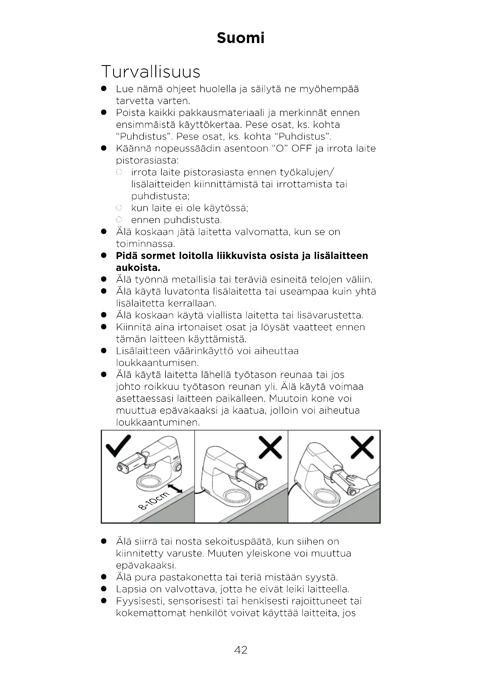 Älä käytä laitetta lähellä työtason reunaa tai jos johto roikkuu työtason reunan yli. Älä käytä voimaa asettaessasi laitteen paikalleen. Muutoin kone voi muuttua epävakaaksi ja kaatua, jolloin voi aiheutua loukkaantuminen. 8-10cm