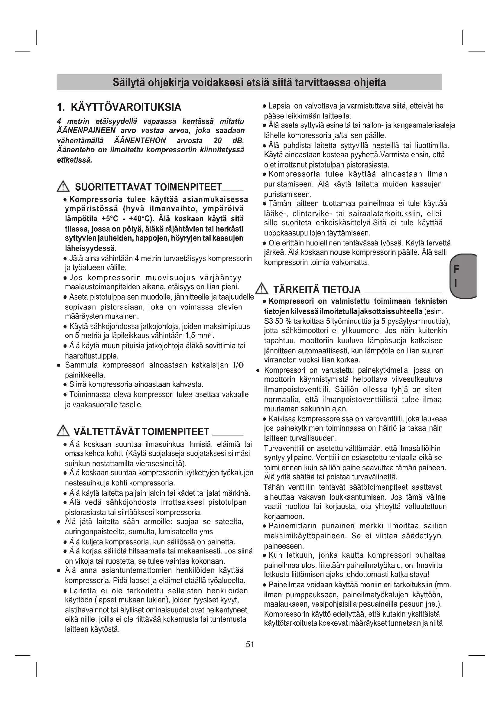 4 metrin etäisyydellä vapaassa kentässä mitattu ÄÄNENPAINEEN arvo vastaa arvoa, joka saadaan vähentämällä ÄÄNENTEHON arvosta 20 dB. Äänenteho on ilmoitettu kompressoriin kiinnitetyssä etiketissä. SUORITETTAVAT TOIMENPITEET ● Kompressoria tulee käyttää asianmukaisessa ympäristössä (hyvä ilmanvaihto, ympäröivä lämpötila +5°C - +40°C). Älä koskaan käytä sitä tilassa, jossa on pölyä, äläkä räjähtävien tai herkästi syttyvien jauheiden, happojen, höyryjen tai kaasujen läheisyydessä. ● Jätä aina vähintään 4 metrin turvaetäisyys kompressorin ja työalueen välille. ● Jos kompressorin muovisuojus värjääntyy maalaustoimenpiteiden aikana, etäisyys on liian pieni. ● Aseta pistotulppa sen muodolle, jännitteelle ja taajuudelle sopivaan pistorasiaan, joka on voimassa olevien määräysten mukainen. ● Käytä sähköjohdossa jatkojohtoja, joiden maksimipituus on 5 metriä ja läpileikkaus vähintään 1,5 mm