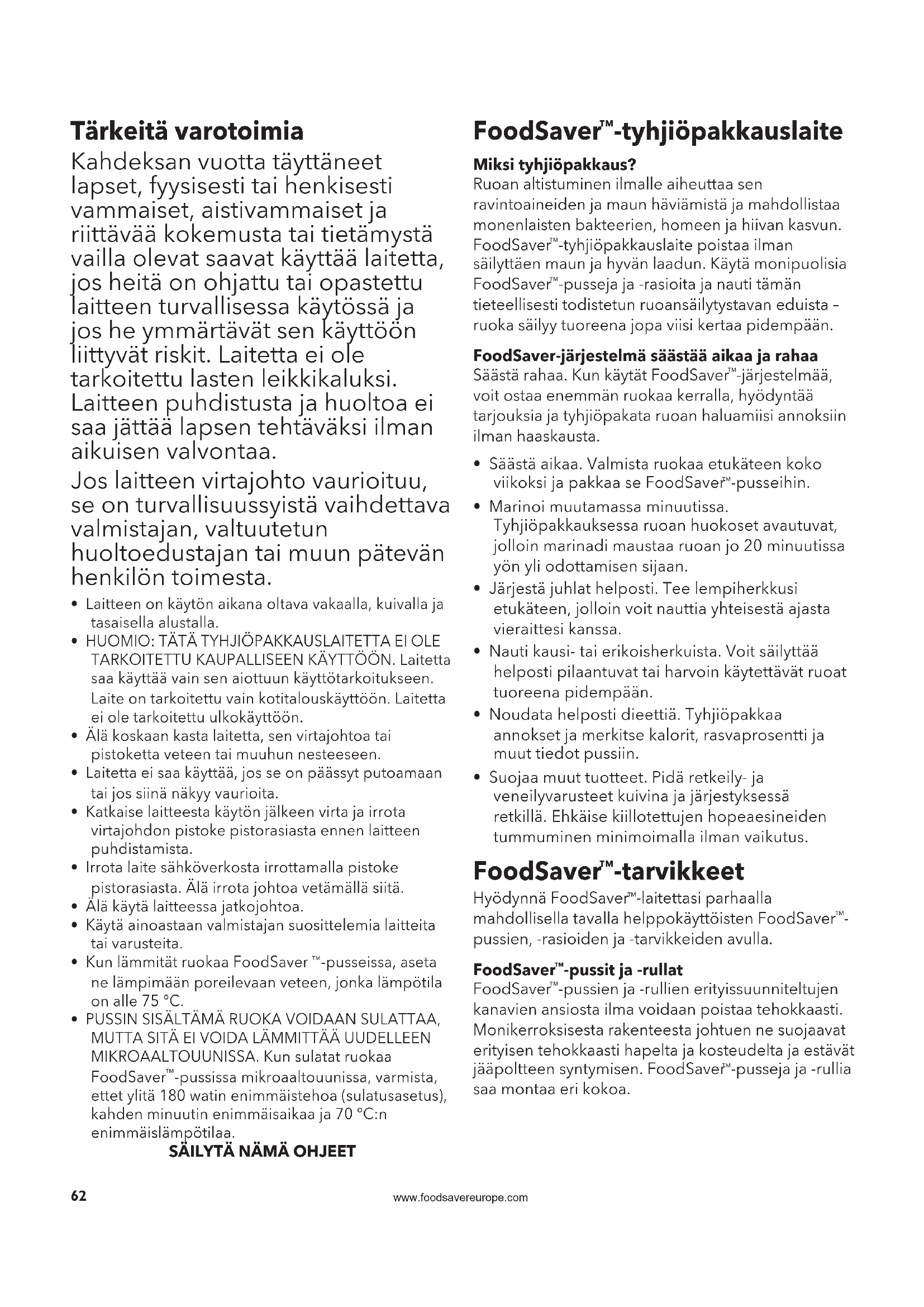 Kääri virtajohto laitteen pohjassa oleviin kiinnikkeisiin. Laitetta voidaan säilyttää pystyssä kuvan osoittamalla tavalla. Säilytysohjeita ja -vinkkejä Tyhjiöpakkaaminen ja ruoan turvallisuus Tyhjiöpakkausprosessi pidentää ruoan käyttöikää poistamalla saumatusta astiasta suurimman osan ilmasta. Tämä vähentää hapettumista, mikä vaikuttaa ruoan ravintoarvoihin, makuun ja yleislaatuun. Ilman poistaminen voi estää myös mikro-organismien kasvamisen. Ne voivat aiheuttaa ongelmia tietyissä olosuhteissa: Ruokien turvallista säilyttämistä varten on olennaista ylläpitää alhaisia lämpötiloja. Voit vähentää merkittävästi mikro-organismien kasvua 4°C:n tai sitä alhaisemmissa lämpötiloissa. Pakastaminen –17°C:n lämpötilassa ei tapa mikro- organismeja, mutta pysäyttää niiden kasvun. Pakasta aina pilaantuvat tyhjiöpakatut elintarvikkeet pitkäaikaista säilytystä varten, ja pidä ne jääkaapissa sulatuksen jälkeen. On tärkeää huomata, että tyhjiöpakkaus EI korvaa säilöntää eikä voi kumota elintarvikkeiden pilaantumisprosessia. Se voi ainoastaan hidastaa laatumuutoksia. On vaikeaa ennustaa, miten pitkään elintarvikkeet säilyttävät huippulaatuisen makunsa, ulkonäkönsä tai rakenteensa, sillä tähän vaikuttavat ruoan ikä ja kunto tyhjiöpakkauspäivänä. Tärkeää: Tyhjiöpakkaus EI korvaa elintarvikkeiden säilyttämistä jääkaapissa tai pakastamista. Kaikki jäähdytystä edellyttävät pilaantuvat elintarvikkeet on edelleen säilytettävä jääkaapissa tai pakastettava tyhjiöpakkaamisen jälkeen. Sairastumisen välttämiseksi pusseja ei tule käyttää uudelleen, jos niissä on säilytetty raakaa lihaa, raakaa kalaa tai rasvaisia ruokia. Älä käytä uudelleen pusseja, joita on kuumennettu mikroaaltouunissa tai vesihauteessa. Tyhjiöpakattujen ruokien sulatus ja kuumennus Sulata ruoat aina jääkaapissa tai mikroaaltouunissa. Älä sulata pilaantuvia ruokia huoneenlämmössä. Pussin sisältämä ruoka voidaan sulattaa, mutta sitä ei voida lämmittää uudelleen mikroaaltouunissa. Kun sulatat ruokaa FoodSaver