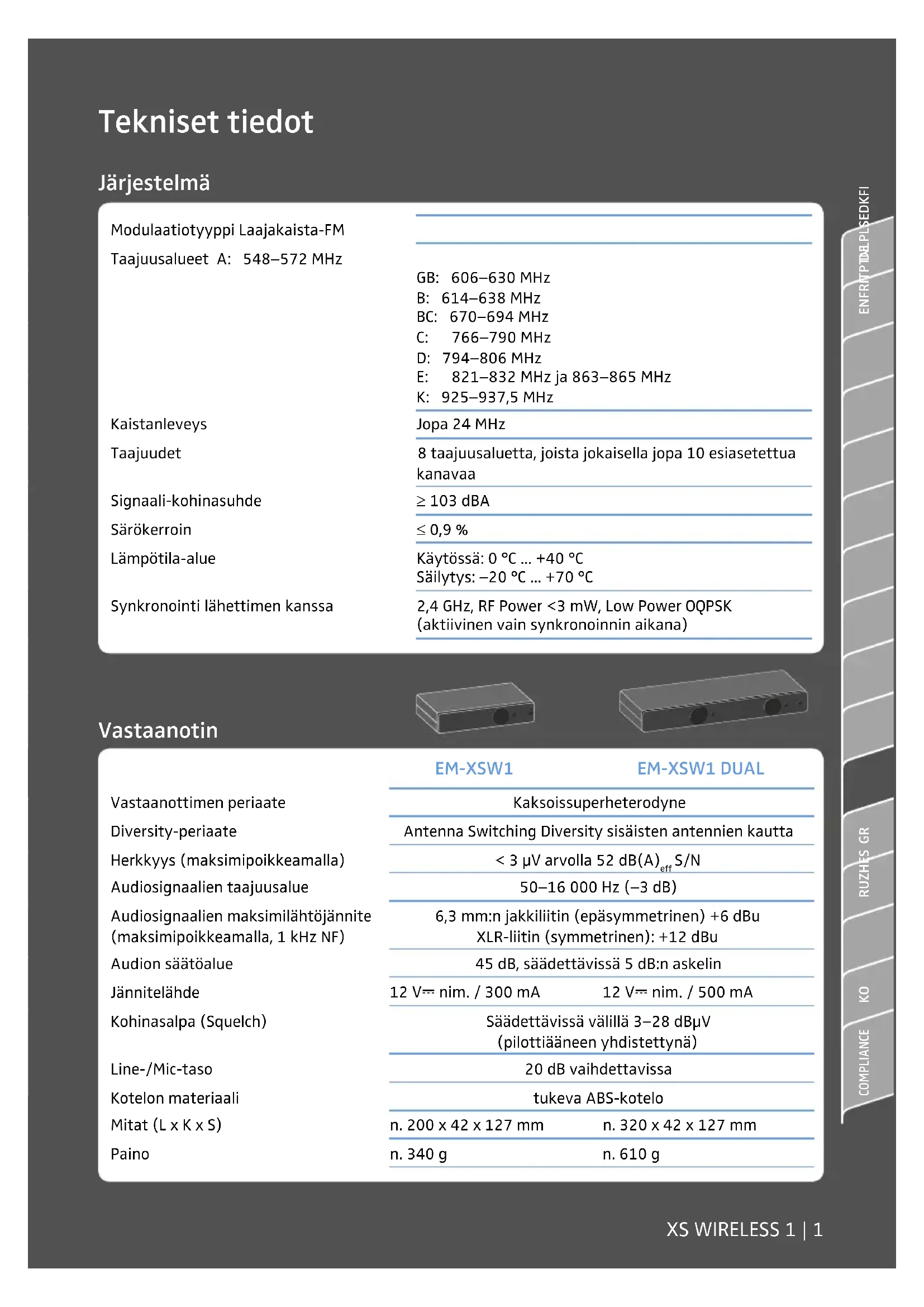 COMPLIANCE Tekniset tiedot Modulaatiotyyppi Laajakaista-FM Taajuusalueet A: 548–572 MHz GB: 606–630 MHz B: 614–638 MHz BC: 670–694 MHz C: 766–790 MHz D: 794–806 MHz E: 821–832 MHz ja 863–865 MHz K: 925–937,5 MHz Kaistanleveys Jopa 24 MHz Taajuudet 8 taajuusaluetta, joista jokaisella jopa 10 esiasetettua kanavaa Signaali-kohinasuhde ≥ 103 dBA Särökerroin ≤ 0,9 % Lämpötila-alue Käytössä: 0 °C ... +40 °C Säilytys: –20 °C ... +70 °C Synkronointi lähettimen kanssa 2,4 GHz, RF Power <3 mW, Low Power OQPSK (aktiivinen vain synkronoinnin aikana) Järjestelmä