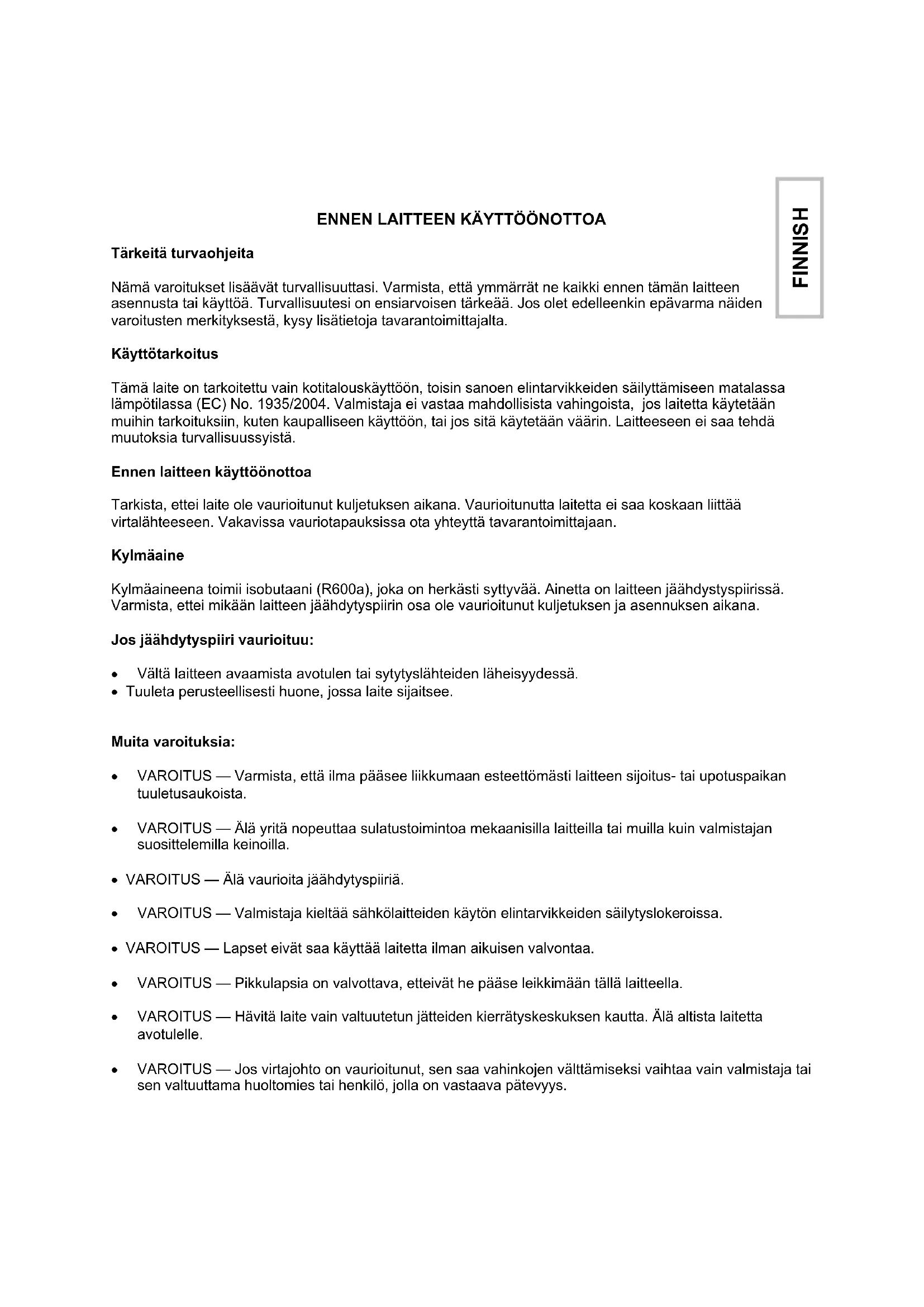 Tärkeitä turvaohjeita Nämä varoitukset lisäävät turvallisuuttasi. Varmista, että ymmärrät ne kaikki ennen tämän laitteen asennusta tai käyttöä. Turvallisuutesi on ensiarvoisen tärkeää. Jos olet edelleenkin epävarma näiden varoitusten merkityksestä, kysy lisätietoja tavarantoimittajalta. Käyttötarkoitus Tämä laite on tarkoitettu vain kotitalouskäyttöön, toisin sanoen elintarvikkeiden säilyttämiseen matalassa lämpötilassa (EC) No. 1935/2004. Valmistaja ei vastaa mahdollisista vahingoista, jos laitetta käytetään muihin tarkoituksiin, kuten kaupalliseen käyttöön, tai jos sitä käytetään väärin. Laitteeseen ei saa tehdä muutoksia turvallisuussyistä. Ennen laitteen käyttöönottoa Tarkista, ettei laite ole vaurioitunut kuljetuksen aikana. Vaurioitunutta laitetta ei saa koskaan liittää virtalähteeseen. Vakavissa vauriotapauksissa ota yhteyttä tavarantoimittajaan. Kylmäaine Kylmäaineena toimii isobutaani (R600a), joka on herkästi syttyvää. Ainetta on laitteen jäähdystyspiirissä. Varmista, ettei mikään laitteen jäähdytyspiirin osa ole vaurioitunut kuljetuksen ja asennuksen aikana. Jos jäähdytyspiiri vaurioituu: