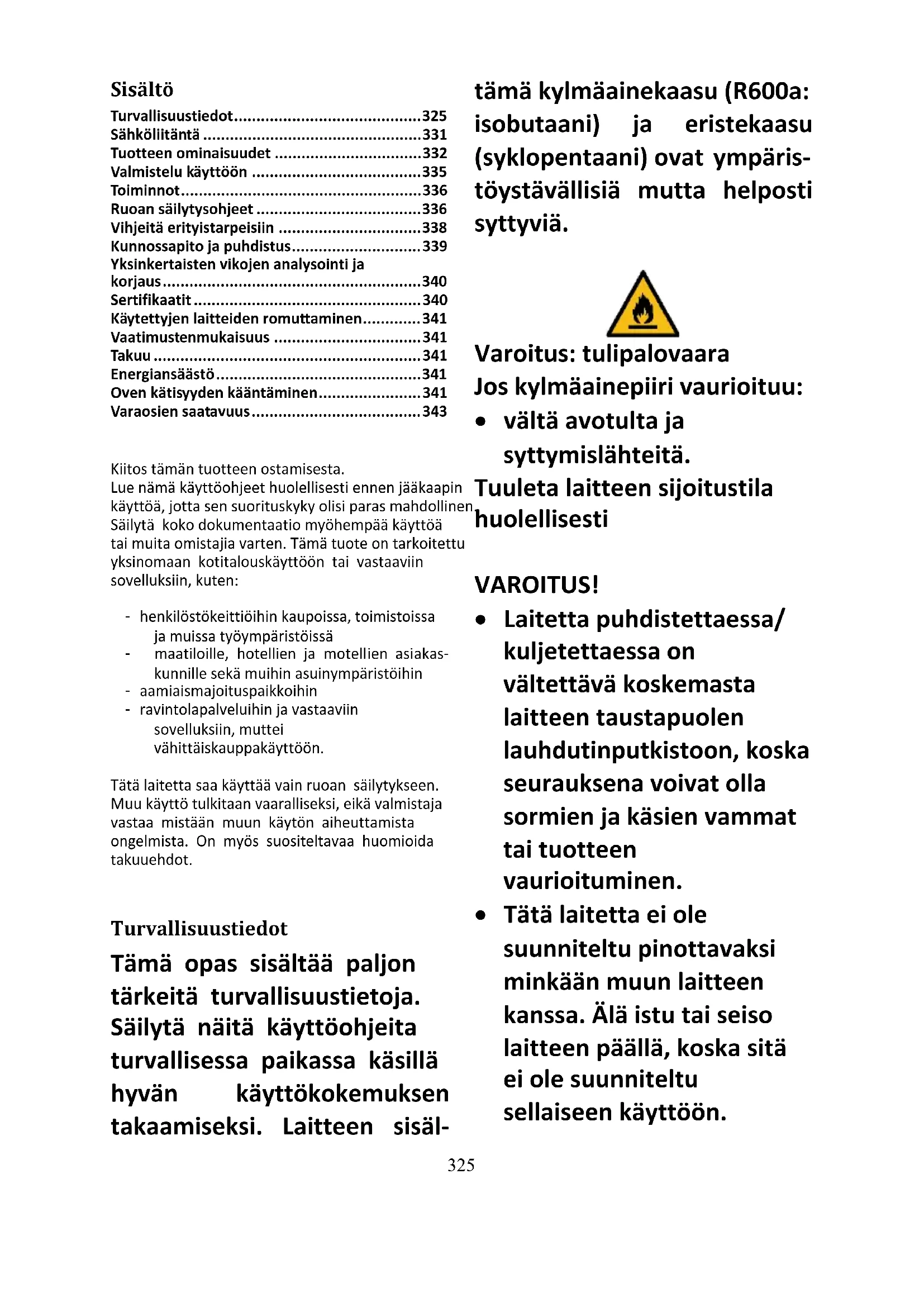 - Tätä laitetta saa käyttää vain käyttötarkoituksensa mukaisesti (eli syötävien elintarvikkeiden säilytykseen ja pakastamiseen).327
