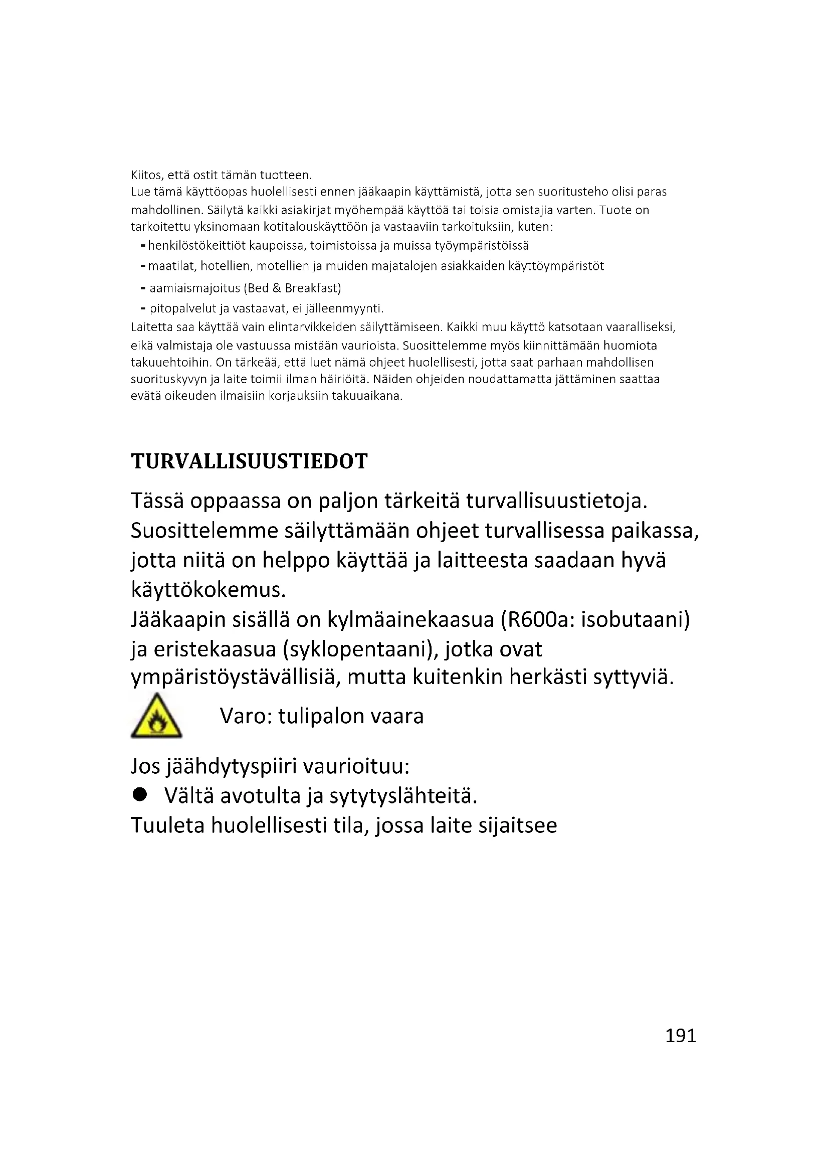- VIANMÄÄRITYS 91 Kiitos, että ostit tämän tuotteen. Lue tämä käyttöopas huolellisesti ennen jääkaapin käyttämistä, jotta sen suoritusteho olisi paras mahdollinen. Säilytä kaikki asiakirjat myöhempää käyttöä tai toisia omistajia varten. Tuote on tarkoitettu yksinomaan kotitalouskäyttöön ja vastaaviin tarkoituksiin, kuten: - henkilöstökeittiöt kaupoissa, toimistoissa ja muissa työympäristöissä - maatilat, hotellien, motellien ja muiden majatalojen asiakkaiden käyttöympäristöt - aamiaismajoitus (Bed & Breakfast) - pitopalvelut ja vastaavat, ei jälleenmyynti. Laitetta saa käyttää vain elintarvikkeiden säilyttämiseen. Kaikki muu käyttö katsotaan vaaralliseksi, eikä valmistaja ole vastuussa mistään vaurioista. Suosittelemme myös kiinnittämään huomiota takuuehtoihin. On tärkeää, että luet nämä ohjeet huolellisesti, jotta saat parhaan mahdollisen suorituskyvyn ja laite toimii ilman häiriöitä. Näiden ohjeiden noudattamatta jättäminen saattaa evätä oikeuden ilmaisiin korjauksiin takuuaikana. TURVALLISUUSTIEDOT Tässä oppaassa on paljon tärkeitä turvallisuustietoja. Suosittelemme säilyttämään ohjeet turvallisessa paikassa, jotta niitä on helppo käyttää ja laitteesta saadaan hyvä käyttökokemus. Jääkaapin sisällä on kylmäainekaasua (R600a: isobutaani) ja eristekaasua (syklopentaani), jotka ovat ympäristöystävällisiä, mutta kuitenkin herkästi syttyviä. p. 2061