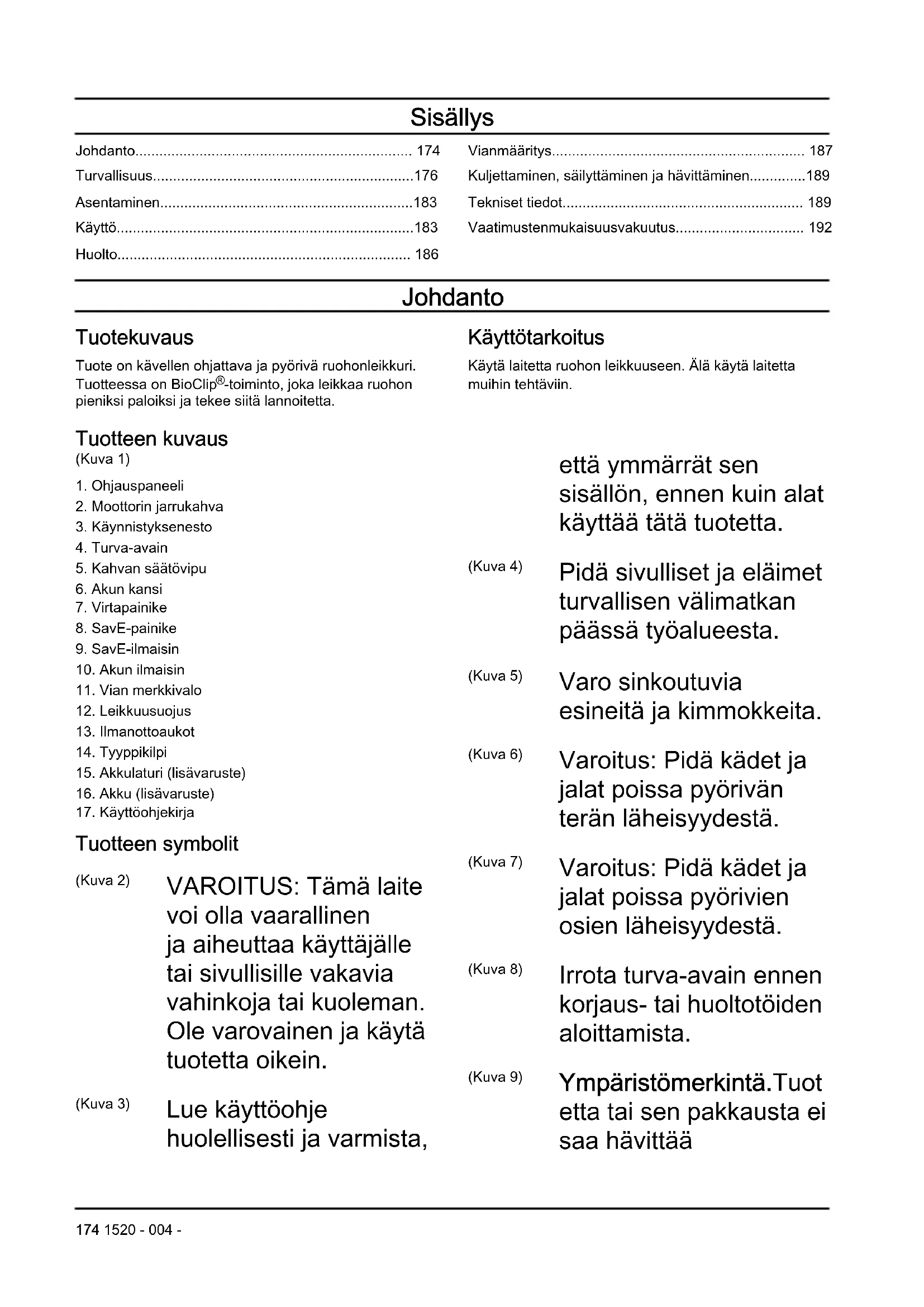 Tuotteen symbolit (Kuva 2) VAROITUS: Tämä laite voi olla vaarallinen ja aiheuttaa käyttäjälle tai sivullisille vakavia vahinkoja tai kuoleman. Ole varovainen ja käytä tuotetta oikein. (Kuva 3) Lue käyttöohje huolellisesti ja varmista, että ymmärrät sen sisällön, ennen kuin alat käyttää tätä tuotetta. (Kuva 4) Pidä sivulliset ja eläimet turvallisen välimatkan päässä työalueesta. (Kuva 5) Varo sinkoutuvia esineitä ja kimmokkeita. (Kuva 6) Varoitus: Pidä kädet ja jalat poissa pyörivän terän läheisyydestä. (Kuva 7) Varoitus: Pidä kädet ja jalat poissa pyörivien osien läheisyydestä. (Kuva 8) Irrota turva-avain ennen korjaus- tai huoltotöiden aloittamista. (Kuva 9) Ympäristömerkintä.Tuot etta tai sen pakkausta ei saa hävittää 174 1520 - 004 -kotitalousjätteen mukana. Vie se asianmukaiseen sähkö- ja elektroniikkalaitteiden keräyspisteeseen. (Kuva 10) Laite täyttää soveltuvien EY- direktiivien vaatimukset. (Kuva 11) Tämä tuote täyttää sovellettavien UK- säädösten vaatimukset. (Kuva 12) Laite täyttää soveltuvien Euraasian tulliliiton direktiivien vaatimukset. (Kuva 13) Laite täyttää soveltuvien UkrSEPRO-direktiivien vaatimukset. (Kuva 14) Laite täyttää soveltuvien RCM- direktiivien vaatimukset. Koskee ainoastaan Australiaa ja Uutta- Seelantia. (Kuva 15) Melupäästöt ympäristöön -tarra EU:n ja Yhdistyneen kuningaskunnan direktiivien ja säädösten mukaisesti sekä Uuden Etelä-Walesin "Protection of the Environment Operations (Noise Control) Regulation 2017" -asetuksen mukaisesti. Tuotteen taattu äänentehotaso on määritelty kohdassa Tekniset tiedot sivulla