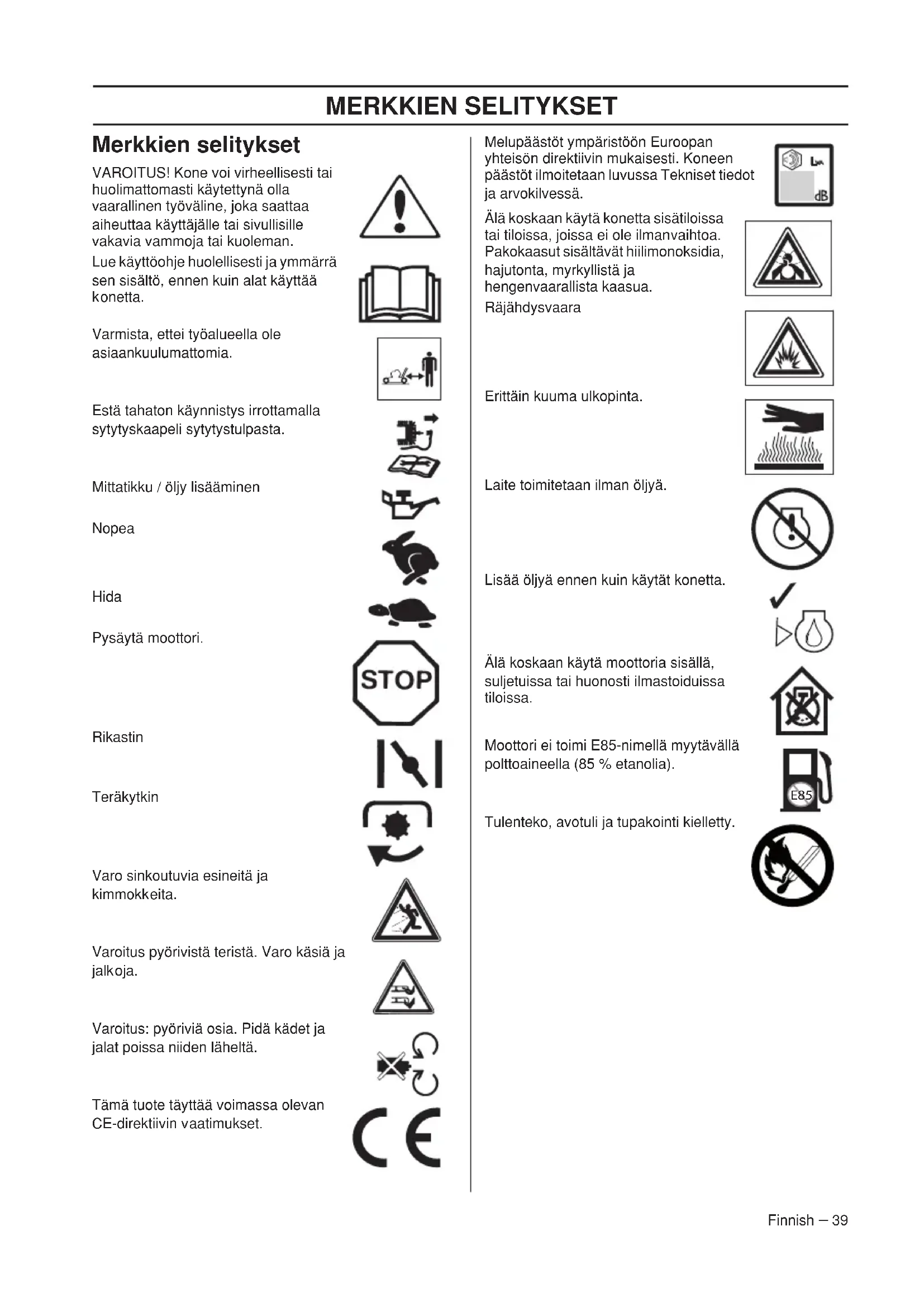 onetta. Varmista, ettei työalueella ole asiaankuulumattomia. Estä tahaton käynnistys irrottamalla sytytyskaapeli sytytystulpasta. Mittatikku / öljy lisääminen Nopea Hida Pysäytä moottori. Rikastin Teräkytkin Varo sinkoutuvia esineitä ja kimmokk eita. Varoitus pyörivistä teristä. Varo käsiä ja jalk oja. Varoitus: pyöriviä osia. Pidä kädet ja jalat poissa niiden läheltä. Tämä tuote täyttää voimassa olevan CE-direktiivin v aatimukset. Melupäästöt ympäristöön Euroopan yhteisön direktiivin m ukaisesti. Koneen päästöt ilmoitetaan luvussa Tekniset tiedot ja arvokilvessä. Älä koskaan käytä konetta sisätiloissa tai tiloissa, joissa ei ole ilman vaihtoa. Pakokaasut sisältävät hiilimonoksidia, hajutonta, myrkyllistä ja hengenvaarallista kaasua. Räjähdysvaara Erittäin kuuma ulkopinta. Laite toimitetaan ilman öljyä. Lisää öljyä ennen kuin käytät konetta. Älä koskaan käytä moottoria sisällä, suljetuissa tai huonosti ilmastoiduissa tiloissa. Moottori ei toimi E85-nimellä myytävällä polttoaineella (85 % etanolia). Tulenteko, avotuli ja tupakointi kielletty.