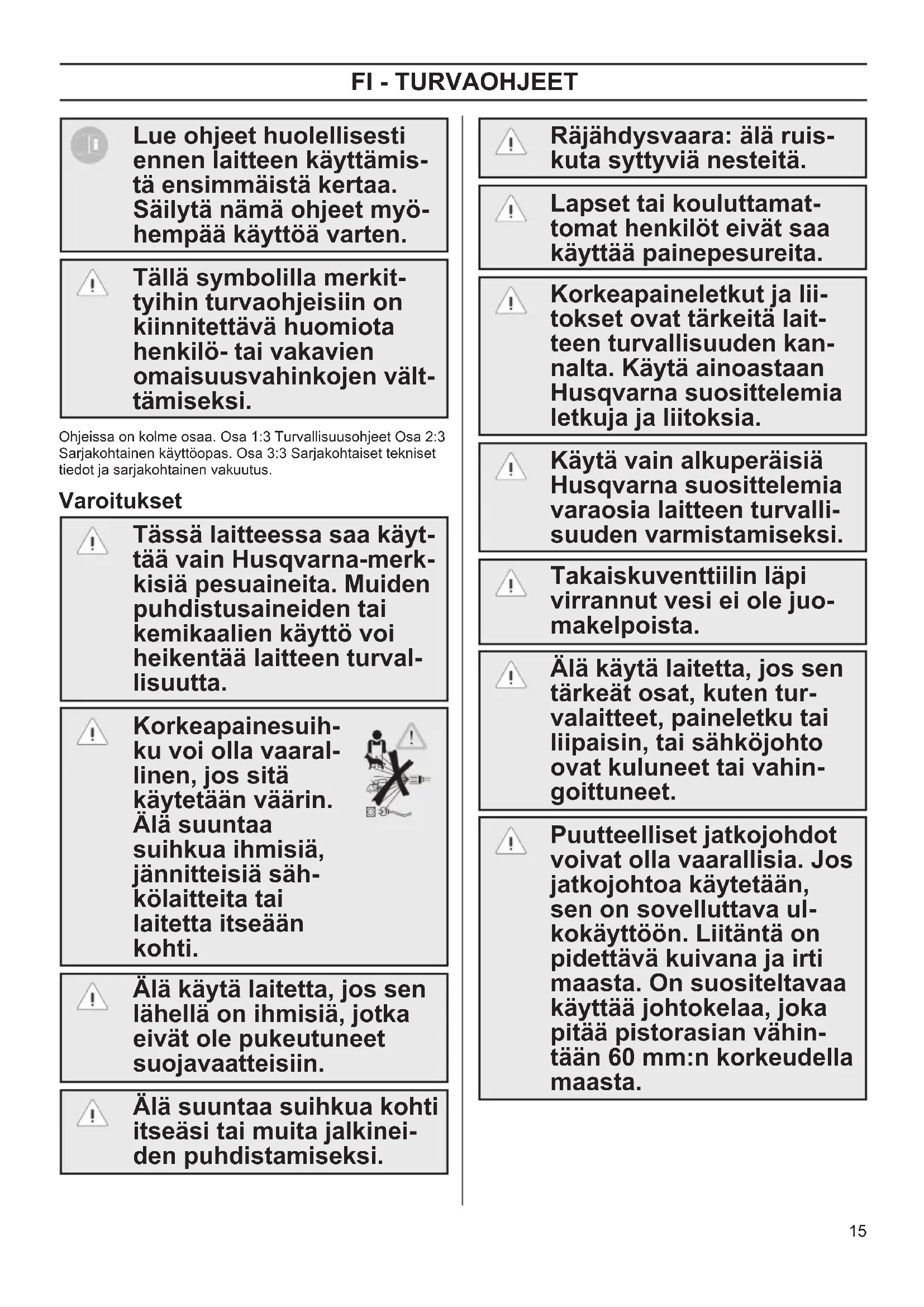 Lue ohjeet huolellisesti ennen laitteen käyttämis- tä ensimmäistä kertaa. Säilytä nämä ohjeet myö- hempää käyttöä varten. Tällä symbolilla merkit- tyihin turvaohjeisiin on kiinnitettävä huomiota henkilö- tai vakavien omaisuusvahinkojen vält- tämiseksi. Ohjeissa on kolme osaa. Osa 1:3 Turvallisuusohjeet Osa 2:3 Sarjakohtainen käyttöopas. Osa 3:3 Sarjakohtaiset tekniset tiedot ja sarjakohtainen vakuutus. Varoitukset Tässä laitteessa saa käyt- tää vain Husqvarna-merk- kisiä pesuaineita. Muiden puhdistusaineiden tai kemikaalien käyttö voi heikentää laitteen turval- lisuutta. Korkeapainesuih- ku voi olla vaaral- linen, jos sitä käytetään väärin. Älä suuntaa suihkua ihmisiä, jännitteisiä säh- kölaitteita tai laitetta itseään kohti. Älä käytä laitetta, jos sen lähellä on ihmisiä, jotka eivät ole pukeutuneet suojavaatteisiin. Älä suuntaa suihkua kohti itseäsi tai muita jalkinei- den puhdistamiseksi. Räjähdysvaara: älä ruis- kuta syttyviä nesteitä. Lapset tai kouluttamat- tomat henkilöt eivät saa käyttää painepesureita. Korkeapaineletkut ja lii- tokset ovat tärkeitä lait- teen turvallisuuden kan- nalta. Käytä ainoastaan Husqvarna suosittelemia letkuja ja liitoksia. Käytä vain alkuperäisiä Husqvarna suosittelemia varaosia laitteen turvalli- suuden varmistamiseksi. Takaiskuventtiilin läpi virrannut vesi ei ole juo- makelpoista. Älä käytä laitetta, jos sen tärkeät osat, kuten tur- valaitteet, paineletku tai liipaisin, tai sähköjohto ovat kuluneet tai vahin- goittuneet. Puutteelliset jatkojohdot voivat olla vaarallisia. Jos jatkojohtoa käytetään, sen on sovelluttava ul- kokäyttöön. Liitäntä on pidettävä kuivana ja irti maasta. On suositeltavaa käyttää johtokelaa, joka pitää pistorasian vähin- tään 60 mm:n korkeudella maasta. OM 1-3 Safety FINAL rev 1 draft.indd 15 2017-06-14 13:59:3116