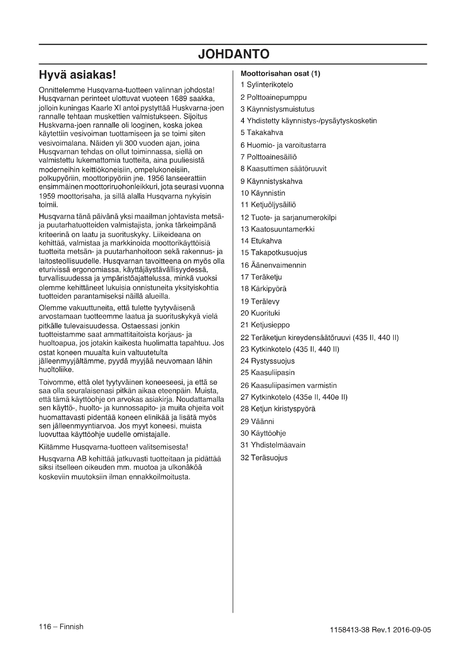 - EY-vaatimustenmukaisuusvakuutus JOHDANTO 116 – Finnish 1158413-38 Rev.1 2016-09-05 Hyvä asiakas! Onnittelemme Husqvarna-tuotteen valinnan johdosta! Husqvarnan perinteet ulottuvat vuoteen 1689 saakka, jolloin kuningas Kaarle XI antoi pystyttää Huskvarna-joen rannalle tehtaan muskettien valmistukseen. Sijoitus Huskvarna-joen rannalle oli looginen, koska jokea käytettiin vesivoiman tuottamiseen ja se toimi siten vesivoimalana. Näiden yli 300 vuoden ajan, joina Husqvarnan tehdas on ollut toiminnassa, siellä on valmistettu lukemattomia tuotteita, aina puuliesistä moderneihin keittiökoneisiin, ompelukoneisiin, polkupyöriin, moottoripyöriin jne. 1956 lanseerattiin ensimmäinen moottoriruohonleikkuri, jota seurasi vuonna 1959 moottorisaha, ja sillä alalla Husqvarna nykyisin toimii. Husqvarna tänä päivänä yksi maailman johtavista metsä- ja puutarhatuotteiden valmistajista, jonka tärkeimpänä kriteerinä on laatu ja suorituskyky. Liikeideana on kehittää, valmistaa ja markkinoida moottorikäyttöisiä tuotteita metsän- ja puutarhanhoitoon sekä rakennus- ja laitosteollisuudelle. Husqvarnan tavoitteena on myös olla eturivissä ergonomiassa, käyttäjäystävällisyydessä, turvallisuudessa ja ympäristöajattelussa, minkä vuoksi olemme kehittäneet lukuisia onnistuneita yksityiskohtia tuotteiden parantamiseksi näillä alueilla. Olemme vakuuttuneita, että tulette tyytyväisenä arvostamaan tuotteemme laatua ja suorituskykyä vielä pitkälle tulevaisuudessa. Ostaessasi jonkin tuotteistamme saat ammattitaitoista korjaus- ja huoltoapua, jos jotakin kaikesta huolimatta tapahtuu. Jos ostat koneen muualta kuin valtuutetulta jälleenmyyjältämme, pyydä myyjää neuvomaan lähin huoltoliike. Toivomme, että olet tyytyväinen koneeseesi, ja että se saa olla seuralaisenasi pitkän aikaa eteenpäin. Muista, että tämä käyttöohje on arvokas asiakirja. Noudattamalla sen käyttö-, huolto- ja kunnossapito- ja muita ohjeita voit huomattavasti pidentää koneen elinikää ja lisätä myös sen jälleenmyyntiarvoa. Jos myyt koneesi, muista luovuttaa käyttöohje uudelle omistajalle. Kiitämme Husqvarna-tuotteen valitsemisesta! Husqvarna AB kehittää jatkuvasti tuotteitaan ja pidättää siksi itselleen oikeuden mm. muotoa ja ulkonäköä koskeviin muutoksiin ilman ennakkoilmoitusta. Moottorisahan osat (1) 1 Sylinterikotelo 2 Polttoainepumppu 3 Käynnistysmuistutus 4 Yhdistetty käynnistys-/pysäytyskosketin 5 Takakahva 6 Huomio- ja varoitustarra 7 Polttoainesäiliö 8 Kaasuttimen säätöruuvit 9 Käynnistyskahva 10 Käynnistin 11 Ketjuöljysäiliö 12 Tuote- ja sarjanumerokilpi 13 Kaatosuuntamerkki 14 Etukahva 15 Takapotkusuojus 16 Äänenvaimennin 17 Teräketju 18 Kärkipyörä 19 Terälevy 20 Kuorituki 21 Ketjusieppo 22 Teräketjun kireydensäätöruuvi (435 II, 440 II) 23 Kytkinkotelo (435 II, 440 II) 24 Rystyssuojus 25 Kaasuliipasin 26 Kaasuliipasimen varmistin 27 Kytkinkotelo (435e II, 440e II) 28 Ketjun kiristyspyörä 29 Väänni 30 Käyttöohje 31 Yhdistelmäavain 32 TeräsuojusYLEISET TURVAOHJEET Finnish – 117 1158413-38 Rev.1 2016-09-05 Toimenpiteet ennen uuden moottorisahan käyttöä p. 142