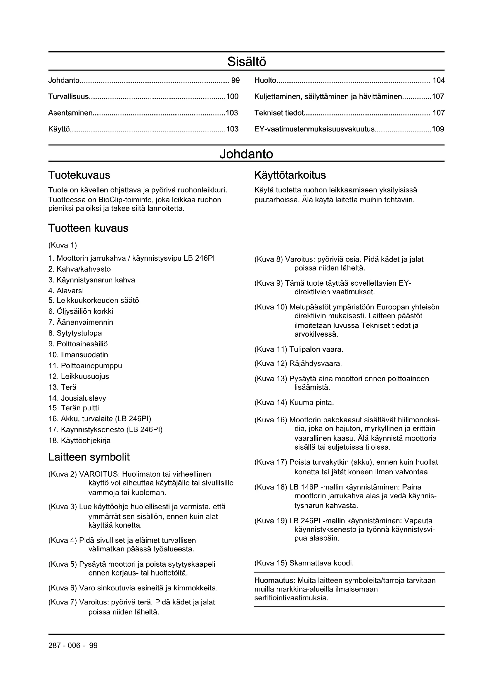 Laitteen symbolit (Kuva 2) VAROITUS: Huolimaton tai virheellinen käyttö voi aiheuttaa käyttäjälle tai sivullisille vammoja tai kuoleman. (Kuva 3) Lue käyttöohje huolellisesti ja varmista, että ymmärrät sen sisällön, ennen kuin alat käyttää konetta. (Kuva 4) Pidä sivulliset ja eläimet turvallisen välimatkan päässä työalueesta. (Kuva 5) Pysäytä moottori ja poista sytytyskaapeli ennen korjaus- tai huoltotöitä. (Kuva 6) Varo sinkoutuvia esineitä ja kimmokkeita. (Kuva 7) Varoitus: pyörivä terä. Pidä kädet ja jalat poissa niiden läheltä. (Kuva 8) Varoitus: pyöriviä osia. Pidä kädet ja jalat poissa niiden läheltä. (Kuva 9) Tämä tuote täyttää sovellettavien EY- direktiivien vaatimukset. (Kuva 10) Melupäästöt ympäristöön Euroopan yhteisön direktiivin mukaisesti. Laitteen päästöt ilmoitetaan luvussa Tekniset tiedot ja arvokilvessä. (Kuva 11) Tulipalon vaara. (Kuva 12) Räjähdysvaara. (Kuva 13) Pysäytä aina moottori ennen polttoaineen lisäämistä. (Kuva 14) Kuuma pinta. (Kuva 16) Moottorin pakokaasut sisältävät hiilimonoksi- dia, joka on hajuton, myrkyllinen ja erittäin vaarallinen kaasu. Älä käynnistä moottoria sisällä tai suljetuissa tiloissa. (Kuva 17) Poista turvakytkin (akku), ennen kuin huollat konetta tai jätät koneen ilman valvontaa. (Kuva 18) LB 146P -mallin käynnistäminen: Paina moottorin jarrukahva alas ja vedä käynnis- tysnarun kahvasta. (Kuva 19) LB 246PI -mallin käynnistäminen: Vapauta käynnistyksenesto ja työnnä käynnistysvi- pua alaspäin. (Kuva 15) Skannattava koodi. Huomautus: Muita laitteen symboleita/tarroja tarvitaan muilla markkina-alueilla ilmaisemaan sertifiointivaatimuksia.