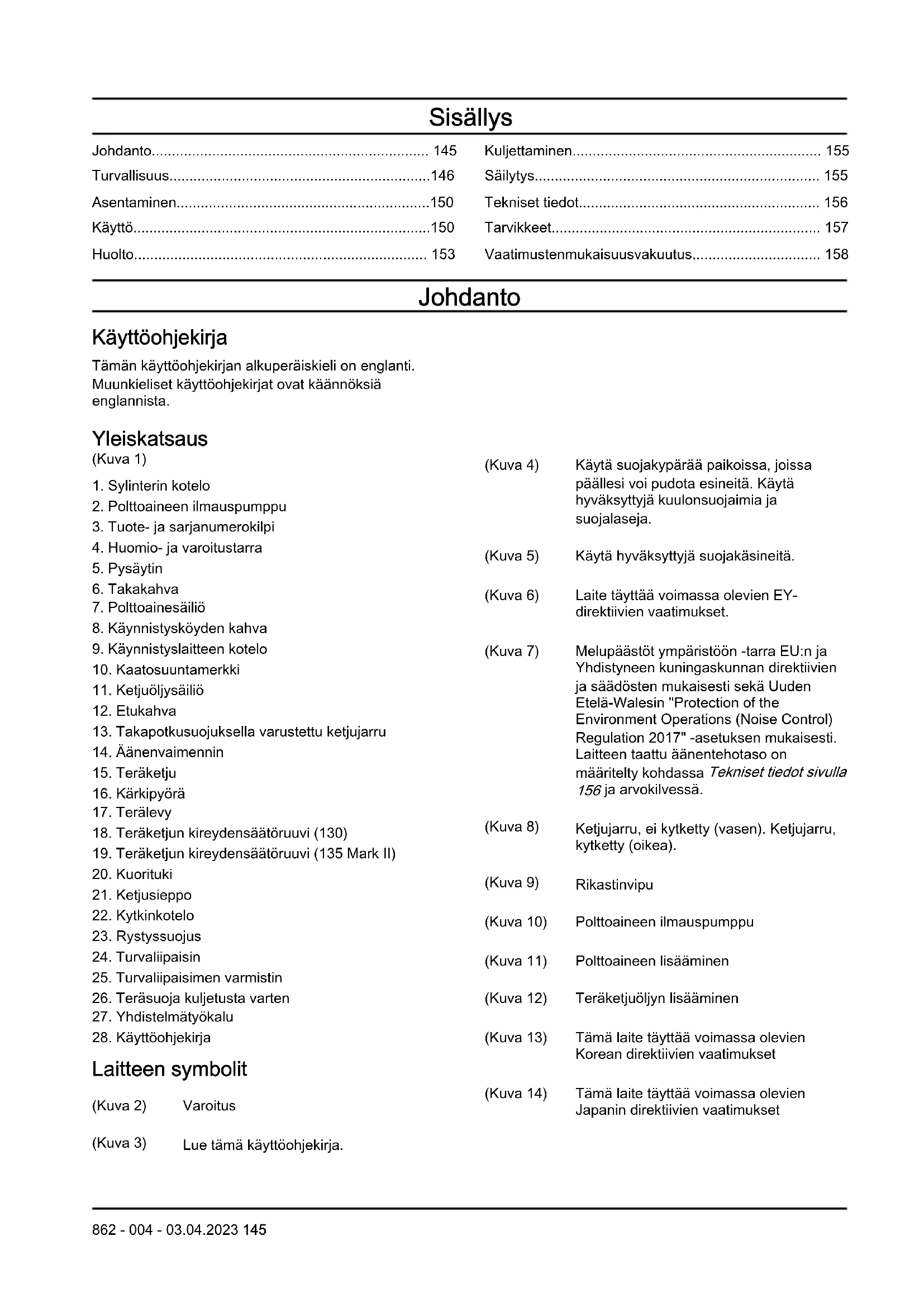 - Älä käytä laitetta, jos sen alkuperäisiä ominaisuuksia on muutettu. Älä muuta edes osaa laitteesta ilman valmistajan lupaa. Käytä vain valmistajan hyväksymiä osia. Virheellinen huolto voi aiheuttaa tapaturman tai kuoleman. 146 862 - 004 - 03.04.2023• Älä hengitä moottorin pakokaasuja. Pakokaasujen, teräketjuöljysumun ja sahanpurupölyn pitkäaikainen sisäänhengittäminen voi olla terveydelle vaarallista.