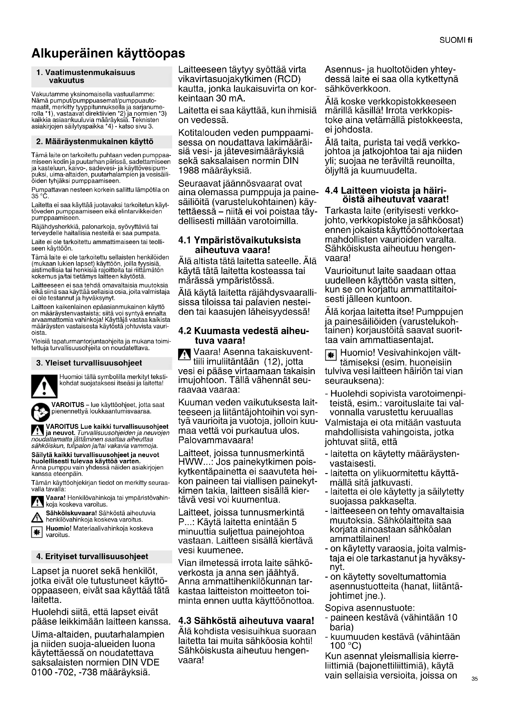 Alkuperäinen käyttöopas Vakuutamme yksinomaisella vastuullamme: Nämä pumput/pumppuasemat/pumppuauto- maatit, merkitty tyyppitunnuksella ja sarjanume- rolla *1), vastaavat direktiivien *2) ja normien *3) kaikkia asiaankuuluvia määräyksiä. Teknisten asiakirjojen säilytyspaikka *4) - katso sivu 3. Tämä laite on tarkoitettu puhtaan veden pumppaa- miseen kodin ja puutarhan piirissä, sadettamiseen ja kasteluun, kaivo-, sadevesi- ja käyttövesipum- puksi, uima-altaiden, puutarhalampien ja vesisäili- öiden tyhjäksi pumppaamiseen. Pumpattavan nesteen korkein sallittu lämpötila on 35 °C. Laitetta ei saa käyttää juotavaksi tarkoitetun käyt- töveden pumppaamiseen eikä elintarvikkeiden pumppaamiseen. Räjähdysherkkiä, palonarkoja, syövyttäviä tai terveydelle haitallisia nesteitä ei saa pumpata. Laite ei ole tarkoitettu ammattimaiseen tai teolli- seen käyttöön. Tämä laite ei ole tarkoitettu sellaisten henkilöiden (mukaan lukien lapset) käyttöön, joilla fyysisiä, aistimellisia tai henkisiä rajoitteita tai riittämätön kokemus ja/tai tietämys laitteen käytöstä. Laitteeseen ei saa tehdä omavaltaisia muutoksia eikä siinä saa käyttää sellaisia osia, joita valmistaja ei ole testannut ja hyväksynyt. Laitteen kaikenlainen epäasianmukainen käyttö on määräystenvastaista; siitä voi syntyä ennalta arvaamattomia vahinkoja! Käyttäjä vastaa kaikista määräysten vastaisesta käytöstä johtuvista vauri- oista. Yleisiä tapaturmantorjuntaohjeita ja mukana toimi- tettuja turvallisuusohjeita on noudatettava. Huomioi tällä symbolilla merkityt teksti- kohdat suojataksesi itseäsi ja laitetta! VAROITUS – lue käyttöohjeet, jotta saat pienennettyä loukkaantumisvaaraa. VAROITUS Lue kaikki turvallisuusohjeet ja neuvot. Turvallisuusohjeiden ja neuvojen noudattamatta jättäminen saattaa aiheuttaa sähköiskun, tulipalon ja/tai vakavia vammoja. Säilytä kaikki turvallisuusohjeet ja neuvot huolellisesti tulevaa käyttöä varten. Anna pumppu vain yhdessä näiden asiakirjojen kanssa eteenpäin. Tämän käyttöohjekirjan tiedot on merkitty seuraa- valla tavalla: Vaara! Henkilövahinkoja tai ympäristövahin- koja koskeva varoitus. Sähköiskuvaara! Sähköstä aiheutuvia henkilövahinkoja koskeva varoitus. Huomio! Materiaalivahinkoja koskeva varoitus. Lapset ja nuoret sekä henkilöt, jotka eivät ole tutustuneet käyttö- oppaaseen, eivät saa käyttää tätä laitetta. Huolehdi siitä, että lapset eivät pääse leikkimään laitteen kanssa. Uima-altaiden, puutarhalampien ja niiden suoja-alueiden luona käytettäessä on noudatettava saksalaisten normien DIN VDE 0100 -702, -738 määräyksiä. Laitteeseen täytyy syöttää virta vikavirtasuojakytkimen (RCD) kautta, jonka laukaisuvirta on kor- keintaan 30 mA. Laitetta ei saa käyttää, kun ihmisiä on vedessä. Kotitalouden veden pumppaami- sessa on noudattava lakimääräi- siä vesi- ja jätevesimääräyksiä sekä saksalaisen normin DIN 1988 määräyksiä. Seuraavat jäännösvaarat ovat aina olemassa pumppuja ja paine- säiliöitä (varustelukohtainen) käy- tettäessä – niitä ei voi poistaa täy- dellisesti millään varotoimilla.