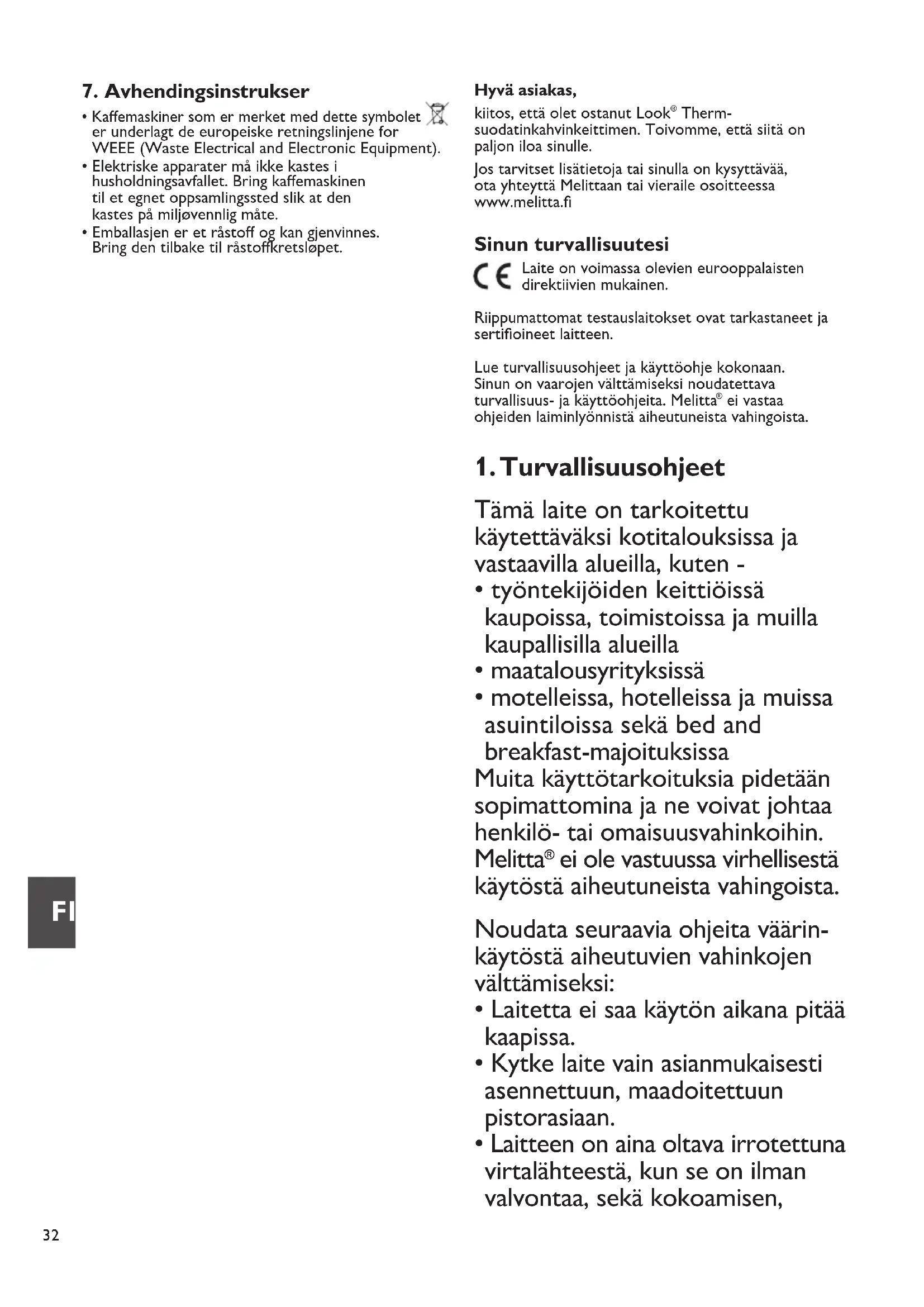 Laite on voimassa olevien eurooppalaisten direktiivien mukainen. Riippumattomat testauslaitokset ovat tarkastaneet ja sertifioineet laitteen. Lue turvallisuusohjeet ja käyttöohje kokonaan. Sinun on vaarojen välttämiseksi noudatettava turvallisuus- ja käyttöohjeita. Melitta