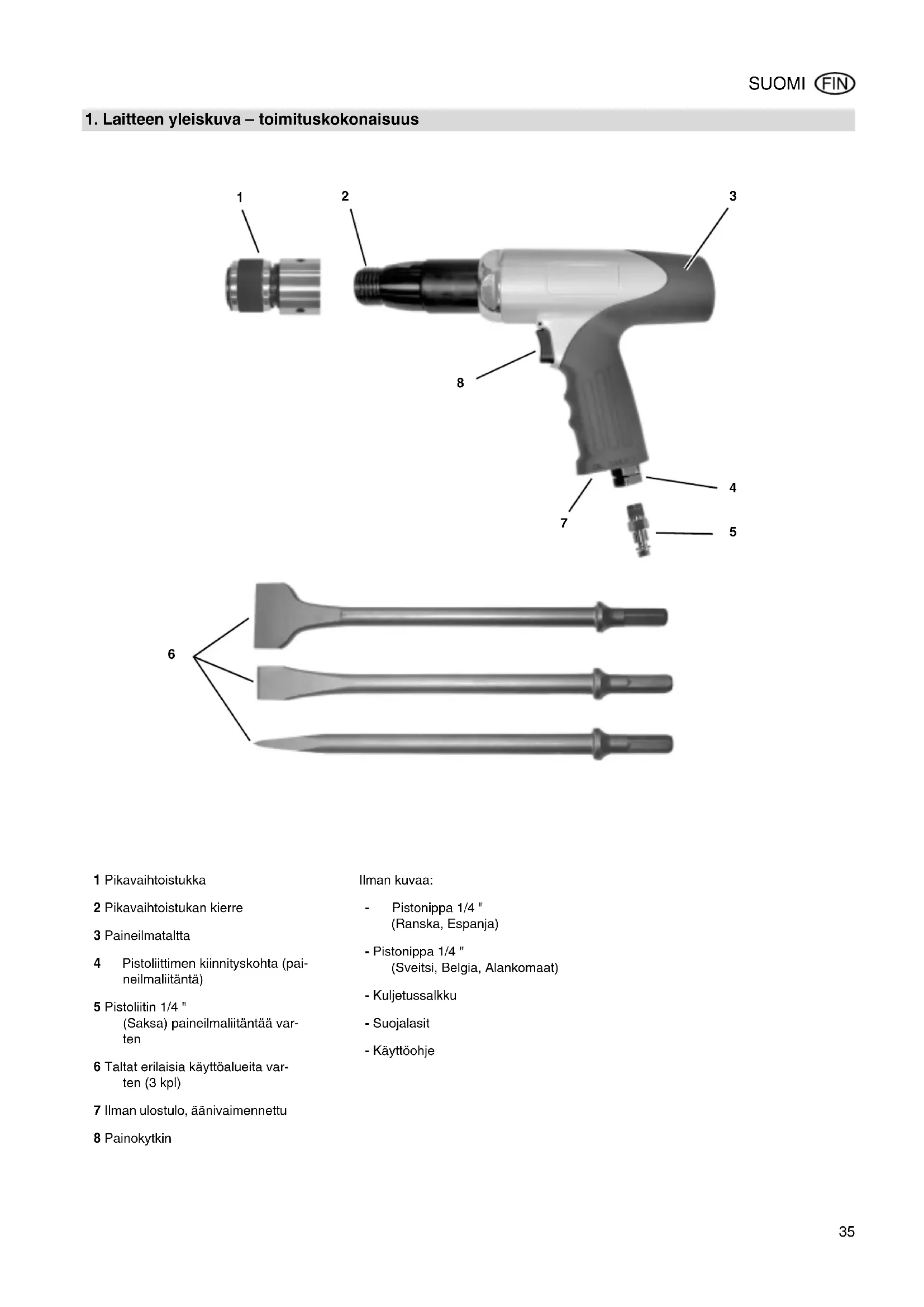 1 Pikavaihtoistukka 2 Pikavaihtoistukan kierre 3 Paineilmataltta 4 Pistoliittimen kiinnityskohta (pai- neilmaliitäntä) 5 Pistoliitin 1/4 " (Saksa) paineilmaliitäntää var- ten 6 Taltat erilaisia käyttöalueita var- ten (3 kpl) 7 Ilman ulostulo, äänivaimennettu 8 Painokytkin Ilman kuvaa: - Pistonippa 1/4 " (Ranska, Espanja) - Pistonippa 1/4 " (Sveitsi, Belgia, Alankomaat) - Kuljetussalkku - Suojalasit - Käyttöohje XK0044B2.fm Alkuperäiskäyttöohje SUOMI36 SUOMI