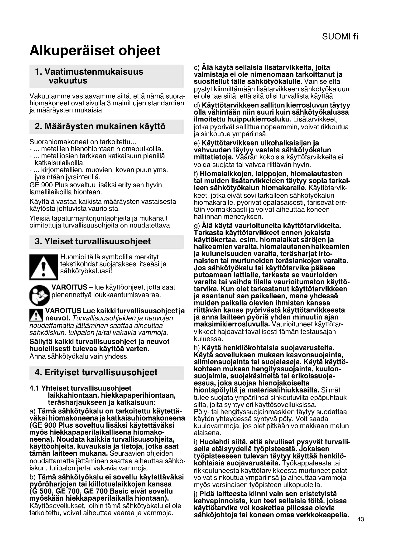 Suorahiomakoneet on tarkoitettu... - ... metallien hienohiontaan hiomapu ikoilla. - ... metalliosien tarkkaan katkaisuun pienillä katkaisulaikoilla. - ... kirjometallien, muovien, kovan puun yms. jyr sintään jyrsinterillä. GE 900 Plus soveltuu lisäksi erityisen hyvin lamellilaikoilla hiontaan. Käyttäjä vastaa kaikista määr äysten vastaisesta käytöstä johtuvista vaurioista. Yleisiä tapaturmantorjuntao hjeita ja mukana t oimitettuja turvallisuusohjeita on noudatettava.