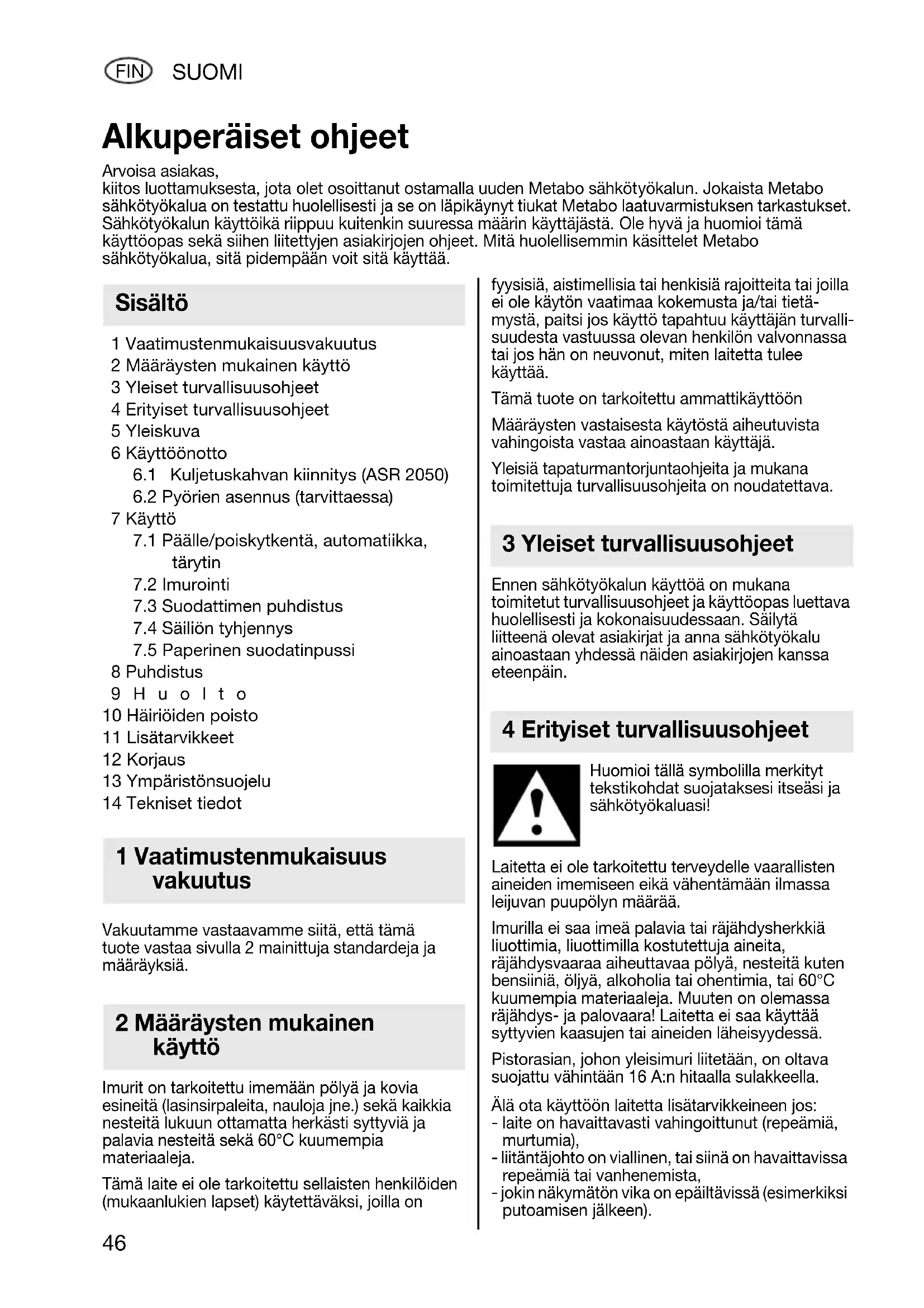 8 Puhdistus 9Huolto 10 Häiriöiden poisto 11 Lisätarvikkeet 12 Korjaus 13 Ympäristönsuojelu 14 Tekniset tiedot Vakuutamme vastaavamme siitä, että tämä tuote vastaa sivulla 2 mainittuja standardeja ja määräyksiä. Imurit on tarkoitettu imemään pölyä ja kovia esineitä (lasinsirpaleita, nauloja jne.) sekä kaikkia nesteitä lukuun ottamatta herkästi syttyviä ja palavia nesteitä sekä 60°C kuumempia materiaaleja. Tämä laite ei ole tarkoitettu sellaisten henkilöiden (mukaanlukien lapset) käytettäväksi, joilla on fyysisiä, aistimellisia tai henkisiä rajoitteita tai joilla ei ole käytön vaatimaa kokemusta ja/tai tietä- mystä, paitsi jos käyttö tapahtuu käyttäjän turvalli- suudesta vastuussa olevan henkilön valvonnassa tai jos hän on neuvonut, miten laitetta tulee käyttää. Tämä tuote on tarkoitettu ammattikäyttöön Määräysten vastaisesta käytöstä aiheutuvista vahingoista vastaa ainoastaan käyttäjä. Yleisiä tapaturmantorjuntaohjeita ja mukana toimitettuja turvallisuusohjeita on noudatettava. Ennen sähkötyökalun käyttöä on mukana toimitetut turvallisuusohjeet ja käyttöopas luettava huolellisesti ja kokonaisuudessaan. Säilytä liitteenä olevat asiakirjat ja anna sähkötyökalu ainoastaan yhdessä näiden asiakirjojen kanssa eteenpäin. Huomioi tällä symbolilla merkityt tekstikohdat suojataksesi itseäsi ja sähkötyökaluasi! Laitetta ei ole tarkoitettu terveydelle vaarallisten aineiden imemiseen eikä vähentämään ilmassa leijuvan puupölyn määrää. Imurilla ei saa imeä palavia tai räjähdysherkkiä liuottimia, liuottimilla kostutettuja aineita, räjähdysvaaraa aiheuttavaa pölyä, nesteitä kuten bensiiniä, öljyä, alkoholia tai ohentimia, tai 60°C kuumempia materiaaleja. Muuten on olemassa räjähdys- ja palovaara! Laitetta ei saa käyttää syttyvien kaasujen tai aineiden läheisyydessä. Pistorasian, johon yleisimuri liitetään, on oltava suojattu vähintään 16 A:n hitaalla sulakkeella. Älä ota käyttöön laitetta lisätarvikkeineen jos: - laite on havaittavasti vahingoittunut (repeämiä, murtumia), - liitäntäjohto on viallinen, tai siinä on havaittavissa repeämiä tai vanhenemista, - jokin näkymätön vika on epäiltävissä (esimerkiksi putoamisen jälkeen). Alkuperäiset ohjeet Arvoisa asiakas, kiitos luottamuksesta, jota olet osoittanut ostamalla uuden Metabo sähkötyökalun. Jokaista Metabo sähkötyökalua on testattu huolellisesti ja se on läpikäynyt tiukat Metabo laatuvarmistuksen tarkastukset. Sähkötyökalun käyttöikä riippuu kuitenkin suuressa määrin käyttäjästä. Ole hyvä ja huomioi tämä käyttöopas sekä siihen liitettyjen asiakirjojen ohjeet. Mitä huolellisemmin käsittelet Metabo sähkötyökalua, sitä pidempään voit sitä käyttää. Sisältö 1 Vaatimustenmukaisuus vakuutus 2 Määräysten mukainen käyttö 3 Yleiset turvallisuusohjeet 4 Erityiset turvallisuusohjeet 17026696_0810 ASR 2025 und ASR 2050.book Seite 46 Mittwoch, 18. August 2010 5:10 17SUOMI
