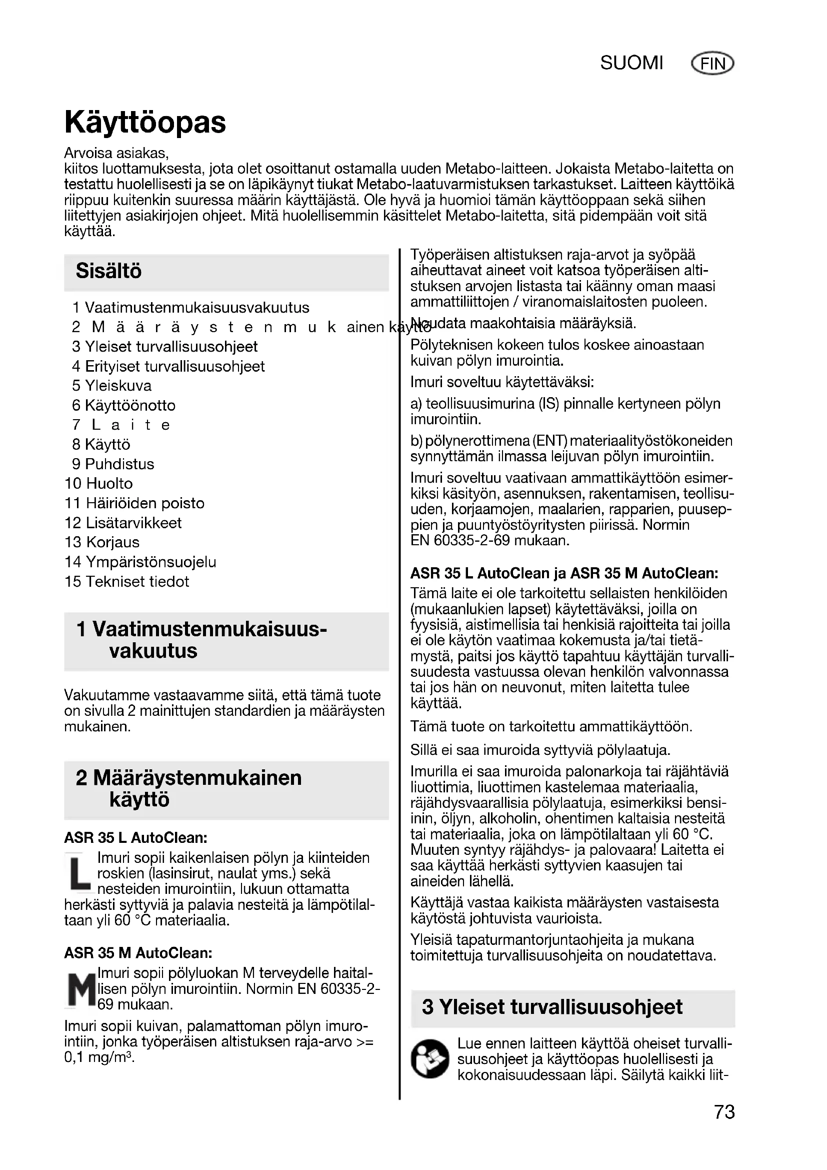 FIN 1 Vaatimustenmukaisuusvakuutus 2Määräystenmukainen käyttö 3 Yleiset turvallisuusohjeet 4 Erityiset turvallisuusohjeet 5 Yleiskuva 6 Käyttöönotto 7Laite 8 Käyttö 9 Puhdistus 10 Huolto 11 Häiriöiden poisto 12 Lisätarvikkeet 13 Korjaus 14 Ympäristönsuojelu 15 Tekniset tiedot Vakuutamme vastaavamme siitä, että tämä tuote on sivulla 2 mainittujen standardien ja määräysten mukainen. ASR 35 L AutoClean: Imuri sopii kaikenlaisen pölyn ja kiinteiden roskien (lasinsirut, naulat yms.) sekä nesteiden imurointiin, lukuun ottamatta herkästi syttyviä ja palavia nesteitä ja lämpötilal- taan yli 60 °C materiaalia. ASR 35 M AutoClean: Imuri sopii pölyluokan M terveydelle haital- lisen pölyn imurointiin. Normin EN 60335-2- 69 mukaan. Imuri sopii kuivan, palamattoman pölyn imuro- intiin, jonka työperäisen altistuksen raja-arvo >= 0,1 mg/m³. Työperäisen altistuksen raja-arvot ja syöpää aiheuttavat aineet voit katsoa työperäisen alti- stuksen arvojen listasta tai käänny oman maasi ammattiliittojen / viranomaislaitosten puoleen. Noudata maakohtaisia määräyksiä. Pölyteknisen kokeen tulos koskee ainoastaan kuivan pölyn imurointia. Imuri soveltuu käytettäväksi: a) teollisuusimurina (IS) pinnalle kertyneen pölyn imurointiin. b) pölynerottimena (ENT) materiaalityöstökoneiden synnyttämän ilmassa leijuvan pölyn imurointiin. Imuri soveltuu vaativaan ammattikäyttöön esimer- kiksi käsityön, asennuksen, rakentamisen, teollisu- uden, korjaamojen, maalarien, rapparien, puusep- pien ja puuntyöstöyritysten piirissä. Normin EN 60335-2-69 mukaan. ASR 35 L AutoClean ja ASR 35 M AutoClean: Tämä laite ei ole tarkoitettu sellaisten henkilöiden (mukaanlukien lapset) käytettäväksi, joilla on fyysisiä, aistimellisia tai henkisiä rajoitteita tai joilla ei ole käytön vaatimaa kokemusta ja/tai tietä- mystä, paitsi jos käyttö tapahtuu käyttäjän turvalli- suudesta vastuussa olevan henkilön valvonnassa tai jos hän on neuvonut, miten laitetta tulee käyttää. Tämä tuote on tarkoitettu ammattikäyttöön. Sillä ei saa imuroida syttyviä pölylaatuja. Imurilla ei saa imuroida palonarkoja tai räjähtäviä liuottimia, liuottimen kastelemaa materiaalia, räjähdysvaarallisia pölylaatuja, esimerkiksi bensi- inin, öljyn, alkoholin, ohentimen kaltaisia nesteitä tai materiaalia, joka on lämpötilaltaan yli 60 °C. Muuten syntyy räjähdys- ja palovaara! Laitetta ei saa käyttää herkästi syttyvien kaasujen tai aineiden lähellä. Käyttäjä vastaa kaikista määräysten vastaisesta käytöstä johtuvista vaurioista. Yleisiä tapaturmantorjuntaohjeita ja mukana toimitettuja turvallisuusohjeita on noudatettava. Lue ennen laitteen käyttöä oheiset turvalli- suusohjeet ja käyttöopas huolellisesti ja kokonaisuudessaan läpi. Säilytä kaikki liit- Käyttöopas Arvoisa asiakas, kiitos luottamuksesta, jota olet osoittanut ostamalla uuden Metabo-laitteen. Jokaista Metabo-laitetta on testattu huolellisesti ja se on läpikäynyt tiukat Metabo-laatuvarmistuksen tarkastukset. Laitteen käyttöikä riippuu kuitenkin suuressa määrin käyttäjästä. Ole hyvä ja huomioi tämän käyttöoppaan sekä siihen liitettyjen asiakirjojen ohjeet. Mitä huolellisemmin käsittelet Metabo-laitetta, sitä pidempään voit sitä käyttää. Sisältö 1 Vaatimustenmukaisuus- vakuutus 2 Määräystenmukainen käyttö 3 Yleiset turvallisuusohjeet 17027067_0711 ASR 35 L_M AutoClean ENTWURF.book Seite 73 Montag, 25. Juli 2011 4:46 1674 SUOMI FIN teenä olevat asiakirjat ja anna laite ainoastaan yhdessä näiden asiakirjojen kanssa eteenpäin. Ennen käytön aloittamista laitteen käyttäjille on annettava laitteen käyttöön ja sillä imuroitaviin aineisiin liittyvät tiedot, ohjeet ja koulutus, mukaan lukien ohjeet imuroidun mate- riaalin turvallisesta hävittämisestä. Huomioi tällä symbolilla merkityt teksti- kohdat suojataksesi itseäsi ja laitetta! Älä missään tapauksessa anna lasten käyttää laitetta. Huolehdi siitä, että lapset eivät pääse leikkimään koneen kanssa. Huomio! Käytä vain laitteen mukana olevia tai käyttöoppaassa määritettyjä lisätarvikkeita. Muun- laisten lisätarvikkeiden käyttäminen voi vaarantaa turvallisuuden. Muita kuin tässä mainittuja töitä ei saa tehdä. Emme vastaa käyttötarkoituksen vastaisen käytön, epäasianmukaisen käytön tai ammatti- taidottoman korjauksen aiheuttamista vahingoista. Kun laitetta ei käytetä, jätä letku laitteeseen kiinni, jotta pölyä ei pääse tahattomasti ulos. Mallissa ASR 35 M AutoClean sulje imuaukko (14) sulkutul- palla (13), kytke letkunpäät yhteen, jotta pölyä ei pääse ulos. Älä ota laitteita eikä niiden lisätarvikkeita käyttöön, jos: - laitteessa on näkyviä vaurioita (halkeamia/ murtumia), - verkkoliitäntäjohto on viallinen, tai jos siinä näkyy halkeamia tai vanhenemisen aiheuttamia haura- stumia, - epäilet siinä olevan piilossa olevia vikoja (laitteen putoamisen jälkeen). Älä kohdista suulaketta, letkua eikä putkea ihmisiä tai eläimiä kohti. Kytke välittömästi pois toiminnasta, jos lait- teesta tulee ulos vaahtoa tai vettä. Tyhjennä säiliö ja tarvittaessa laskossuodatin. Älä missään tapauksessa kiipeä laitteen päälle tai istu sillä. Pidä liitäntäjohtoa ja letkua aina niin, että ne eivät aiheuta kompastumisvaaraa. Älä vedä liitäntäjohtoa terävien reunojen yli, älä taita sitä äläkä jätä sitä puristuksiin. Jos laitteen liitäntäjohto vaurioituu, se täytyy korvata erityisellä liitäntäjohdolla. Katso luku Korjaus. Kytke vain sellaiseen pistorasiaan, joka on varu- stettu suojakoskettimella. Älä käytä vaurioitunutta jatkojohtoa. Älä missään tapauksessa kiinnitä tai irrota verkko- pistoketta märin käsin. Kun irrotat pistokkeen pistorasiasta, vedä aina vain verkkopistokkeesta, ei missään tapauksessa johdosta. Laitteen pistorasiaa saa käyttää vain käyttöoh- jeissa määritettyihin tarkoituksiin. 